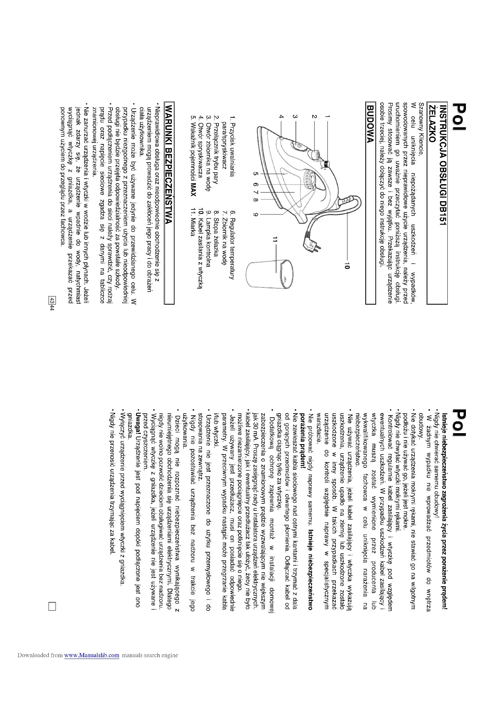 - Włóż wtyczkę do sieci, następnie ustaw odpowiednią temperaturę przekręcając regulator temperatury w kierunku zgodnym z ruchem wskazówek zegara. Lampka kontrolna zaświeci się. Lampka kontrolna zgaśnie po osiągnięciu pożądanej temperatury. Po chłodzeniu się stopy żelazka, żelazko włączy się automatycznie do utrzymania ustawionej temperatury, zasygnalizowane to zostanie poprzez zapalenie się lampki kontrolnej. Pol Pol Pol Pol Downloaded from www.Manualslib.com manuals search engine47 48 Niebezpieczeństwo poparzenia!
