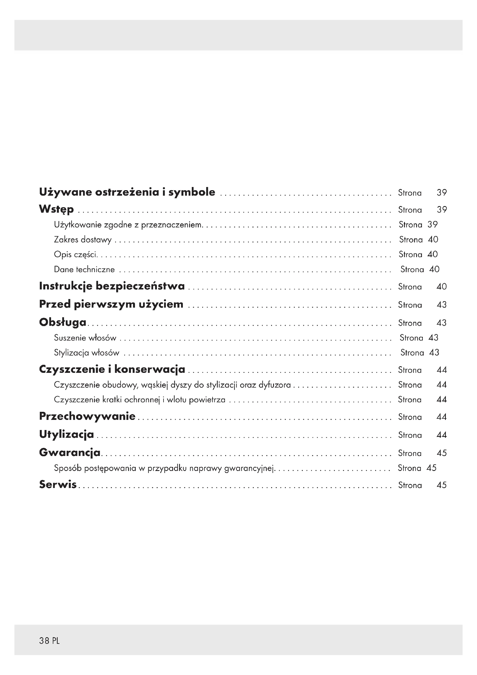 DZIECI! Nie zostawiać dzieci bez nadzoru w pobliżu materiałów pakunkowych. Materiały pakunkowe grożą zadławieniem. Dzieci często nie są w stanie ocenić związanych z tym niebezpieczeństw. Zawsze trzymać dzieci z dala od materiałów pakunkowych.41PL Produkt ten może być używany przez dzieci w wieku powyżej 8lat i osób o ograniczonych zdolnościach fizycznych, zmysłowych lub umysłowych lub braku doświadczenia i wiedzy, gdy jest nadzorowany lub pouczony o bezpiecznym użyciu produktu i wynikających z niego zagrożeniach. Dzieci nie mogą bawić się produktem. Czyszczenie i konserwacja przez użytkownika nie mogą być przeprowadzane przez dzieci pozostawione bez nadzoru. Używać zgodnie z przeznaczeniem m OSTRZEŻENIE! Niewłaściwe użytkowanie może doprowadzić do obrażeń ciała. Z produktu należy korzystać wyłącznie zgodnie z niniejszą instrukcją. Bezpieczeństwo elektryczne m NIEBEZPIECZEŃSTWO! Niebezpieczeństwo porażenia prądem! Nigdy nie próbować samodzielnego naprawiania. W razie awarii naprawy mogą być wykonywane wyłącznie przez wykwalifikowany personel. m OSTRZEŻENIE! Niebezpieczeństwo porażenia prądem! Nie zanurzać produktu w wodzie ani w innych cieczach. Nigdy nie trzymać produktu pod bieżącą wodą. m OSTRZEŻENIE! Niebezpieczeństwo porażenia prądem! Nie używać uszkodzonego produktu. Odłączyć produkt od zasilania i skontaktować się ze sprzedawcą, jeśli jest uszkodzony. Przed podłączeniem produktu do sieci należy sprawdzić, czy napięcie i częstotliwość sieci odpowiadają parametrom zasilania, podanym na tabliczce znamionowej produktu. Regularnie sprawdzać, czy wtyczka sieciowa i kabel zasilania nie są uszkodzone. W celu uniknięcia zagrożeń uszkodzony kabel zasilający musi być wymieniony przez producenta lub jego serwis klientowski lub też osobę posiadającą podobne kwalifikacje.42 PL Kabel zasilania chronić przed uszkodzeniem. Nie dopuszczać, aby zwisał nad ostrymi krawędziami, był ściśnięty lub zgięty. Kabel zasilania trzymać z dala od gorących powierzchni i otwartego ognia. W celu dodatkowej ochrony zaleca się zainstalowanie w obwodzie łazienki wyłącznika różnicowoprądowego (RCD) o prądzie zadziałania nie większym niż 30mA. O radę pytać doświadczonego instalatora. Nie zaleca się stosowania przedłużaczy. W przypadku konieczności użycia przedłużacza należy stosować taki, który jest przystosowany do przepływu prądu o natężeniu co najmniej 10 A. Kable układać w taki sposób, aby nikt nie mógł się potknąć i aby nie można było uszkodzić ich w inny sposób. Obsługa m OSTRZEŻENIE! Niebezpieczeństwo porażenia prądem! Nie należy używać tego produktu w pobliżu wanien, pryszniców, zlewów lub innych naczyń wypełnionych wodą. Produkt nie może być pozostawiony bez opieki, gdy jest podłączony do sieci. Nie używać urządzenia mając mokre ręce lub stojąc na mokrym podłożu. Nie chwytać za wtyczkę sieciową mokrymi lub wilgotnymi rękami. Nie odłączać wtyczki sieciowej od gniazdka sieciowego ciągnąc za kabel zasilania. Nie owijać kabla zasilania wokół produktu. Chronić produkt, kabel zasilający i wtyczkę sieciową przed kurzem, bezpośrednim działaniem promieni słonecznych oraz kapiącą i rozpryskującą się wodą. Zawsze wyłączać produkt przed –Wymianą akcesoriów, –Czyszczeniem produktu, –Odłączeniem od źródła zasilania. Jeśli produkt jest używany w łazience, należy odłączyć go od sieci po użyciu, ponieważ obecność wody stanowi zagrożenie, nawet jeśli produkt jest wyłączony.43PL Czyszczenie i przechowywanie Produkt przechowywać w chłodnym, suchym miejscu, z dala od wilgoci i poza zasięgiem dzieci. Przed pierwszym użyciem Usunąć opakowanie. Upewnić się, że wszystkie elementy są dostępne. RADA: Ten produkt może wydzielać nieprzyjemny zapach podczas pierwszego użycia. Są to pozostałości produkcji lub transportu, które szybko ustąpią. Obsługa Suszenie włosów (Rys.A) Wtyczkę sieciową[4] podłączyć do gniazdka sieciowego. Wybrać żądany poziom przepływu powietrza i nagrzewania (rys. B): / / [5] Przepływ powietrza (Pozycja przełącznika) Produkt wyłączony Produkt włączony: delikatny przepływ powietrza Produkt włączony: silny przepływ powietrza / / [6] Ciepło (Pozycja przełącznika) Brak grzania Niski poziom grzania Wysoki poziom grzania Po użyciu: Wybrać pozycję [5], aby wyłączyć produkt. Wtyczkę sieciową[4] wyjąć z gniazdka sieciowego. Stylizacja włosów Używanie wąskiej dyszy do stylizacji Wąską dyszę do stylizacji[9] umieścić na wylocie powietrza[8]. Przekręcić wąską dyszę do stylizacji[9], aby zmienić położenie. Włączyć produkt. Używając wąskiej dyszy do stylizacji[9], skierować przepływ powietrza na określone partie włosów. RADA: Do układania włosów zalecamy stosowanie delikatnego przepływu powietrza ( [5]) i niskiej temperatury ( [6]). mOSTROŻNIE! Nie wyjmować wąskiej dyszy do stylizacji[9], gdy jest jeszcze gorąca. Używanie dyfuzora Dyfuzor[] nałożyć na wylot powietrza[8]. Włączyć produkt. Dyfuzor[] należy stosować do tworzenia loków i miękkich fal na połowie długości włosów oraz do zwiększania objętości włosów przy ich nasadzie. RADY: W przypadku długich włosów: Przeciągać dyfuzor[] aż do końcówek i układać włosy w miękkie fale, stylizując je w kierunku nasady. W przypadku krótkich włosów: Używać dyfuzora[] do rozpraszania włosów u nasady, zapewniając im objętość i puszystość. mOSTROŻNIE! Nie dotykać dyfuzora[], gdy jeszcze jest gorący.44 PL Tryb chłodzenia W celu uzyskania trwalszej stylizacji używać trybu chłodzenia: [7] Zimny przepływ powietrza Przytrzymać wciśnięty przycisk Zimny przepływ powietrza włączony Przycisk zwolniony Zimny przepływ powietrza wyłączony RADY: Funkcja chłodzenia ( [7]) nie działa, gdy grzanie jest ustawione na „Brak 
