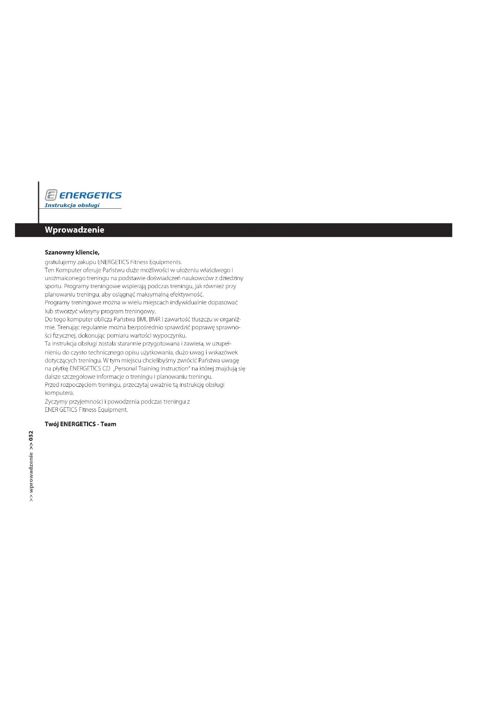 onserwacja . . . . . . . . . . . . . . . . . . . . . . . . . . . . . . . . . . . . . . . . . . . . . . . . . . . . . . 058 Instrukcja obsługi E-105 >> spis treści >> 031Instrukcja obsługi >> wprowadzenie >> 032 Wprowadzenie Szanowny kliencie, gratulujemy zakupu ENERGETICS Fitness Equipments. Ten Komputer oferuje Państwu duże możliwości w ułożeniu właściwego i urozmaiconego treningu na podstawie doświadczeń naukowców z dziedziny spor tu. Programy treningowe wspierają podczas treningu, jak również przy planowaniu treningu, aby osiągnąć maksymalną efektywność. Programy treningowe można w wielu miejscach indywidualnie dopasować lub st worzyć własyny program treningowy. Do tego komputer oblicza Państwa BMI, BMR i zawartość tłuszczu w organiź- mie. Trenując regularnie można bezpośrednio sprawdzić poprawę sprawno- ści z ycznej, dokonując pomiaru wartości wypoczynku. Ta instrukcja obsługi została starannie przygotowana i zawiera, w uzupeł- nieniu do czysto technicznego opisu użytkowania, dużo uwag i wskazówek dot yczących treningu. W tym miejscu chcielibyśmy zwrócić Państwa uwagę na płytkę ENERGETICS CD „Personal Training Instruction“ na której znajdują się dalsze szczegółowe informacje o treningu i planowaniu treningu. Przed rozpoczęciem treningu, przeczytaj uważnie tą instrukcję obsługi