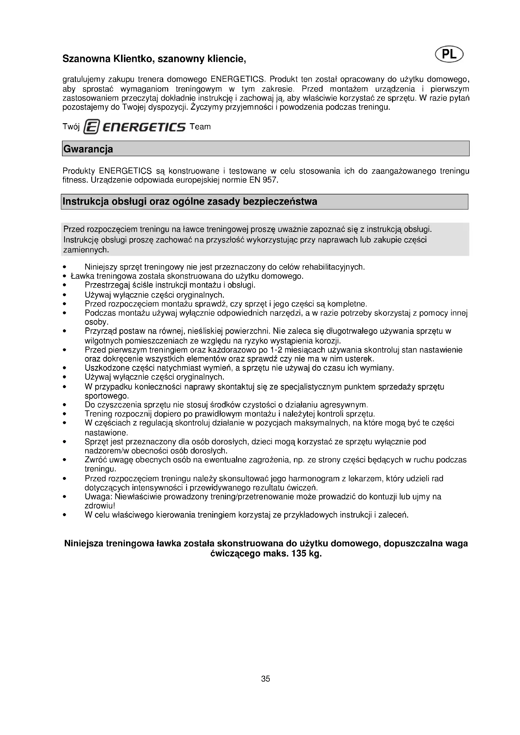 Szanowna Klientko, szanowny kliencie, gratulujemy zakupu trenera domowego ENERGETICS. Produkt ten został opracowany do użytku domowego, aby sprostać wymaganiom treningowym w tym zakresie. Przed montażem urządzenia i pierwszym zastosowaniem przeczytaj dokładnie instrukcję i zachowaj ją, aby właściwie korzystać ze sprzętu. W razie pytań pozostajemy do Twojej dyspozycji. Życzymy przyjemności i powodzenia podczas treningu. Twój - Team Gwarancja Produkty ENERGETICS są konstruowane i testowane w celu stosowania ich do zaangażowanego treningu fitness. Urządzenie odpowiada europejskiej normie EN 957. Instrukcja obsługi oraz ogólne zasady bezpieczeństwa