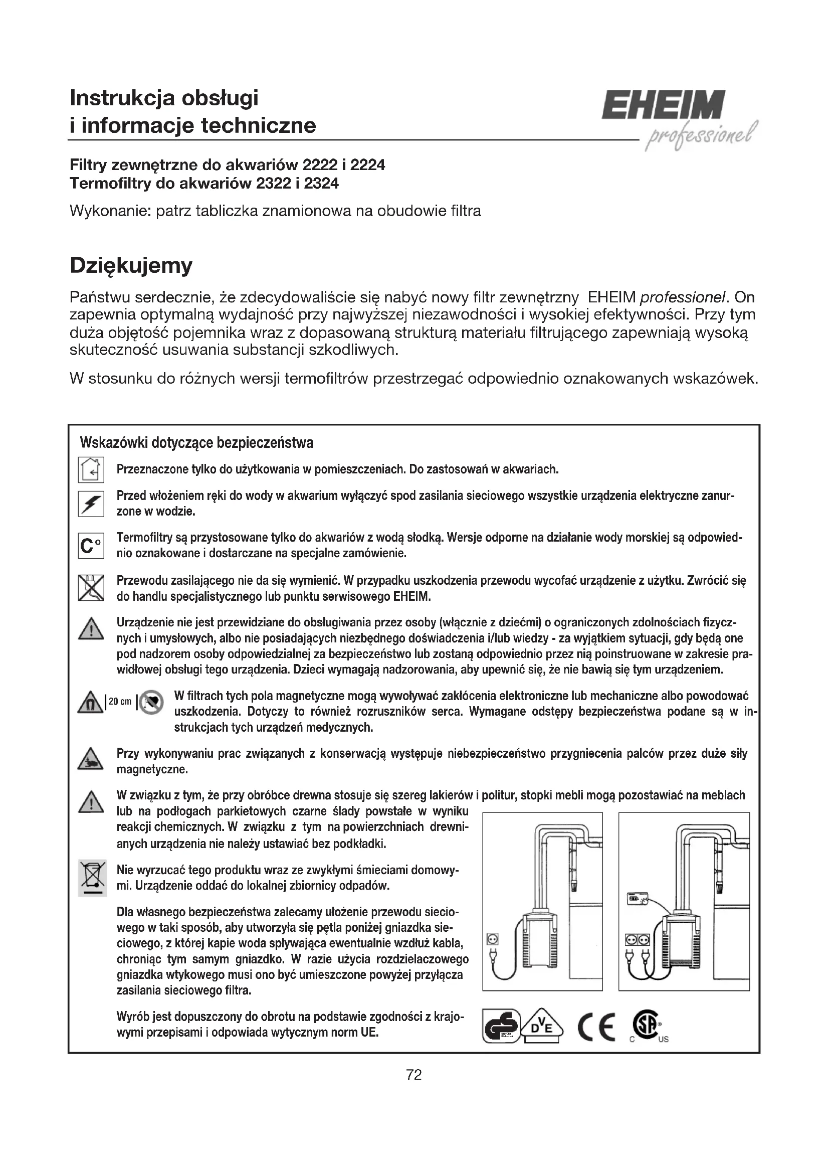 °72 Instrukcja obsługi i informacje techniczne Filtry zewnętrzne do akwariów 2222 i 2224 Termofiltry do akwariów 2322 i 2324 Wykonanie: patrz tabliczka znamionowa na obudowie filtra Dziękujemy Państwu serdecznie, że zdecydowaliście się nabyć nowy filtr zewnętrzny EHEIM professionel. On zapewnia optymalną wydajność przy najwyższej niezawodności i wysokiej efektywności. Przy tym duża objętość pojemnika wraz z dopasowaną strukturą materiału filtrującego zapewniają wysoką skuteczność usuwania substancji szkodliwych. W stosunku do różnych wersji termofiltrów przestrzegać odpowiednio oznakowanych wskazówek. Wskazówki dotyczące bezpieczeństwa Przeznaczone tylko do użytkowania w pomieszczeniach. Do zastosowań w akwariach.Przed włożeniem ręki do wody w akwarium wyłączyć spod zasilania sieciowego wszystkie urządzenia elektryczne zanur-zone w wodzie.Termofiltry są przystosowane tylko do akwariów z wodą słodką. Wersje odporne na działanie wody morskiej są odpowied-nio oznakowane i dostarczane na specjalne zamówienie.Przewodu zasilającego nie da się wymienić. W przypadku uszkodzenia przewodu wycofać urządzenie z użytku. Zwrócić się do handlu specjalistycznego lub punktu serwisowego EHEIM.Urządzenie nie jest przewidziane do obsługiwania przez osoby (włącznie z dziećmi) o ograniczonych zdolnościach fizycz-nych i umysłowych, albo nie posiadających niezbędnego doświadczenia i/lub wiedzy - za wyjątkiem sytuacji, gdy będą one pod nadzorem osoby odpowiedzialnej za bezpieczeństwo lub zostaną odpowiednio przez nią poinstruowane w zakresie pra-widłowej obsługi tego urządzenia. Dzieci wymagają nadzorowania, aby upewnić się, że nie bawią się tym urządzeniem.W filtrach tych pola magnetyczne mogą wywoływać zakłócenia elektroniczne lub mechaniczne albo powodowaćuszkodzenia. Dotyczy to również rozruszników serca. Wymagane odstępy bezpieczeństwa podane są w in-strukcjach tych urządzeń medycznych. Przy wykonywaniu prac związanych z konserwacją występuje niebezpieczeństwo przygniecenia palców przez duże siły magnetyczne.W związku z tym, że przy obróbce drewna stosuje się szereg lakierów i politur, stopki mebli mogą pozostawiać na meblachlub na podłogach parkietowych czarne ślady powstałe w wynikureakcji chemicznych. W związku z tym na powierzchniach drewni-anych urządzenia nie należy ustawiać bez podkładki.Nie wyrzucać tego produktu wraz ze zwykłymi śmieciami domowy-mi. Urządzenie oddać do lokalnej zbiornicy odpadów.Dla własnego bezpieczeństwa zalecamy ułożenie przewodu siecio-wego w taki sposób, aby utworzyła się pętla poniżej gniazdka sie-ciowego, z której kapie woda spływająca ewentualnie wzdłuż kabla,chroniąc tym samym gniazdko. W razie użycia rozdzielaczowegogniazdka wtykowego musi ono być umieszczone powyżej przyłączazasilania sieciowego filtra.Wyrób jest dopuszczony do obrotu na podstawie zgodności z krajo-wymi przepisami i odpowiada wytycznym norm UE.