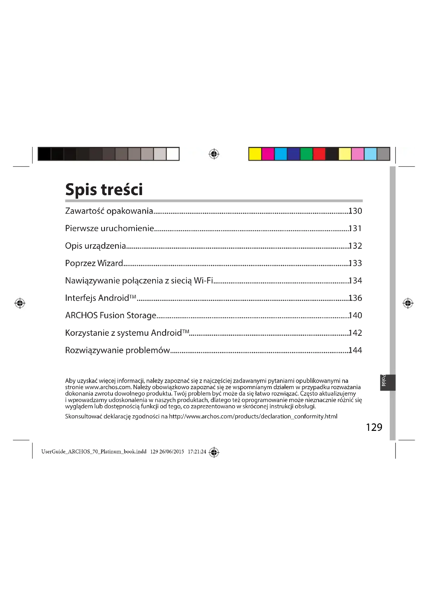 Touch-screen calibration (калибровка сенсорного экрана). Если Вы хотите продлить срок работы батареи: Уменьшите яркость экрана и выключите беспроводные соединения, если они не используются. Если устройство функционирует слишком медленно: Закройте все приложения, которые в данный момент не используются. Если принимаемый сигнал Wi-Fi слишком слаб: Убедитесь, что не находитесь слишком далеко от узла доступа Wi-Fi. Обновите встроенную микропрограмму устройства: http://www.arnovatech.com/ support. Сбросьте и повторно введите параметры соединения. Обратитесь к провайдеру сети Wi-Fi. UserGuide_ARCHOS_70_Platinum_book.indd 128 26/06/2015 17:21:24129 Polski Spis treści Aby uzyskać więcej informacji, należy zapoznać się znajczęściej zadawanymi pytaniami opublikowanymi na stronie www.archos.com. Należy obowiązkowo zapoznać się ze wspomnianym działem wprzypadku rozważania dokonania zwrotu dowolnego produktu. Twój problem być może da się łatwo rozwiązać. Często aktualizujemy iwprowadzamy udoskonalenia wnaszych produktach, dlatego też oprogramowanie może nieznacznie różnić się wyglądem lub dostępnością funkcji od tego, co zaprezentowano wskróconej instrukcji obsługi. Skonsultować deklarację zgodności na http://www.archos.com/products/declaration_conformity.html Zawartość opakowania......................................................................................................... Pierwsze uruchomienie........................................................................................................ Opis urządzenia....................................................................................................................... Poprzez Wizard........................................................................................................................ Nawiązywanie połączenia zsiecią Wi-Fi......................................................................... Interfejs Android