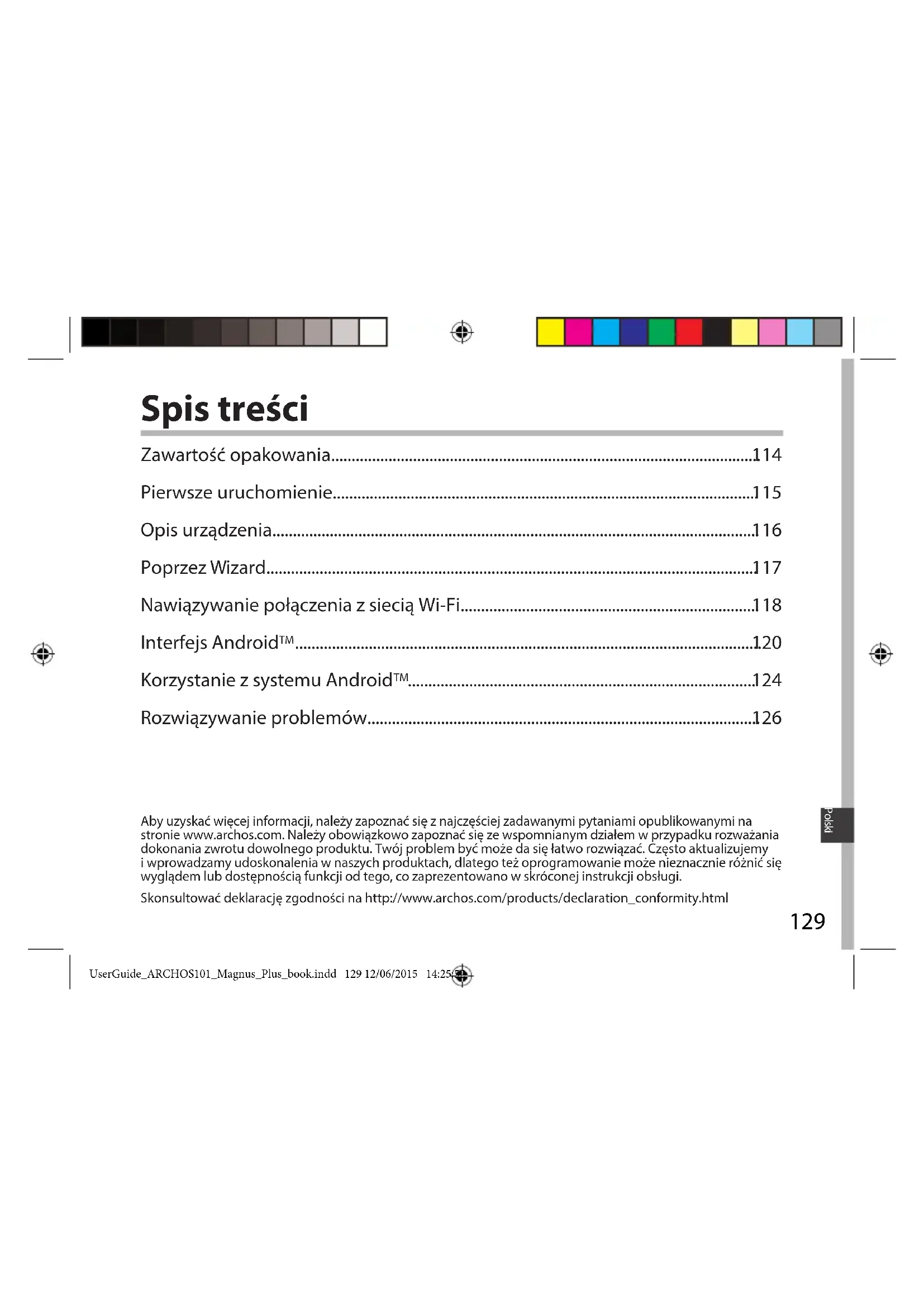 Touch-screen calibration (калибровка сенсорного экрана). Если Вы хотите продлить срок работы батареи: Уменьшите яркость экрана и выключите беспроводные соединения, если они не используются. Если устройство функционирует слишком медленно: Закройте все приложения, которые в данный момент не используются. Если принимаемый сигнал Wi-Fi слишком слаб: Убедитесь, что не находитесь слишком далеко от узла доступа Wi-Fi. Обновите встроенную микропрограмму устройства: http://www.arnovatech.com/ support. Сбросьте и повторно введите параметры соединения. Обратитесь к провайдеру сети Wi-Fi. UserGuide_ARCHOS101_Magnus_Plus_book.indd 128 12/06/2015 14:25:52129 Polski Spis treści Aby uzyskać więcej informacji, należy zapoznać się znajczęściej zadawanymi pytaniami opublikowanymi na stronie www.archos.com. Należy obowiązkowo zapoznać się ze wspomnianym działem wprzypadku rozważania dokonania zwrotu dowolnego produktu. Twój problem być może da się łatwo rozwiązać. Często aktualizujemy iwprowadzamy udoskonalenia wnaszych produktach, dlatego też oprogramowanie może nieznacznie różnić się wyglądem lub dostępnością funkcji od tego, co zaprezentowano wskróconej instrukcji obsługi. Skonsultować deklarację zgodności na http://www.archos.com/products/declaration_conformity.html Zawartość opakowania......................................................................................................... Pierwsze uruchomienie........................................................................................................ Opis urządzenia....................................................................................................................... Poprzez Wizard........................................................................................................................ Nawiązywanie połączenia zsiecią Wi-Fi......................................................................... Interfejs Android