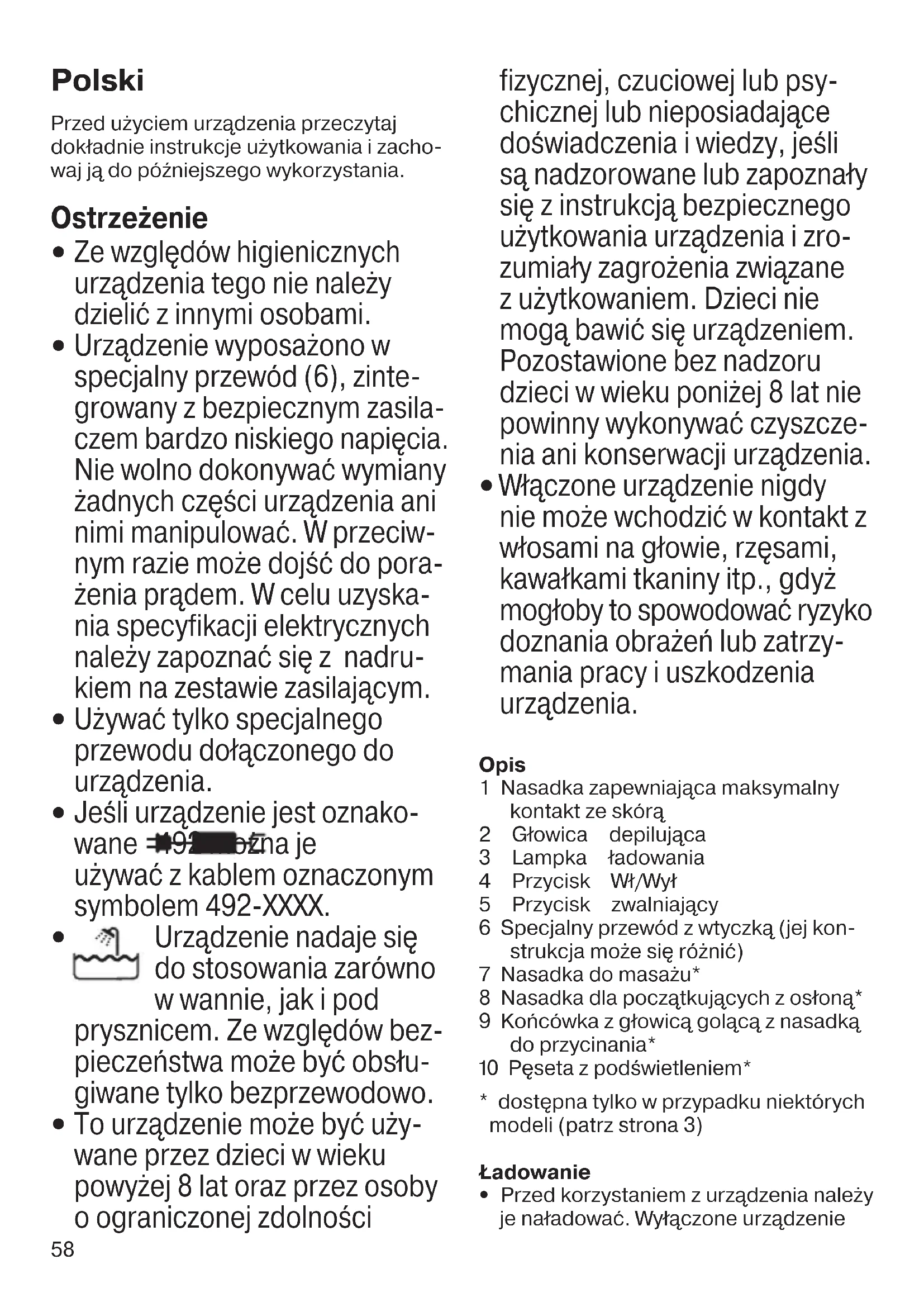 Włączone urządzenie nigdy nie może wchodzić w kontakt z włosami na głowie, rzęsami, kawałkami tkaniny itp., gdyż mogłoby to spowodować ryzyko doznania obrażeń lub zatrzy- mania pracy i uszkodzenia urządzenia. Opis 1 Nasadka zapewniająca maksymalny kontakt ze skórą 2 Głowica depilująca 3 Lampka ładowania 4 Przycisk Wł/Wył 5 Przycisk zwalniający 6 Specjalny przewód z wtyczką (jej kon- strukcja może się różnić) 7 Nasadka do masażu* 8 Nasadka dla początkujących z osłoną* 9 Końcówka z głowicą golącą z nasadką do przycinania* 0 Pęseta z podświetleniem*