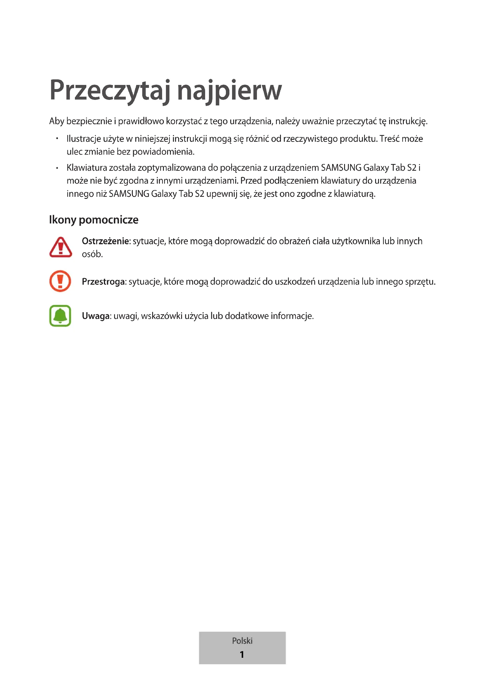 Klawiatura została zoptymalizowana do połączenia z urządzeniem SAMSUNG Galaxy Tab S2 i może nie być zgodna z innymi urządzeniami. Przed podłączeniem klawiatury do urządzenia innego niż SAMSUNG Galaxy Tab S2 upewnij się, że jest ono zgodne z klawiaturą. Ikony pomocnicze Ostrzeżenie: sytuacje, które mogą doprowadzić do obrażeń ciała użytkownika lub innych osób. Przestroga: sytuacje, które mogą doprowadzić do uszkodzeń urządzenia lub innego sprzętu. Uwaga: uwagi, wskazówki użycia lub dodatkowe informacje. Polski