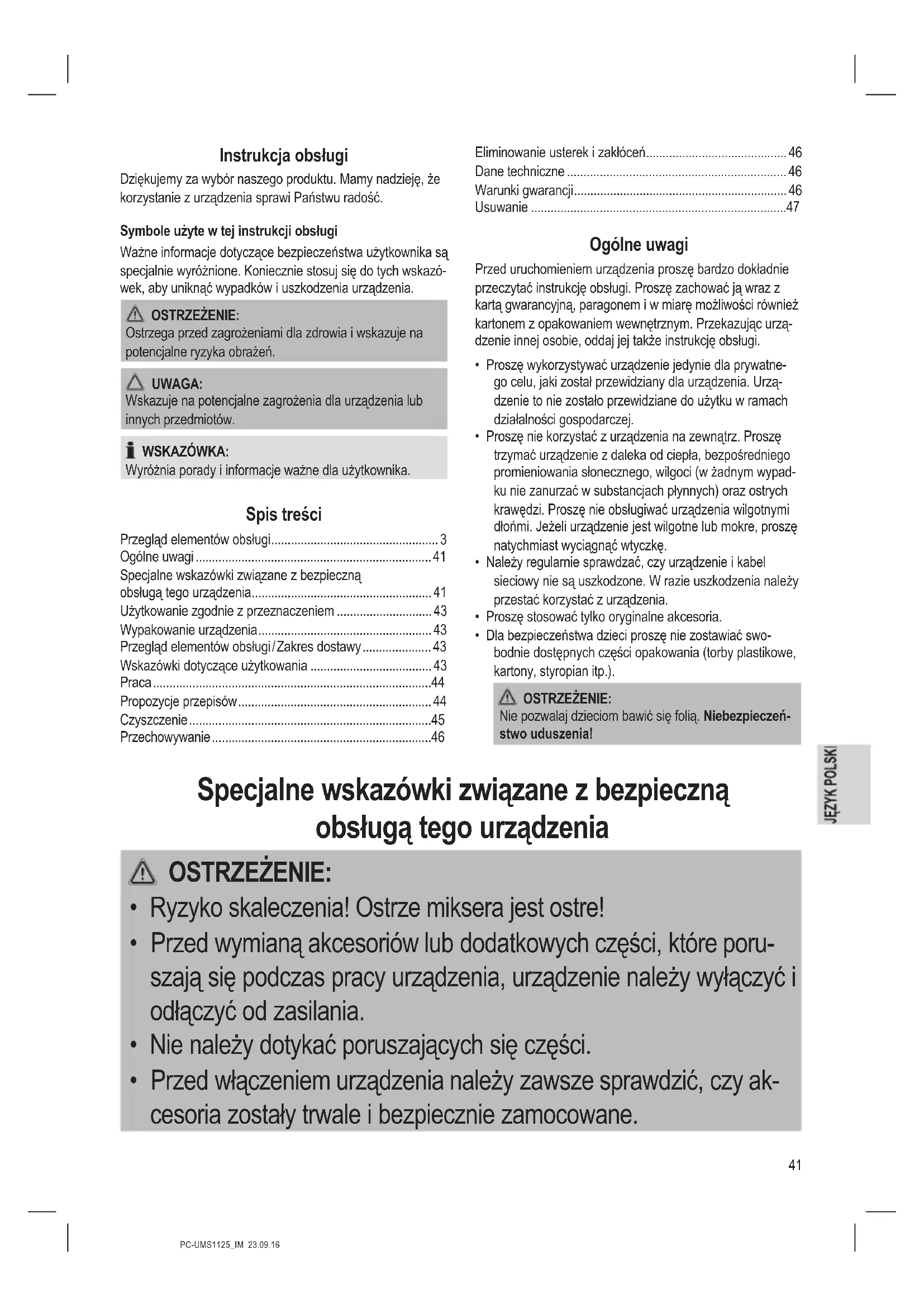 - Przed włączeniem urządzenia należy zawsze sprawdzić, czy ak- cesoria zostały trwale i bezpiecznie zamocowane.42 PC-UMS1125_IM 23.09.16 OSTRZEŻENIE: