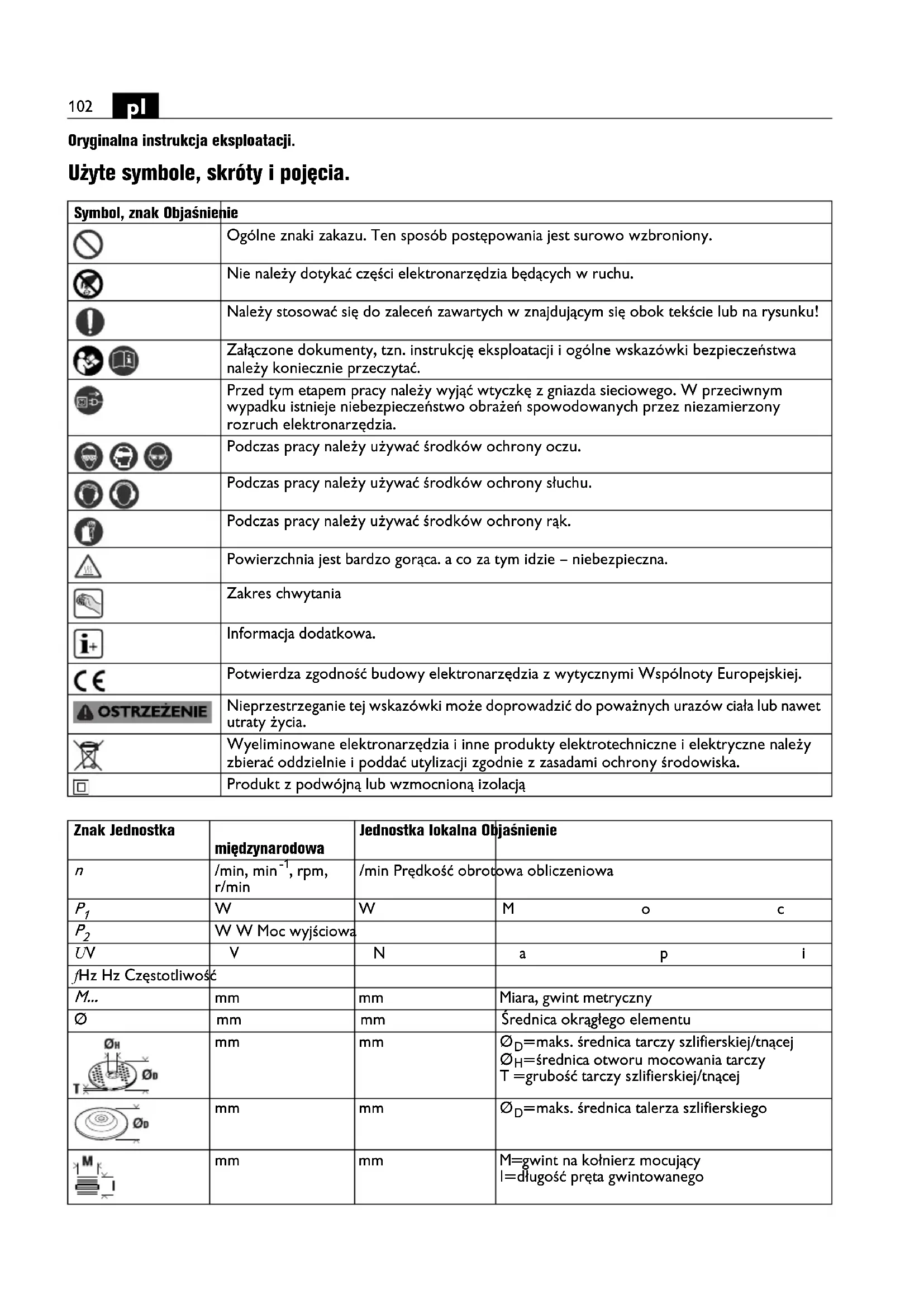 Oryginalna instrukcja eksploatacji. Użyte symbole, skróty i pojęcia. Symbol, znak Objaśnienie Ogólne znaki zakazu. Ten sposób postępowania jest surowo wzbroniony. Nie należy dotykać części elektronarzędzia będących w ruchu. Należy stosować się do zaleceń zawartych w znajdującym się obok tekście lub na rysunku! Załączone dokumenty, tzn. instrukcję eksploatacji i ogólne wskazówki bezpieczeństwa należy koniecznie przeczytać. Przed tym etapem pracy należy wyjąć wtyczkę z gniazda sieciowego. W przeciwnym wypadku istnieje niebezpieczeństwo obrażeń spowodowanych przez niezamierzony rozruch elektronarzędzia. Podczas pracy należy używać środków ochrony oczu. Podczas pracy należy używać środków ochrony słuchu. Podczas pracy należy używać środków ochrony rąk. Powierzchnia jest bardzo gorąca. a co za tym idzie – niebezpieczna. Zakres chwytania Informacja dodatkowa. Potwierdza zgodność budowy elektronarzędzia z wytycznymi Wspólnoty Europejskiej. Nieprzestrzeganie tej wskazówki może doprowadzić do poważnych urazów ciała lub nawet utraty życia. Wyeliminowane elektronarzędzia i inne produkty elektrotechniczne i elektryczne należy zbierać oddzielnie i poddać utylizacji zgodnie z zasadami ochrony środowiska. Produkt z podwójną lub wzmocnioną izolacją Znak Jednostka międzynarodowa Jednostka lokalna Objaśnienie