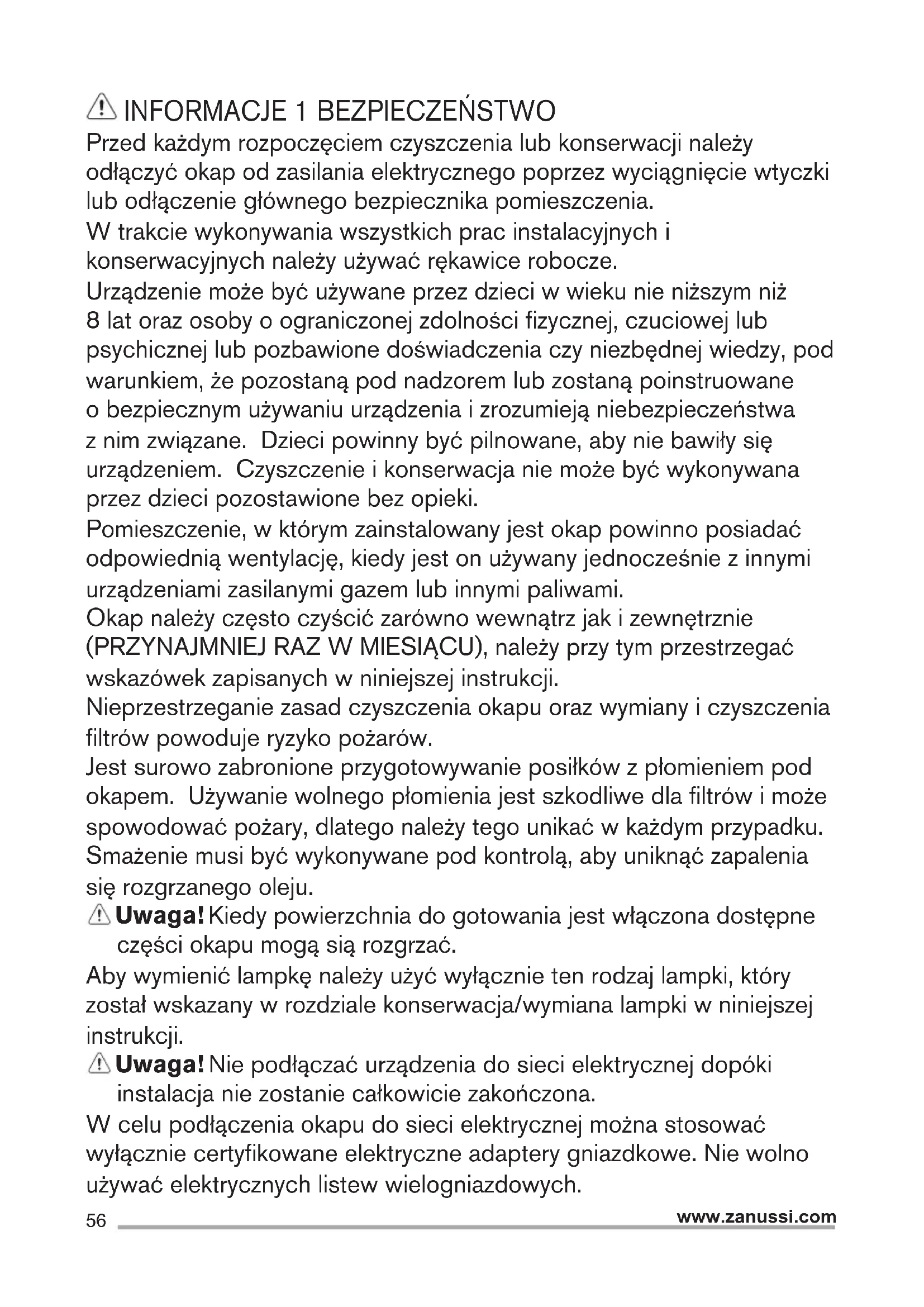 Przed każdym rozpoczęciem czyszczenia lub konserwacji należy odłączyć okap od zasilania elektrycznego poprzez wyciągnięcie wtyczki lub odłączenie głównego bezpiecznika pomieszczenia. W trakcie wykonywania wszystkich prac instalacyjnych i konserwacyjnych należy używać rękawice robocze. Urządzenie może być używane przez dzieci w wieku nie niższym niż 8 lat oraz osoby o ograniczonej zdolności fizycznej, czuciowej lub psychicznej lub pozbawione doświadczenia czy niezbędnej wiedzy, pod warunkiem, że pozostaną pod nadzorem lub zostaną poinstruowane o bezpiecznym używaniu urządzenia i zrozumieją niebezpieczeństwa z nim związane. Dzieci powinny być pilnowane, aby nie bawiły się urządzeniem. Czyszczenie i konserwacja nie może być wykonywana przez dzieci pozostawione bez opieki. Pomieszczenie, w którym zainstalowany jest okap powinno posiadać odpowiednią wentylację, kiedy jest on używany jednocześnie z innymi urządzeniami zasilanymi gazem lub innymi paliwami. Okap należy często czyścić zarówno wewnątrz jak i zewnętrznie (PRZYNAJMNIEJ RAZ W MIESIĄCU), należy przy tym przestrzegać wskazówek zapisanych w niniejszej instrukcji. Nieprzestrzeganie zasad czyszczenia okapu oraz wymiany i czyszczenia filtrów powoduje ryzyko pożarów. Jest surowo zabronione przygotowywanie posiłków z płomieniem pod okapem. Używanie wolnego płomienia jest szkodliwe dla filtrów i może spowodować pożary, dlatego należy tego unikać w każdym przypadku. Smażenie musi być wykonywane pod kontrolą, aby uniknąć zapalenia się rozgrzanego oleju. Uwaga! Kiedy powierzchnia do gotowania jest włączona dostępne części okapu mogą sią rozgrzać. Aby wymienić lampkę należy użyć wyłącznie ten rodzaj lampki, który został wskazany w rozdziale konserwacja/wymiana lampki w niniejszej instrukcji. Uwaga! Nie podłączać urządzenia do sieci elektrycznej dopóki instalacja nie zostanie całkowicie zakończona. W celu podłączenia okapu do sieci elektrycznej można stosować wyłącznie certyfikowane elektryczne adaptery gniazdkowe. Nie wolno używać elektrycznych listew wielogniazdowych.57 www.zanussi.com