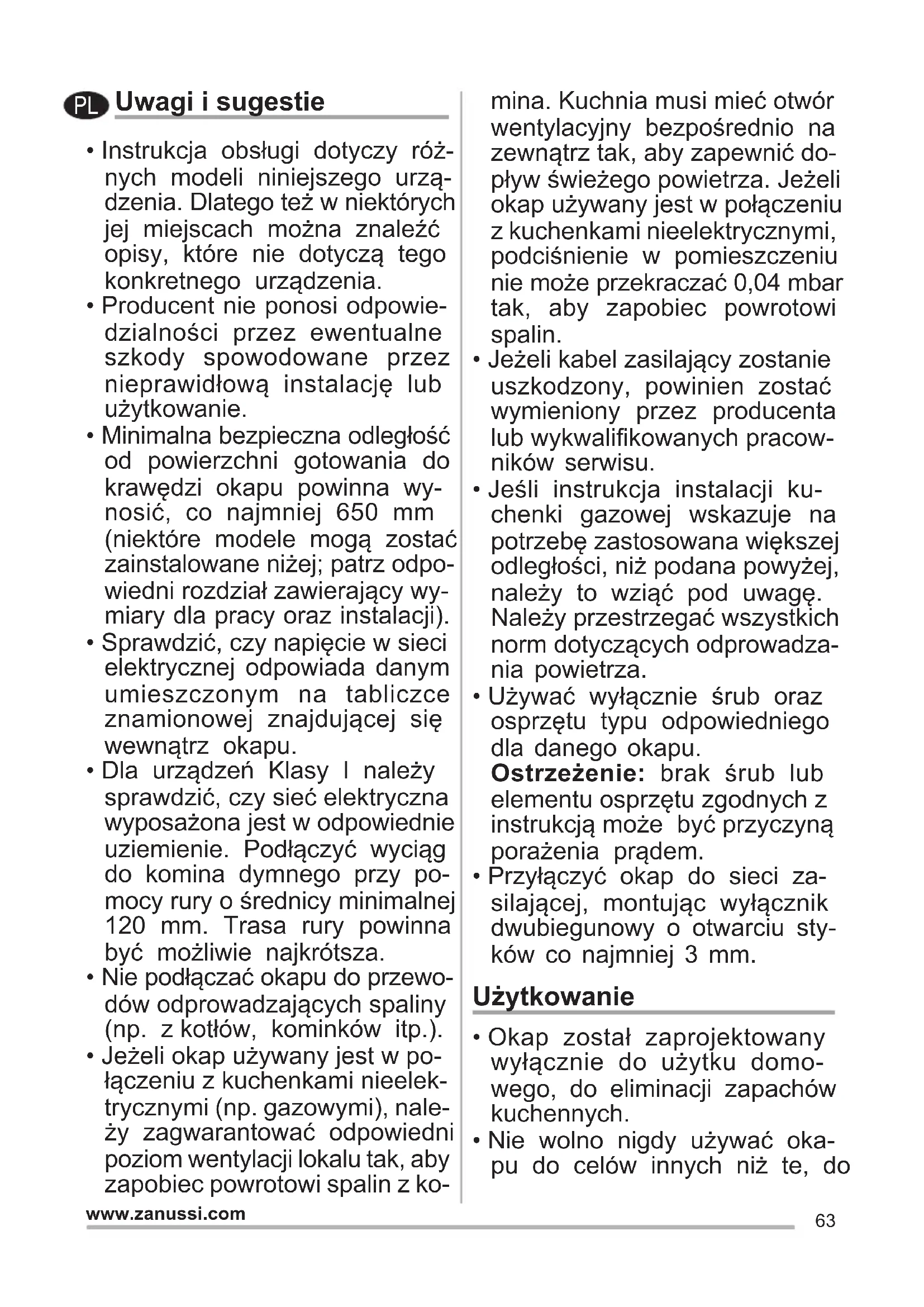 - Nie wolno nigdy używać oka- pu do celów innych niż te, do PL64 www.zanussi.com których został zaprojektowany.