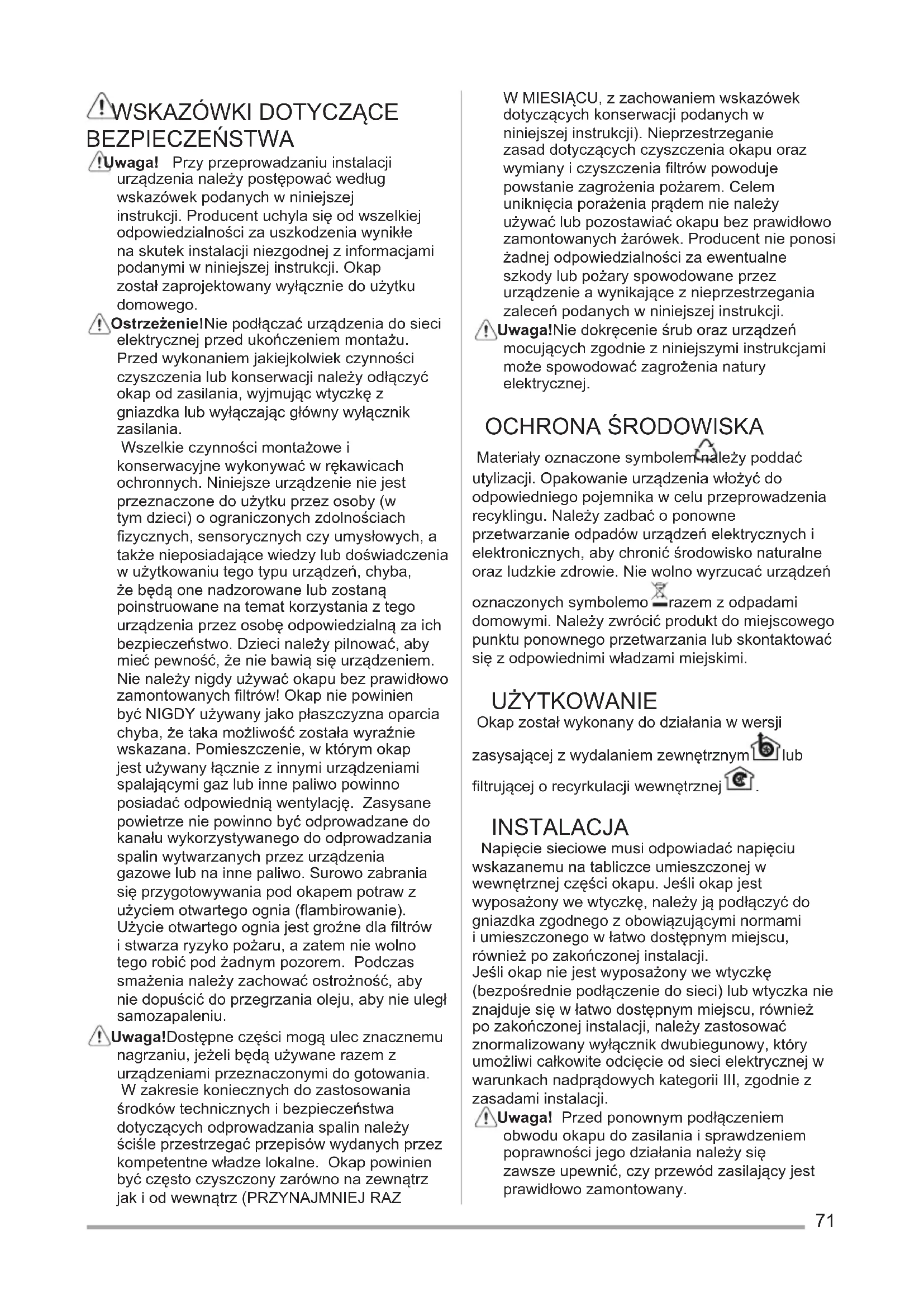 BEZPIECZEŃSTWA Uwaga! Przy przeprowadzaniu instalacji urządzenia należy postępować według wskazówek podanych w niniejszej instrukcji. Producent uchyla się od wszelkiej odpowiedzialności za uszkodzenia wynikłe na skutek instalacji niezgodnej z informacjami podanymi w niniejszej instrukcji. Okap został zaprojektowany wyłącznie do użytku domowego. Ostrzeżenie! Nie podłączać urządzenia do sieci elektrycznej przed ukończeniem montażu. Przed wykonaniem jakiejkolwiek czynności czyszczenia lub konserwacji należy odłączyć okap od zasilania, wyjmując wtyczkę z gniazdka lub wyłączając główny wyłącznik zasilania. Wszelkie czynności montażowe i konserwacyjne wykonywać w rękawicach ochronnych. Niniejsze urządzenie nie jest przeznaczone do użytku przez osoby (w tym dzieci) o ograniczonych zdolnościach fizycznych, sensorycznych czy umysłowych, a także nieposiadające wiedzy lub doświadczenia w użytkowaniu tego typu urządzeń, chyba, że będą one nadzorowane lub zostaną poinstruowane na temat korzystania z tego urządzenia przez osobę odpowiedzialną za ich bezpieczeństwo. Dzieci należy pilnować, aby mie ć pewność, że nie bawią się urządzeniem. Nie należy nigdy używać okapu bez prawidłowo zamontowanych filtrów! Okap nie powinien być NIGDY używany jako płaszczyzna oparcia chyba, że taka możliwość została wyraźnie wskazana. Pomieszczenie, w którym okap jest używany łącznie z innymi urządzeniami spalającymi gaz lub inne paliwo powinno posiadać odpowiednią wentylację. Zasysane powietrze nie powinno być odprowadzane do kanału wykorzystywanego do odprowadzania spalin wytwarzanych przez urządzenia gazowe lub na inne paliwo. Surowo zabrania się przygotowywania pod okapem potraw z użyciem otwartego ognia (flambirowanie). Użycie otwartego ognia jest groźne dla filtrów i stwarza ryzyko pożaru, a zatem nie wolno tego robić pod żadnym pozorem. Podczas smażenia należy zachować ostrożność, aby nie dopuścić do przegrzania oleju, aby nie uległ samozapaleniu. Uwaga! Dostępne części mogą ulec znacznemu nagrzaniu, jeżeli będą używane razem z urządzeniami przeznaczonymi do gotowania. W zakresie koniecznych do zastosowania środków technicznych i bezpieczeństwa dotyczących odprowadzania spalin należy ściśle przestrzegać przepisów wydanych przez kompetentne władze lokalne. Okap powinien być często czyszczony zarówno na zewnątrz jak i od wewnątrz (PRZYNAJMNIEJ RAZ W MIESIĄCU, z zachowaniem wskazówek dotyczących konserwacji podanych w niniejszej instrukcji). Nieprzestrzeganie zasad dotyczących czyszczenia okapu oraz wymiany i czyszczenia filtrów powoduje powstanie zagrożenia pożarem. Celem uniknięcia porażenia prądem nie należy używać lub pozostawiać okapu bez prawidłowo zamontowanych żarówek. Producent nie ponosi żadnej odpowiedzialności za ewentualne szkody lub pożary spowodowane przez urządzenie a wynikające z nieprzestrzegania zaleceń podanych w niniejszej instrukcji. Uwaga! Nie dokręcenie śrub oraz urządzeń mocujących zgodnie z niniejszymi instrukcjami może spowodować zagrożenia natury elektrycznej. OCHRONA ŚRODOWISKA Materiały oznaczone symbolem należy poddać utylizacji. Opakowanie urządzenia włożyć do odpowiedniego pojemnika w celu przeprowadzenia recyklingu. Należy zadbać o ponowne przetwarzanie odpadów urządzeń elektrycznych i elektronicznych, aby chronić środowisko naturalne oraz ludzkie zdrowie. Nie wolno wyrzucać urządzeń oznaczonych symbolemo razem z odpadami domowymi. Należy zwrócić produkt do miejscowego punktu ponownego przetwarzania lub skontaktować się z odpowiednimi władzami miejskimi. UŻYTKOWANIE Okap został wykonany do działania w wersji zasysającej z wydalaniem zewnętrznym lub filtrującej o recyrkulacji wewnętrznej