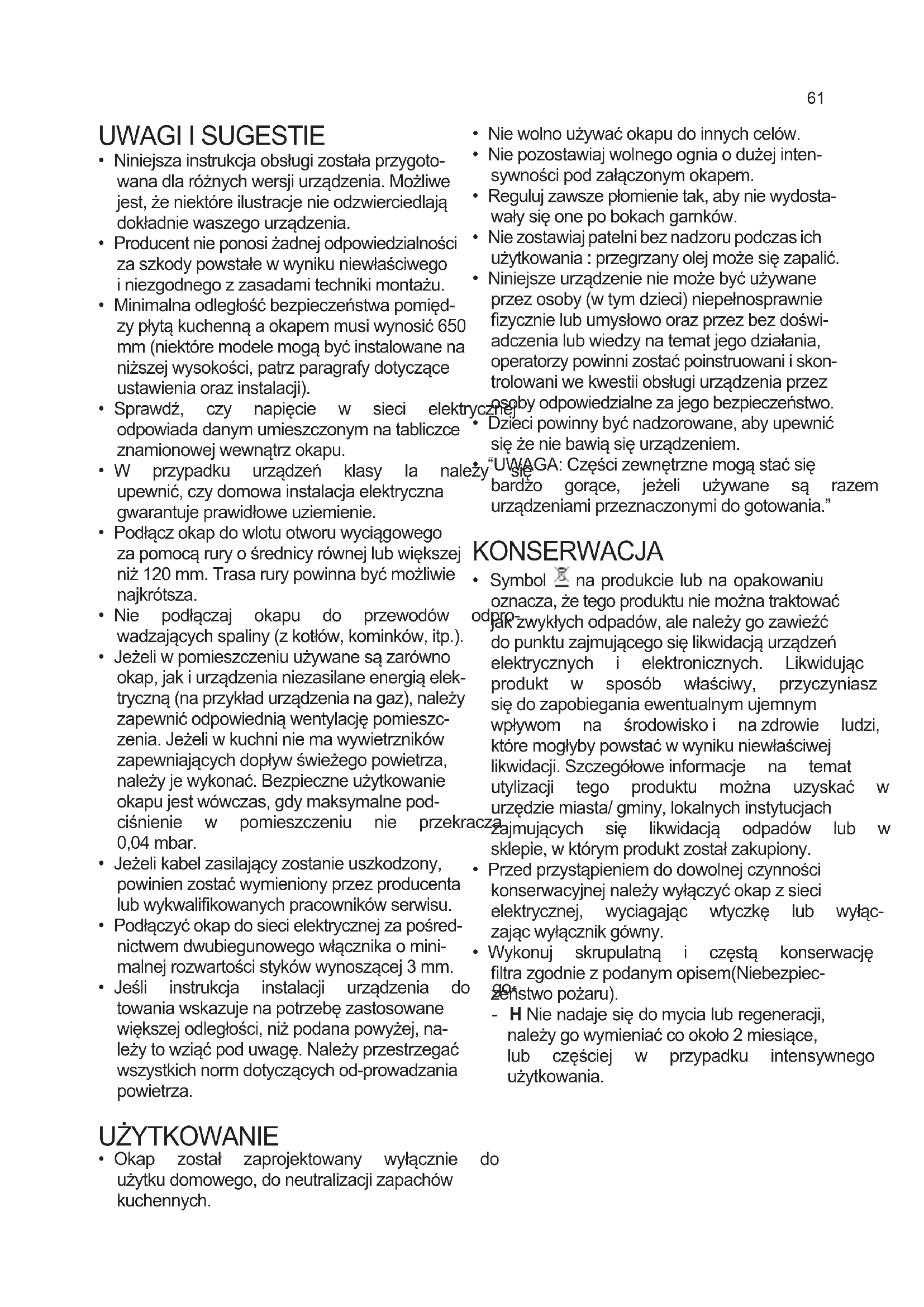 - Jeżeliwpomieszczeniuużywanesązarówno okap,jakiurządzenianiezasilaneenergiąelek- tryczną(naprzykładurządzenianagaz),należy zapewnićodpowiedniąwentylacjępomieszc- zenia.Jeżeliwkuchniniemawywietrzników zapewniającychdopływświeżegopowietrza, należyjewykonać.Bezpieczneużytkowanie okapujestwówczas,gdymaksymalnepod- ciśnienie w pomieszczeniu nie przekracza 0,04mbar.