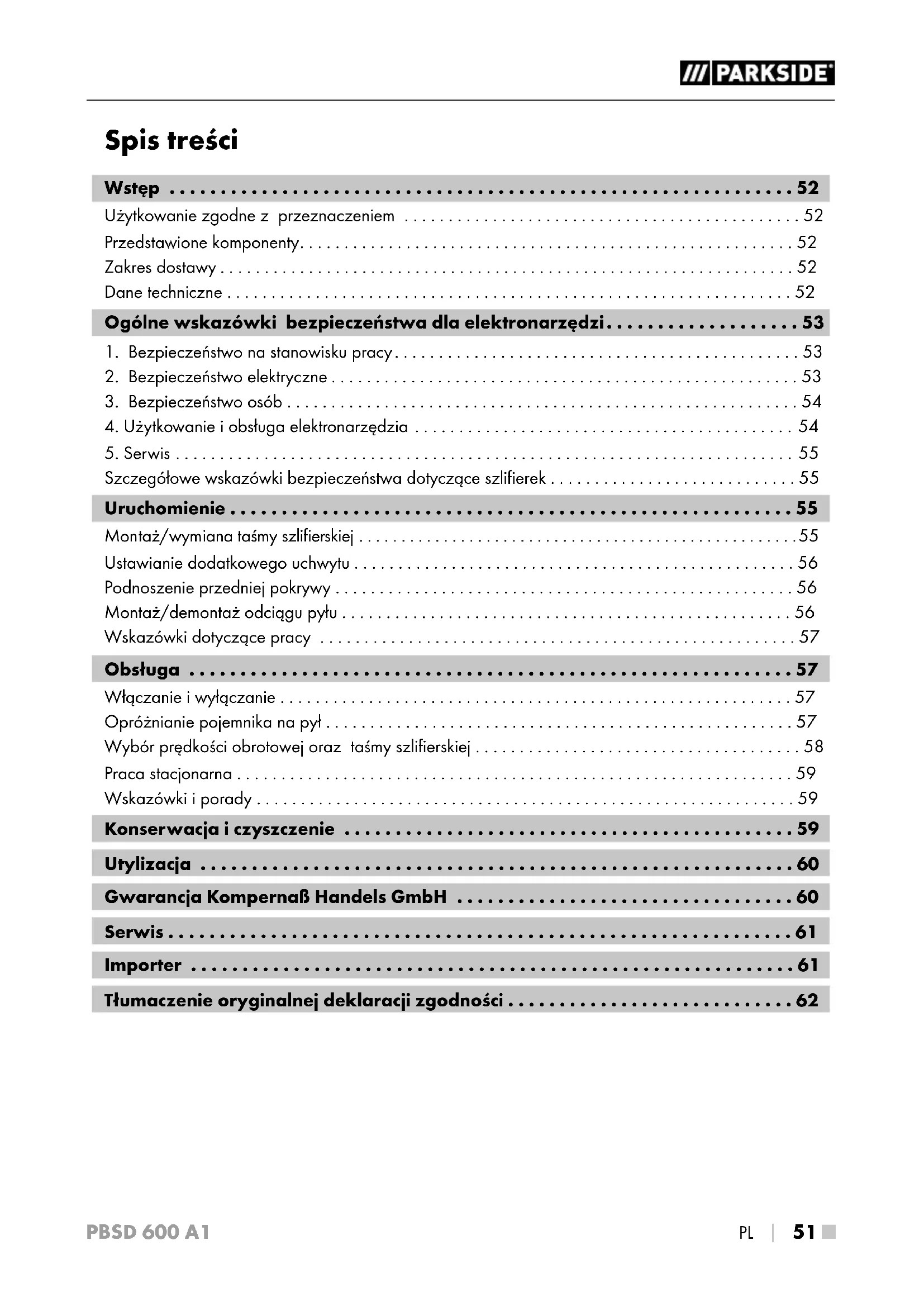 - 51 ■ PBSD 600 A1 Spis treści Wstęp p. 52