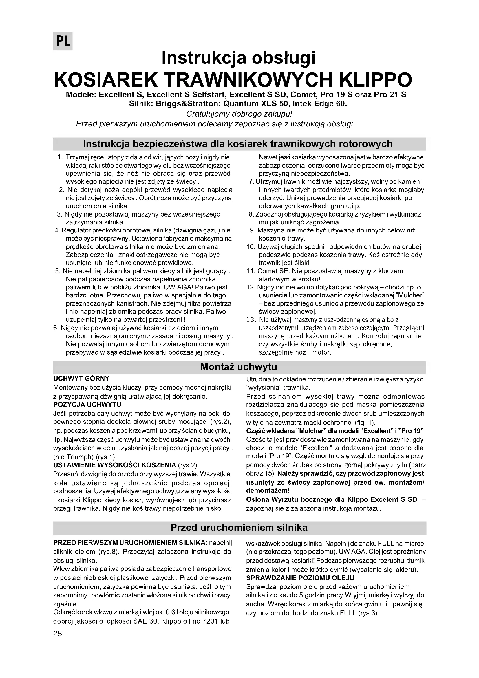 Modele: Excellent S, Excellent S Selfstart, Excellent S SD, Comet, Pro 19 S oraz Pro 21 S Silnik: Briggs&Stratton: Quantum XLS 50, Intek Edge 60. Gratulujemy dobrego zakupu! Przed pierwszym uruchomieniem polecamy zapoznać się z instrukcją obsługi. Instrukcja bezpieczeństwa dla kosiarek trawnikowych rotorowych 1.Trzymaj ręce i stopy z dala od wirujących noży i nigdy niewkładaj rąk i stóp do otwartego wylotu bez wcześniejszegoupewnienia się, że nóż nie obraca się oraz przewódwysokiego napięcia nie jest zdjęty ze świecy . 2. Nie dotykaj noża dopóki przewód wysokiego napięcianie jest zdjęty ze świecy . Obrót noża może być przyczynąuruchomienia silnika. 3. Nigdy nie pozostawiaj maszyny bez wcześniejszegozatrzymania silnika. 4. Regulator prędkości obrotowej silnika (dżwignia gazu) niemoże być niesprawny. Ustawiona fabrycznie maksymalnaprędkość obrotowa silnika nie może być zmieniana.Zabezpieczenia i znaki ostrzegawcze nie mogą byćusunięte lub nie funkcjonować prawidłowo. 5. Nie napełniaj zbiornika paliwem kiedy silnik jest gorący .Nie pal papierosów podczas napełniania zbiornikapaliwem lub w pobliżu zbiomika. UW AGA! Paliwo jestbardzo lotne. Przechowuj paliwo w specjalnie do tegoprzeznaczonych kanistrach. Nie zdejmuj filtra powietrzai nie napełniaj zbiornika podczas pracy silnika. Paliwouzupełniaj tylko na otwartej przestrzeni !6. Nigdy nie pozwalaj używać kosiarki dzieciom i innymosobom niezaznajomionym z zasadami obsługi maszyny .Nie pozwalaj innym osobom lub zwierzętom domowymprzebywać w sąsiedztwie kosiarki podczas jej pracy . Przed uruchomieniem silnika Nawet jeśłi kosiarka wyposażona jest w bardzo efektywnezabezpieczenia, odrzucone twarde przedmioty mogą byćprzyczyną niebezpieczeństwa. 7. Utrzymuj trawnik możliwie najczystszy, wolny od kamienii innych twardych przedmiotów, które kosiarka mogłabyuderzyć. Unikaj prowadzenia pracujacej kosiarki pooderwanych kawałkach gruntu,itp. 8. Zapoznaj obsługującego kosiarkę z ryzykiem i wytłumaczmu jak uniknąć zagrożenia. 9. Maszyna nie może być używana do innych celów niżkoszenie trawy.10. Używaj długich spodni i odpowiednich butów na grubejpodeszwie podczas koszenia trawy. Koś ostrożnie gdytrawnik jest śliski!11. Comet SE: Nie poszostawiaj maszyny z kluczemstartowym w srodku!12. Nigdy nic nie wolno dotykać pod pokrywą – chodzi np. ousunięcie lub zamontowanic części wkładanej ”Mulcher”– bez uprzedniego usunięcia przewodu zapłonowego zeświecy zapłonowej.