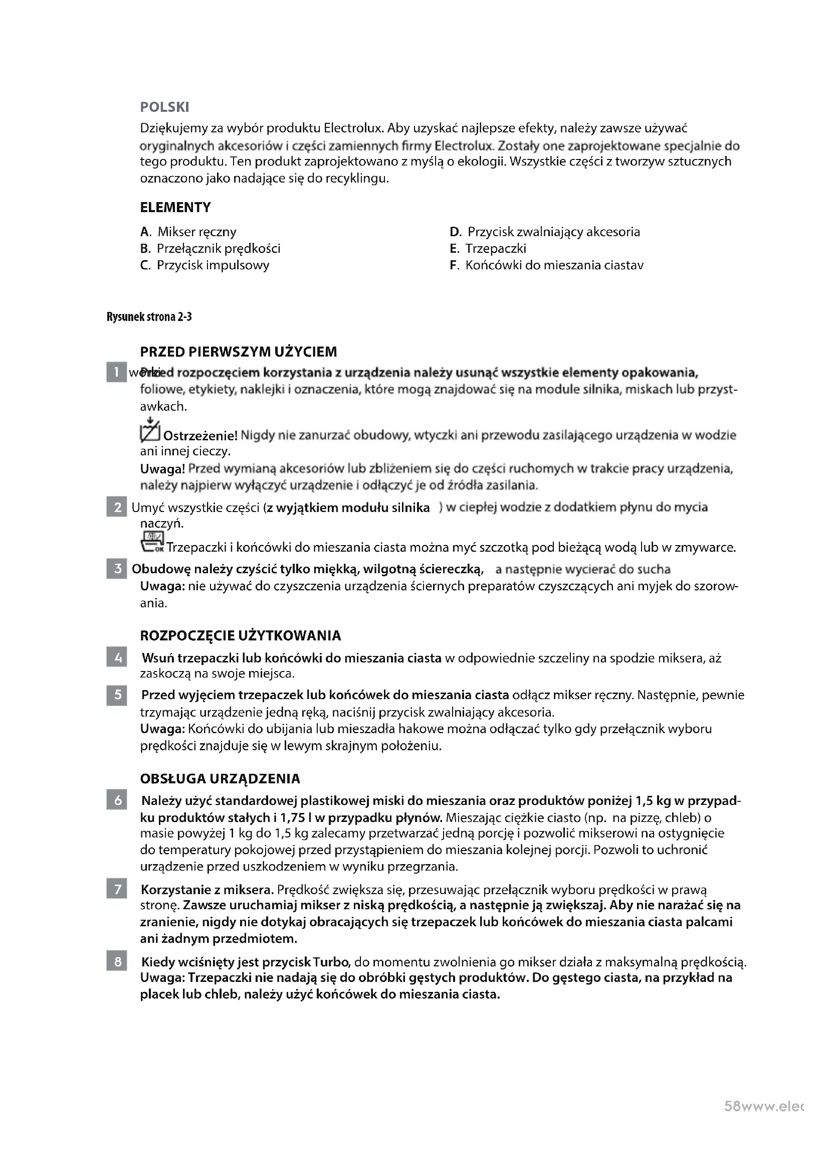 9 Wyłączyć urządzenie, wyjąć wtyczkę przewodu zasilającego i odczekać, aż narzędzie całkowicie się zatrzyma. Ostrzeżenie! ani innej cieczy. 10 Umyć wszystkie części (z wyjątkiem modułu silnika naczyń. Trzepaczki i końcówki do mieszania ciasta można myć szczotką pod bieżącą wodą lub w zmywarce. 11 Obudowę należy czyścić tylko miękką, wilgotną ściereczką, Uwaga: nie używać do czyszczenia urządzenia ściernych preparatów czyszczących ani myjek do szorow- ania. Przed odłożeniem urządzenia należy wyjąć wtyczkę z gniazda. Urządzenie powinno być czyste i całkow- icie suche. Życzymy udanego użytkowania produktu Electrolux! BEZPIECZEŃSTWO Przeczytaj uważnie poniższe zalecenia przed pierwszym użyciem urządzenia.