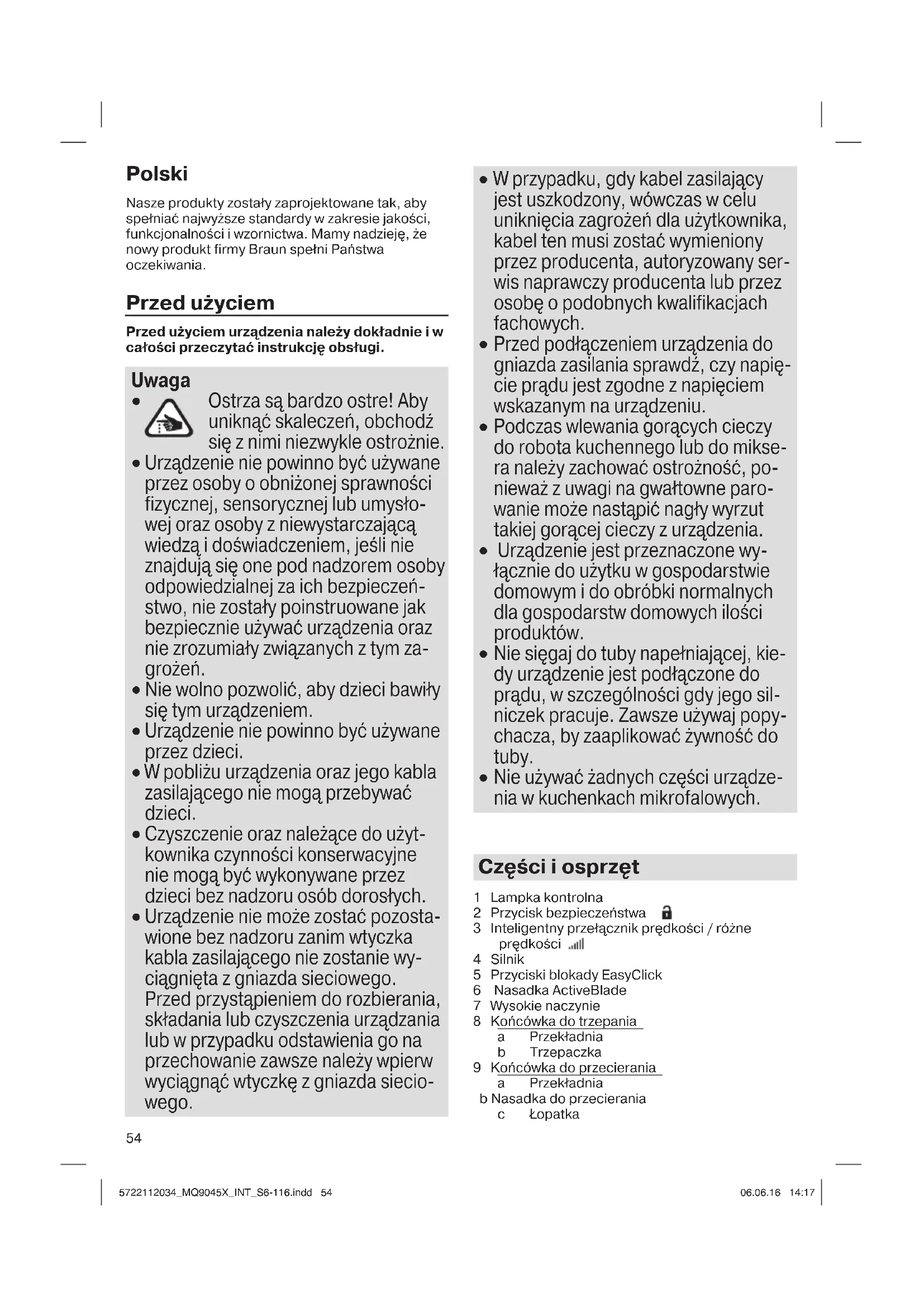 Nie używać żadnych części urządze- nia w kuchenkach mikrofalowych. Części i osprzęt 1 Lampka kontrolna 2 Przycisk bezpieczeństwa 3 Inteligentny przełącznik prędkości / różne prędkości 4 Silnik 5 Przyciski blokady EasyClick 6 Nasadka ActiveBlade 7 Wysokie naczynie 8 Końcówka do trzepania a Przekładnia b Trzepaczka 9 Końcówka do przecierania a Przekładnia b Nasadka do przecierania c Łopatka 5722112034_MQ9045X_INT_S6-116.indd 545722112034_MQ9045X_INT_S6-116.indd 54 06.06.16 14:1706.06.16 14:1755 10 350 ml końcówka do siekania «hc» a Pokrywa b Ostrze do siekania c Misa do siekania d Antypoślizgowy pierścień gumowy 11 500 ml końcówka do siekania «ca» a Pokrywa (z przekładnią) b Ostrze do siekania c Misa do siekania d Antypoślizgowy pierścień gumowy 12 1250 ml końcówka do siekania «bc» a Pokrywa (z przekładnią) b Ostrze do siekania c Ostrze do lodu d Misa do siekania e Antypoślizgowy pierścień gumowy Przed pierwszym użyciem należy umyć wszystkie części – patrz «Konserwacja i czyszczenie». Lampka kontrolna Lampka kontrolna (1) pokazuje aktualny tryb pracy urządzenia podłączonego do zasilania. Lampka kontrolna Urządzenie / Tryb pracy Lampka mruga na czerwono Urządzenie jest gotowe do użycia. Lampka świeci na zielono Urządzenie jest odblokowane (przycisk blokady jest naciśnięty) i może być włączone. Lampka świeci na czerwono Wczesne ostrzeżenie o możliwości przegrzania. Sil- nik stopniowo zwalnia, aż do wyłączenia. Należy odczekać, aby umożliwić ostygnięcie urządzenia. Kiedy lampka zacznie mrugać na czerwono to urządzenie jest goto- we do dalszej pracy. Obróbkę można dokończyć nawet wówczas, gdy maksymalna prędkość obrotowa zacznie się zmniejszać na skutek dużego obciążenia lub długotrwałej pracy urządzenia. Jak korzystać z urządzenia Inteligentny przełącznik wielu prędkości Wszystkie prędkości dostępne za jednym naciśnięciem. Im mocniej naciskasz tym większa jest prędkość. Im wyższa prędkość tym szybsze i bardziej efektywne jest miksowanie i siekanie. Obsługa tylko jedną ręką: Inteligentny przełącznik prędkości (3) umożliwia włączanie urządzenia i kontrolę prędkości jego obrotów przy użyciu jednej ręki. Obsługa ręcznego blendera Pierwsze użycie: Usuń blokadę transportową silnika (4) pociągając za czerwony pasek. Włączanie (A) Urządzenie wyposażone jest w przycisk bezpieczeństwa służący do odblokowania inteligentnego przełącznika prędkości. Aby bezpiecznie włączyć urządzenie należy postępować zgodnie z poniższymi punktami: