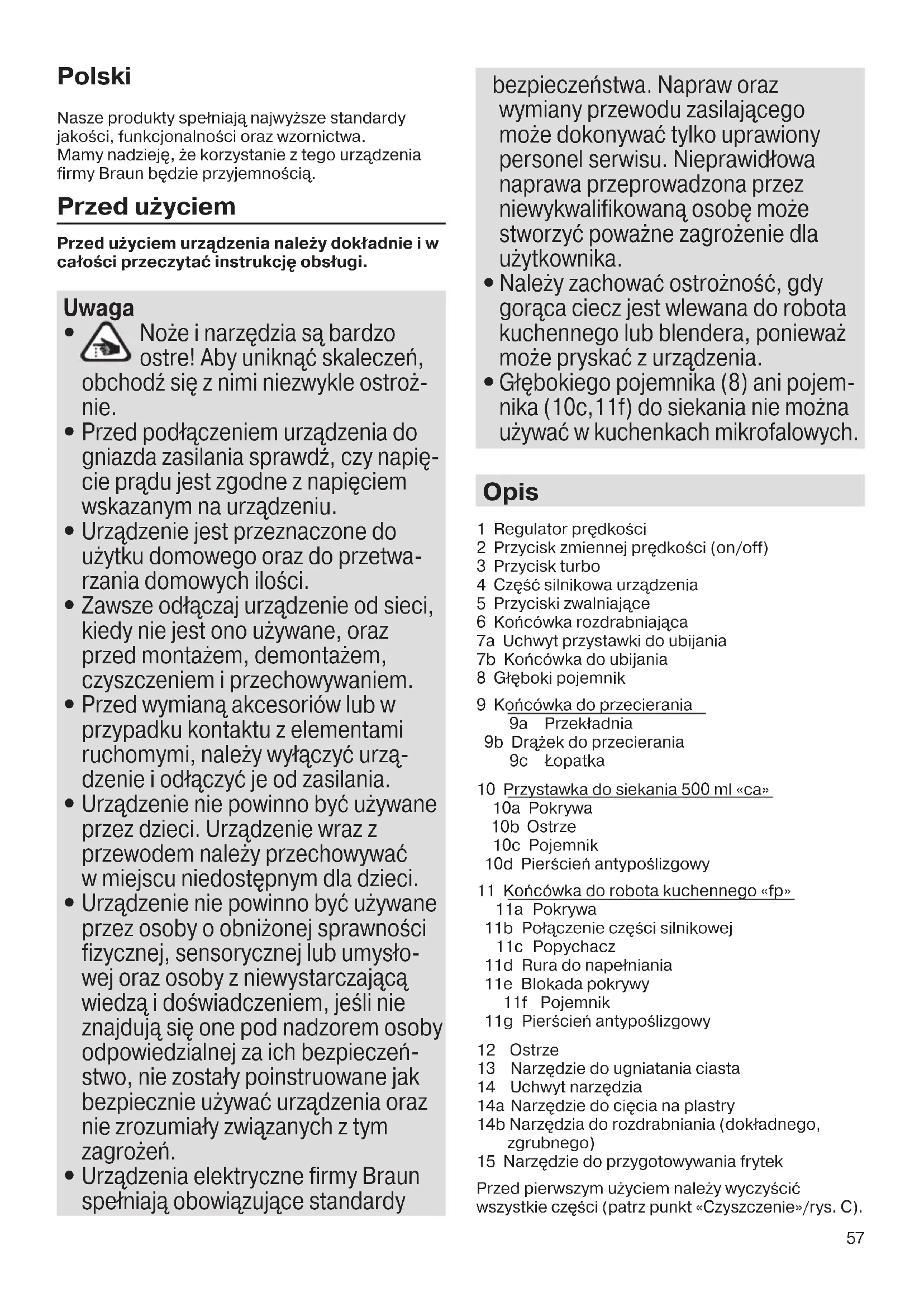 Urządzenia elektryczne firmy Braun spełniają obowiązujące standardy bezpieczeństwa. Napraw oraz wymiany przewodu zasilającego może dokonywać tylko uprawiony personel serwisu. Nieprawidłowa naprawa przeprowadzona przez niewykwalifikowaną osobę może stworzyć poważne zagrożenie dla użytkownika.