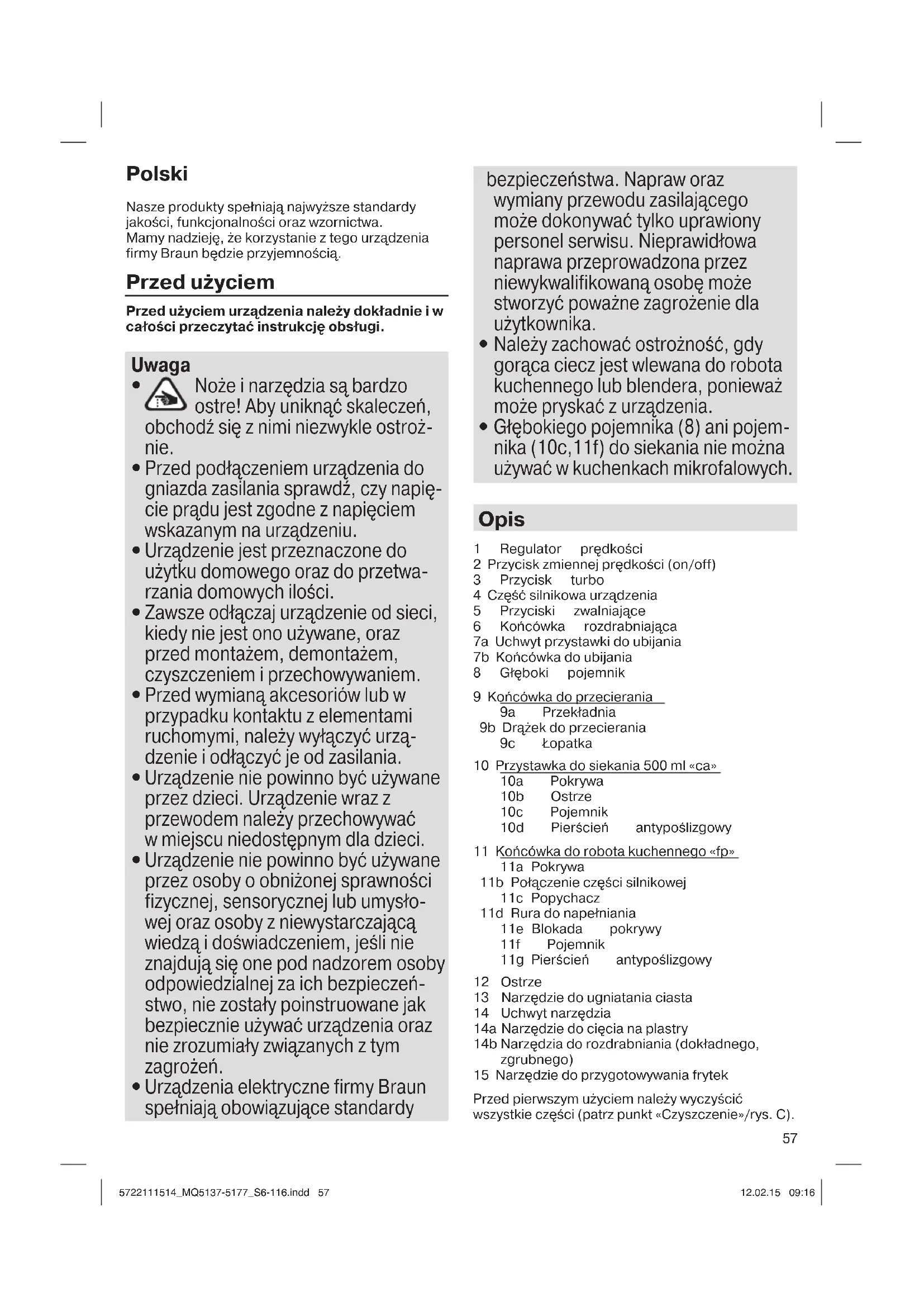 - Kontynuuj rozcieranie przez około 30 sekund Czyszczenie (C) Część mechaniczną (4) i przekładnie (7a, 9a) czyścić tylko wilgotną szmatką. Pokrywki można myć bieżącą wodą, ale nie należy ich zanurzać w wodzie ani myć w zmywarce. Wszystkie pozostałe części można myć w zmywarce. Jeśli na końcówce do przecierania zaschły resztki jedzenia, zdjąć łopatkę. Odmoczyć łopatkę i dolną część drążka końcówki do przecierania w ciepłej wodzie a potem dokładnie umyć. Aby dokładniej wyczyścić pierścienie antypoślizgowe, można je zdjąć z pojemników do siekania. Przygotowywanie produktów o dużej zawartości pigmentu (np. marchwi) może powodować przebarwienie części urządzenia. Przed umyciem przetrzyj te części olejem roślinnym. Dodatki (można kupować osobno, nie są dostępne we wszystkich krajach) MQ 10: Przystawka do ubijania śmietany, białek i gotowych deserów 5722111514_MQ5137-5177_S6-116.indd 605722111514_MQ5137-5177_S6-116.indd 60 12.02.15 09:1612.02.15 09:1661 MQ 20: Pojemnik o pojemności 350 ml do siekania ziół, cebuli, papryki chili, orzechów itp. MQ 30: Pojemnik o pojemności 500 ml do siekania marchwi, mięsa, cebuli itp. MQ 40: Pojemnik o pojemności 1250 ml do siekania, mieszania i miksowania oraz rozdrabniania lodu MQ 50: Końcówka do przecierania – do miksowania gotowanych warzyw i ziemniaków MQ 70: Końcówka do robota kuchennego – do siekania, miksowania, wyrabiania ciasta i tarcia Informacje mogą ulec zmianie bez uprzedzenia. Po zakończeniu eksploatacji produktu nie należy wyrzucać z odpadami komunalnymi. Należy go oddać do utylizacji do punktu serwisowego Braun lub odpowiedniego punktu zbiórki odpadów w kraju użytkowania. 5722111514_MQ5137-5177_S6-116.indd 615722111514_MQ5137-5177_S6-116.indd 61 12.02.15 09:1612.02.15 09:1662 Český Naše výrobky jsou konstruovány tak, aby splňovaly nejvyšší požadavky na kvalitu, funkčnost i vzhled. Věříme, že s novým domácím spotřebičem Braun budete naprosto spokojeni. Před použitím Než začnete přístroj používat, pečlivě si přečtěte celý tento návod. Pozor