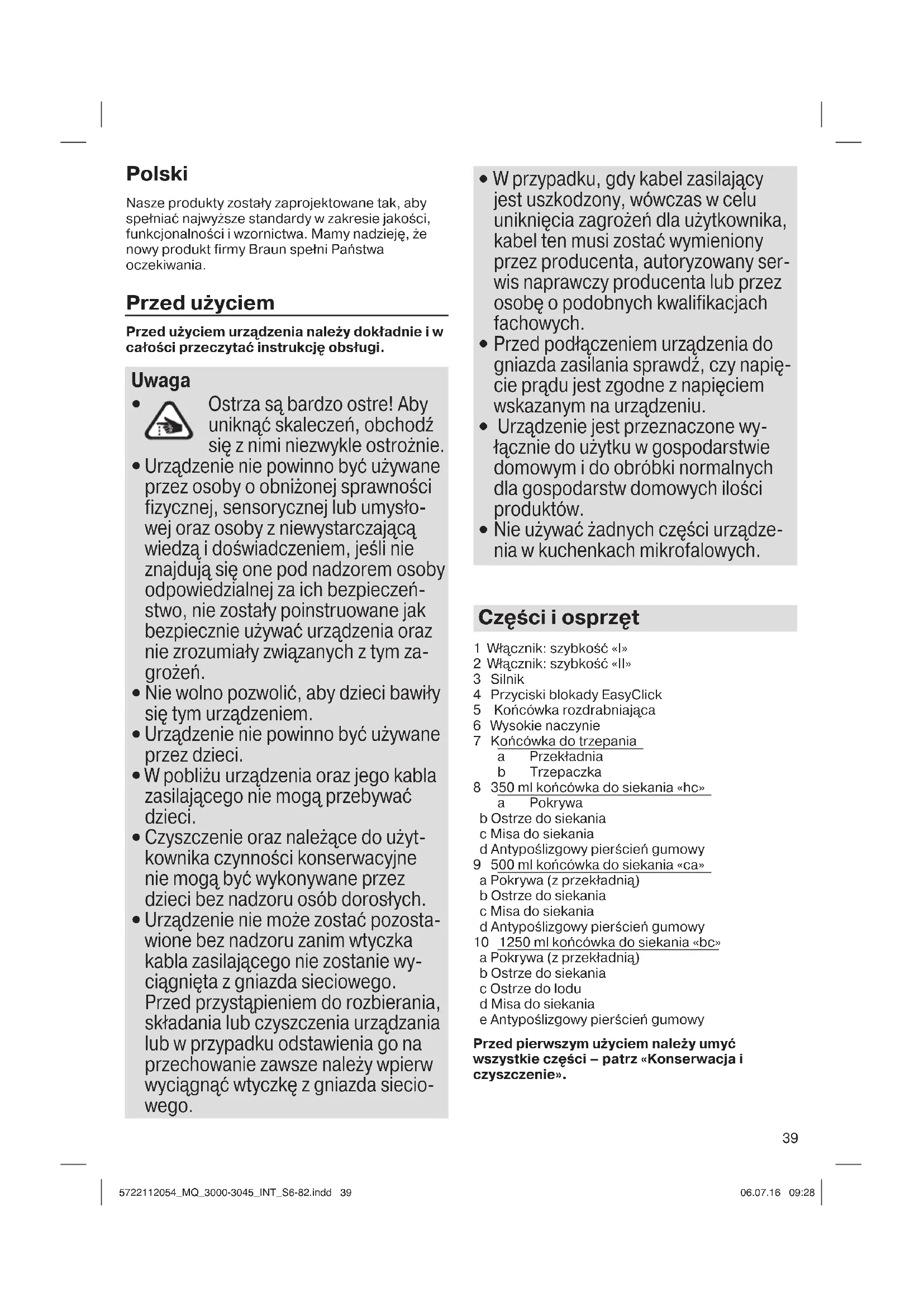 Nie używać żadnych części urządze- nia w kuchenkach mikrofalowych. Części i osprzęt 1 Włącznik: szybkość «I» 2 Włącznik: szybkość «II» 3 Silnik 4 Przyciski blokady EasyClick 5 Końcówka rozdrabniająca 6 Wysokie naczynie 7 Końcówka do trzepania a Przekładnia b Trzepaczka 8 350 ml końcówka do siekania «hc» a Pokrywa b Ostrze do siekania c Misa do siekania d Antypoślizgowy pierścień gumowy 9 500 ml końcówka do siekania «ca» a Pokrywa (z przekładnią) b Ostrze do siekania c Misa do siekania d Antypoślizgowy pierścień gumowy 10 1250 ml końcówka do siekania «bc» a Pokrywa (z przekładnią) b Ostrze do siekania c Ostrze do lodu d Misa do siekania e Antypoślizgowy pierścień gumowy Przed pierwszym użyciem należy umyć wszystkie części – patrz «Konserwacja i czyszczenie». 5722112054_MQ_3000-3045_INT_S6-82.indd 395722112054_MQ_3000-3045_INT_S6-82.indd 39 06.07.16 09:2806.07.16 09:2840 Jak korzystać z urządzenia Trzonek blendera (A) Blender doskonale sprawdza się podczas przygotowywania dipów, sosów, dressingów do sałatek, zup, pokarmów dla dzieci, a także drinków i koktajli mlecznych. Aby uzyskać najlepszy efekt miksowania urządzenie należy ustawić na najwyższe obroty. Montaż i obsługa