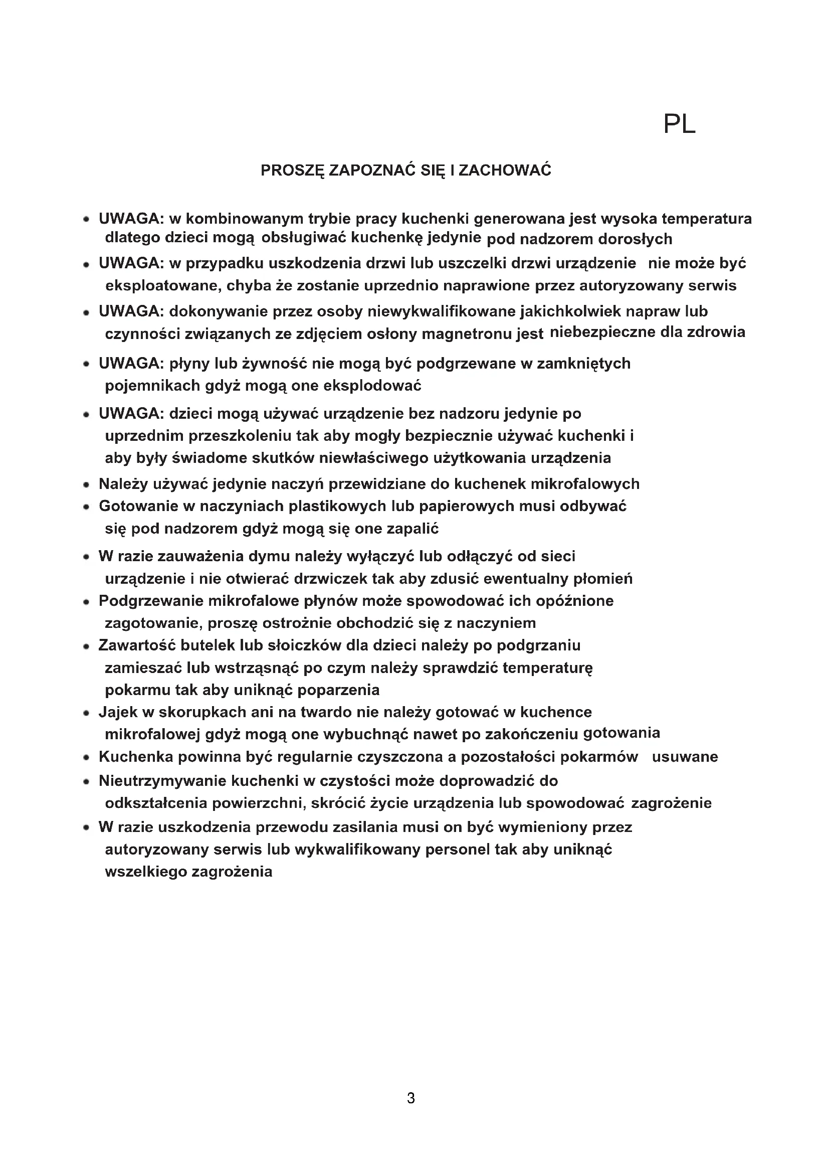 UWAGA: w kombinowanym trybie pracy kuchenki generowana jest wysoka temperatura dlatego dzieci mogą obsługiwać kuchenkę jedynie pod nadzorem dorosłych UWAGA: w przypadku uszkodzenia drzwi lub uszczelki drzwi urządzenie nie może być eksploatowane, chyba że zostanie uprzednio naprawione przez autoryzowany serwis UWAGA: dokonywanie przez osoby niewykwalifikowane jakichkolwiek napraw lub czynności związanych ze zdjęciem osłony magnetronu jest niebezpieczne dla zdrowia UWAGA: płyny lub żywność nie mogą być podgrzewane w zamkniętych pojemnikach gdyż mogą one eksplodować UWAGA: dzieci mogą używać urządzenie bez nadzoru jedynie po uprzednim przeszkoleniu tak aby mogły bezpiecznie używać kuchenki i aby były świadome skutków niewłaściwego użytkowania urządzenia Należy używać jedynie naczyń przewidziane do kuchenek mikrofalowych Gotowanie w naczyniach plastikowych lub papierowych musi odbywać się pod nadzorem gdyż mogą się one zapalić W razie zauważenia dymu należy wyłączyć lub odłączyć od sieci urządzenie i nie otwierać drzwiczek tak aby zdusić ewentualny płomień Podgrzewanie mikrofalowe płynów może spowodować ich opóźnione zagotowanie, proszę ostrożnie obchodzić się z naczyniem Zawartość butelek lub słoiczków dla dzieci należy po podgrzaniu zamieszać lub wstrząsnąć po czym należy sprawdzić temperaturę pokarmu tak aby uniknąć poparzenia Jajek w skorupkach ani na twardo nie należy gotować w kuchence mikrofalowej gdyż mogą one wybuchnąć nawet po zakończeniu gotowania Kuchenka powinna być regularnie czyszczona a pozostałości pokarmów usuwane Nieutrzymywanie kuchenki w czystości może doprowadzić do odkształcenia powierzchni, skrócić życie urządzenia lub spowodować zagrożenie W razie uszkodzenia przewodu zasilania musi on być wymieniony przez autoryzowany serwis lub wykwalifikowany personel tak aby uniknąć wszelkiego zagrożenia