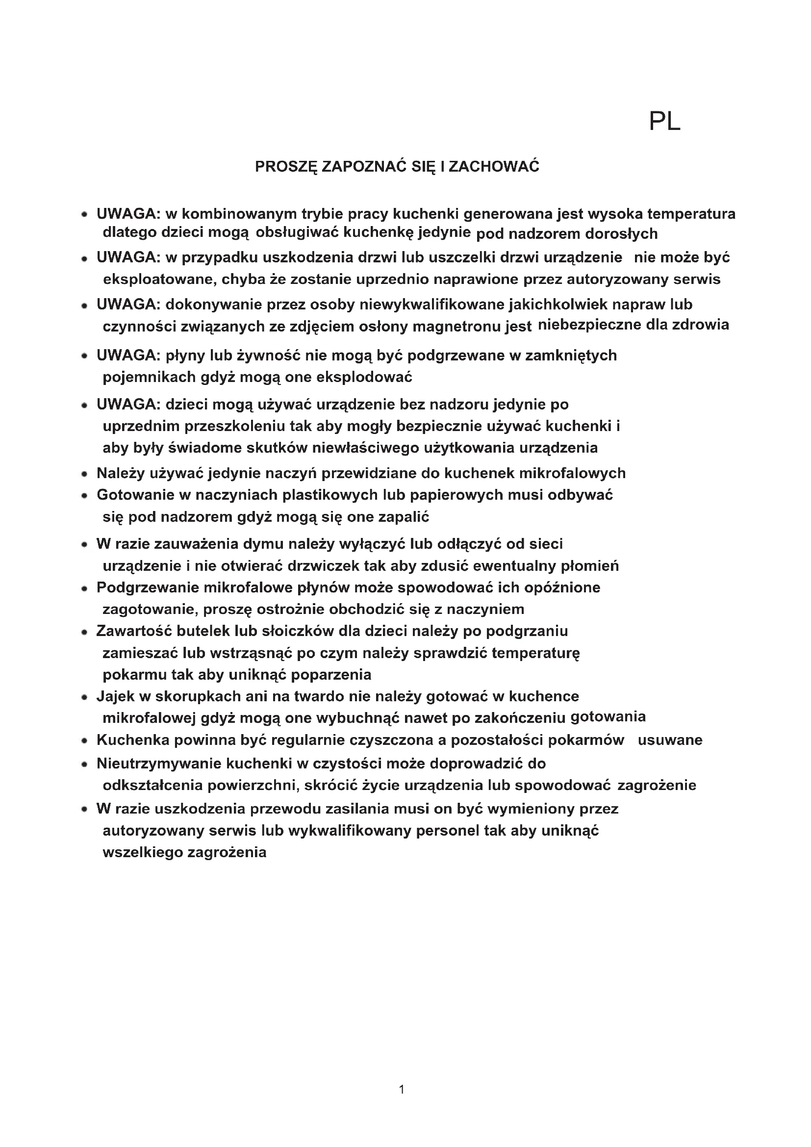 CIRCUIT SOUMIS A CHANGER SANS PRÉAVISPROSZĘ ZAPOZNAĆ SIĘ I ZACHOWAĆ UWAGA: w kombinowanym trybie pracy kuchenki generowana jest wysoka temperatura dlatego dzieci mogą obsługiwać kuchenkę jedynie pod nadzorem dorosłych UWAGA: w przypadku uszkodzenia drzwi lub uszczelki drzwi urządzenie nie może być eksploatowane, chyba że zostanie uprzednio naprawione przez autoryzowany serwis UWAGA: dokonywanie przez osoby niewykwalifikowane jakichkolwiek napraw lub czynności związanych ze zdjęciem osłony magnetronu jest niebezpieczne dla zdrowia UWAGA: płyny lub żywność nie mogą być podgrzewane w zamkniętych pojemnikach gdyż mogą one eksplodować UWAGA: dzieci mogą używać urządzenie bez nadzoru jedynie po uprzednim przeszkoleniu tak aby mogły bezpiecznie używać kuchenki i aby były świadome skutków niewłaściwego użytkowania urządzenia Należy używać jedynie naczyń przewidziane do kuchenek mikrofalowych Gotowanie w naczyniach plastikowych lub papierowych musi odbywać się pod nadzorem gdyż mogą się one zapalić W razie zauważenia dymu należy wyłączyć lub odłączyć od sieci urządzenie i nie otwierać drzwiczek tak aby zdusić ewentualny płomień Podgrzewanie mikrofalowe płynów może spowodować ich opóźnione zagotowanie, proszę ostrożnie obchodzić się z naczyniem Zawartość butelek lub słoiczków dla dzieci należy po podgrzaniu zamieszać lub wstrząsnąć po czym należy sprawdzić temperaturę pokarmu tak aby uniknąć poparzenia Jajek w skorupkach ani na twardo nie należy gotować w kuchence mikrofalowej gdyż mogą one wybuchnąć nawet po zakończeniu gotowania Kuchenka powinna być regularnie czyszczona a pozostałości pokarmów usuwane Nieutrzymywanie kuchenki w czystości może doprowadzić do odkształcenia powierzchni, skrócić życie urządzenia lub spowodować zagrożenie W razie uszkodzenia przewodu zasilania musi on być wymieniony przez autoryzowany serwis lub wykwalifikowany personel tak aby uniknąć wszelkiego zagrożenia