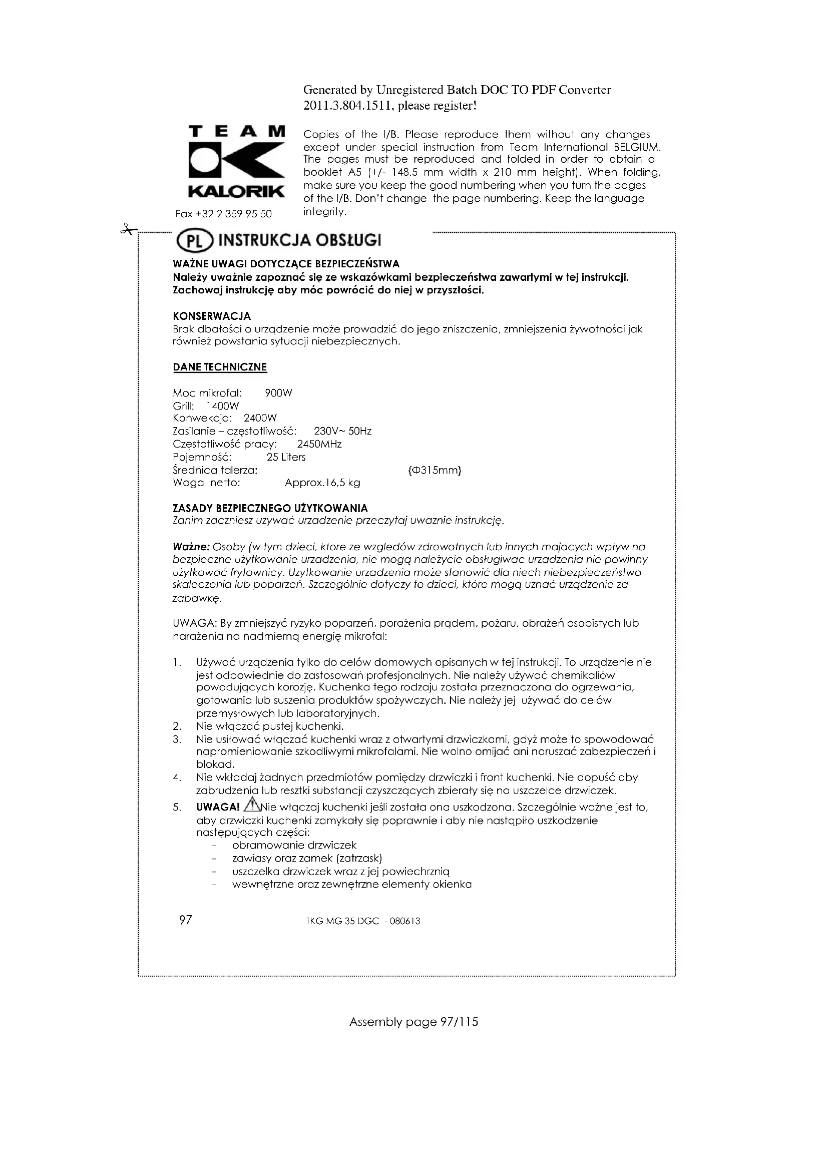 aby drzwiczki kuchenki zamykały się poprawnie i aby nie nastąpiło uszkodzenie następujących części: - obramowanie drzwiczek - zawiasy oraz zamek (zatrzask) - uszczelka drzwiczek wraz z jej powiechrznią - wewnętrzne oraz zewnętrzne elementy okienkaGenerated by Unregistered Batch DOC TO PDF Converter 2011.3.804.1511, please register! Copies of the I/B. Please reproduce them without any changes except under special instruction from Team International BELGIUM. The pages must be reproduced and folded in order to obtain a booklet A5 (+/- 148.5 mm width x 210 mm height). When folding, make sure you keep the good numbering when you turn the pages of the I/B. Don‟t change the page numbering. Keep the language integrity.