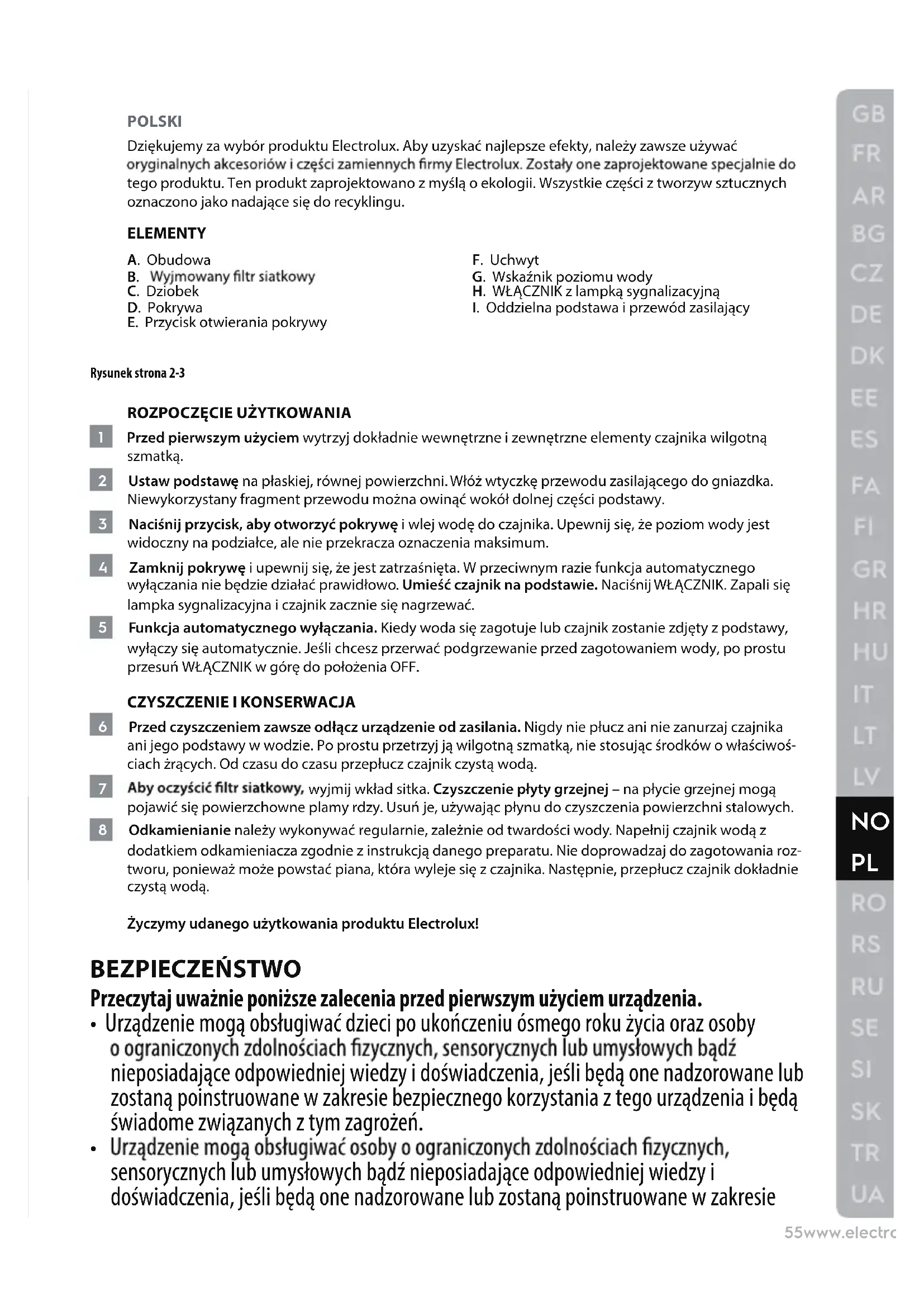 Dziekujemy za wybor produktu Electrolux. Aby uzyskać najlepsze efekty, naleź yawsze uzywać oryginalnych akcesoriow i czeci zamiennych firmy Electrolux. Zostały one zaprojektowane SPECIALNIO do tego produktu. Ten produkt zaprojektowano z myślą o ekologii. Wszystkie czeci z tworzyw sztucznych oznaczono jako nadajace są do recyklingeru.