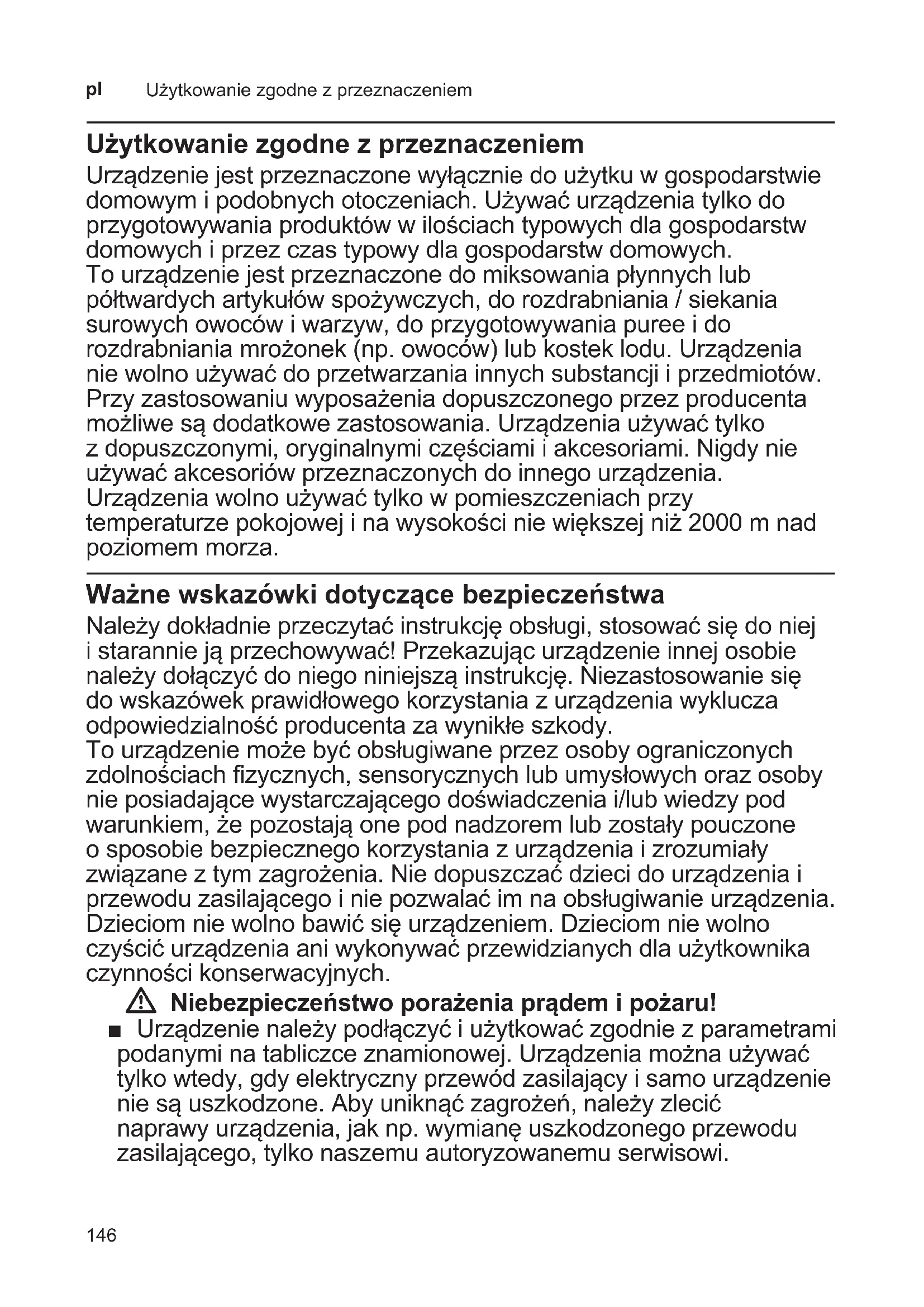 Użytkowanie zgodne z przeznaczeniem Urządzenie jest przeznaczone wyłącznie do użytku w gospodarstwie domowym i podobnych otoczeniach. Używać urządzenia tylko do przygotowywania produktów w ilościach typowych dla gospodarstw domowych i przez czas typowy dla gospodarstw domowych. To urządzenie jest przeznaczone do miksowania płynnych lub półtwardych artykułów spożywczych, do rozdrabniania / siekania surowych owoców i warzyw, do przygotowywania puree i do rozdrabniania mrożonek (np. owoców) lub kostek lodu. Urządzenia nie wolno używać do przetwarzania innych substancji i przedmiotów. Przy zastosowaniu wyposażenia dopuszczonego przez producenta możliwe są dodatkowe zastosowania. Urządzenia używać tylko z dopuszczonymi, oryginalnymi częściami i akcesoriami. Nigdy nie używać akcesoriów przeznaczonych do innego urządzenia. Urządzenia wolno używać tylko w pomieszczeniach przy temperaturze pokojowej i na wysokości nie większej niż 2000 m nad poziomem morza. Ważne wskazówki dotyczące bezpieczeństwa Należy dokładnie przeczytać instrukcję obsługi, stosować się do niej i starannie ją przechowywać! Przekazując urządzenie innej osobie należy dołączyć do niego niniejszą instrukcję. Niezastosowanie się do wskazówek prawidłowego korzystania z urządzenia wyklucza odpowiedzialność producenta za wynikłe szkody. To urządzenie może być obsługiwane przez osoby ograniczonych zdolnościach zycznych, sensorycznych lub umysłowych oraz osoby nie posiadające wystarczającego doświadczenia i/lub wiedzy pod warunkiem, że pozostają one pod nadzorem lub zostały pouczone o sposobie bezpiecznego korzystania z urządzenia i zrozumiały związane z tym zagrożenia. Nie dopuszczać dzieci do urządzenia i przewodu zasilającego i nie pozwalać im na obsługiwanie urządzenia. Dzieciom nie wolno bawić się urządzeniem. Dzieciom nie wolno czyścić urządzenia ani wykonywać przewidzianych dla użytkownika czynności konserwacyjnych. W Niebezpieczeństwo porażenia prądem i pożaru! ■ Urządzenie należy podłączyć i użytkować zgodnie z parametrami podanymi na tabliczce znamionowej. Urządzenia można używać tylko wtedy, gdy elektryczny przewód zasilający i samo urządzenie nie są uszkodzone. Aby uniknąć zagrożeń, należy zlecić naprawy urządzenia, jak np. wymianę uszkodzonego przewodu zasilającego, tylko naszemu autoryzowanemu serwisowi.147 Ważne wskazówki dotyczące bezpieczeństwa