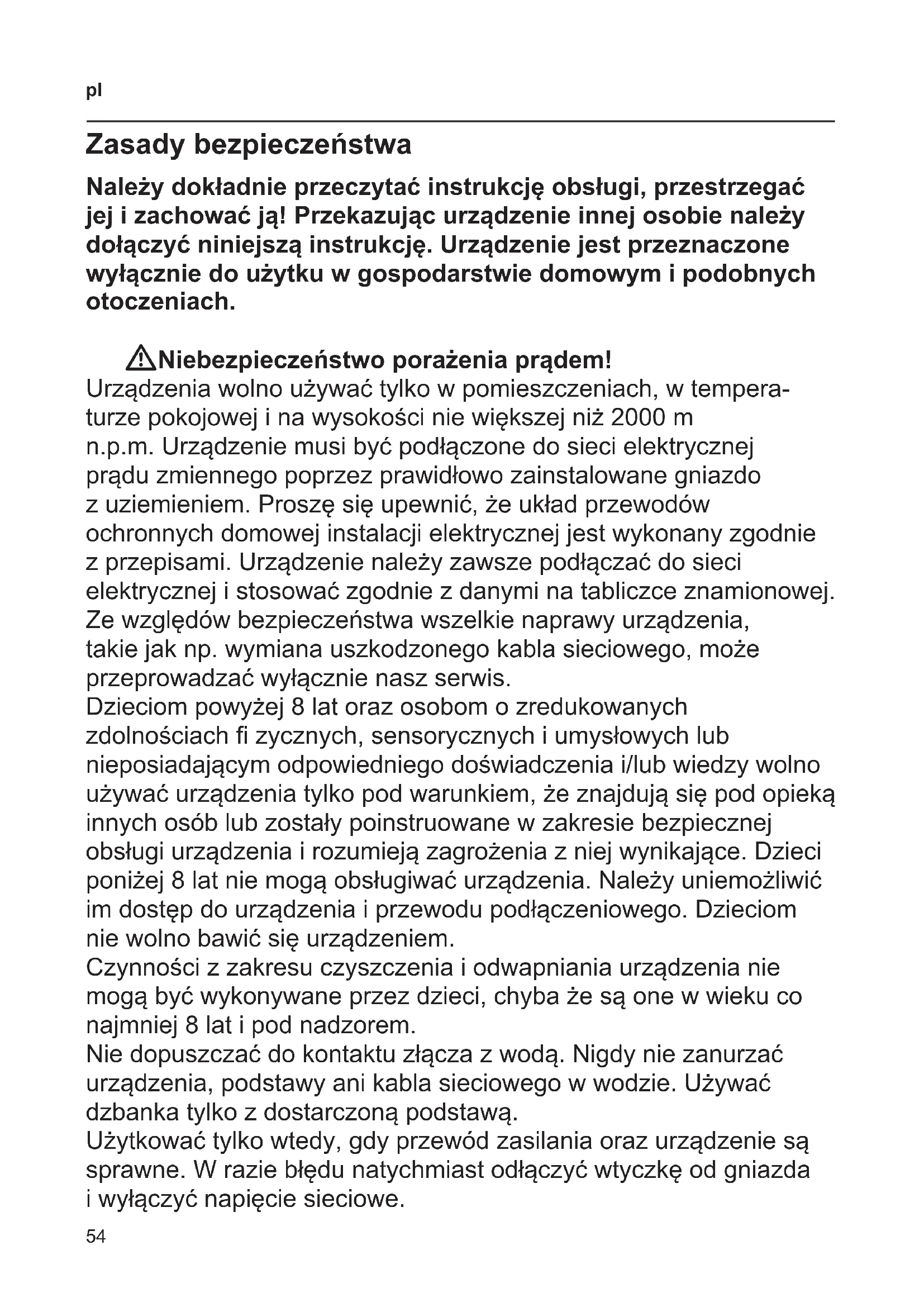 Zasady bezpieczeństwa Należy dokładnie przeczytać instrukcję obsługi, przestrzegać jej i zachować ją! Przekazując urządzenie innej osobie należy dołączyć niniejszą instrukcję. Urządzenie jest przeznaczone wyłącznie do użytku w gospodarstwie domowym i podobnych otoczeniach. WNiebezpieczeństwo porażenia prądem! Urządzenia wolno używać tylko w pomieszczeniach, w tempera- turze pokojowej i na wysokości nie większej niż 2000 m n.p.m. Urządzenie musi być podłączone do sieci elektrycznej prądu zmiennego poprzez prawidłowo zainstalowane gniazdo z uziemieniem. Proszę się upewnić, że układ przewodów ochronnych domowej instalacji elektrycznej jest wykonany zgodnie z przepisami. Urządzenie należy zawsze podłączać do sieci elektrycznej i stosować zgodnie z danymi na tabliczce znamionowej. Ze względów bezpieczeństwa wszelkie naprawy urządzenia, takie jak np. wymiana uszkodzonego kabla sieciowego, może przeprowadzać wyłącznie nasz serwis. Dzieciom powyżej 8 lat oraz osobom o zredukowanych zdolnościach zycznych, sensorycznych i umysłowych lub nieposiadającym odpowiedniego doświadczenia i/lub wiedzy wolno używać urządzenia tylko pod warunkiem, że znajdują się pod opieką innych osób lub zostały poinstruowane w zakresie bezpiecznej obsługi urządzenia i rozumieją zagrożenia z niej wynikające. Dzieci poniżej 8 lat nie mogą obsługiwać urządzenia. Należy uniemożliwić im dostęp do urządzenia i przewodu podłączeniowego. Dzieciom nie wolno bawić się urządzeniem. Czynności z zakresu czyszczenia i odwapniania urządzenia nie mogą być wykonywane przez dzieci, chyba że są one w wieku co najmniej 8 lat i pod nadzorem. Nie dopuszczać do kontaktu złącza z wodą. Nigdy nie zanurzać urządzenia, podstawy ani kabla sieciowego w wodzie. Używać dzbanka tylko z dostarczoną podstawą. Użytkować tylko wtedy, gdy przewód zasilania oraz urządzenie są sprawne. W razie błędu natychmiast odłączyć wtyczkę od gniazda i wyłączyć napięcie sieciowe.55