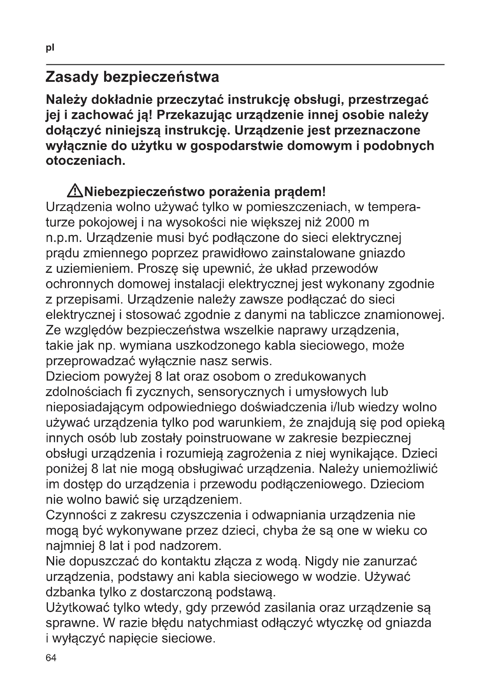 Zasady bezpieczeństwa Należy dokładnie przeczytać instrukcję obsługi, przestrzegać jej i zachować ją! Przekazując urządzenie innej osobie należy dołączyć niniejszą instrukcję. Urządzenie jest przeznaczone wyłącznie do użytku w gospodarstwie domowym i podobnych otoczeniach. WNiebezpieczeństwo porażenia prądem! Urządzenia wolno używać tylko w pomieszczeniach, w tempera- turze pokojowej i na wysokości nie większej niż 2000 m n.p.m. Urządzenie musi być podłączone do sieci elektrycznej prądu zmiennego poprzez prawidłowo zainstalowane gniazdo z uziemieniem. Proszę się upewnić, że układ przewodów ochronnych domowej instalacji elektrycznej jest wykonany zgodnie z przepisami. Urządzenie należy zawsze podłączać do sieci elektrycznej i stosować zgodnie z danymi na tabliczce znamionowej. Ze względów bezpieczeństwa wszelkie naprawy urządzenia, takie jak np. wymiana uszkodzonego kabla sieciowego, może przeprowadzać wyłącznie nasz serwis. Dzieciom powyżej 8 lat oraz osobom o zredukowanych zdolnościach zycznych, sensorycznych i umysłowych lub nieposiadającym odpowiedniego doświadczenia i/lub wiedzy wolno używać urządzenia tylko pod warunkiem, że znajdują się pod opieką innych osób lub zostały poinstruowane w zakresie bezpiecznej obsługi urządzenia i rozumieją zagrożenia z niej wynikające. Dzieci poniżej 8 lat nie mogą obsługiwać urządzenia. Należy uniemożliwić im dostęp do urządzenia i przewodu podłączeniowego. Dzieciom nie wolno bawić się urządzeniem. Czynności z zakresu czyszczenia i odwapniania urządzenia nie mogą być wykonywane przez dzieci, chyba że są one w wieku co najmniej 8 lat i pod nadzorem. Nie dopuszczać do kontaktu złącza z wodą. Nigdy nie zanurzać urządzenia, podstawy ani kabla sieciowego w wodzie. Używać dzbanka tylko z dostarczoną podstawą. Użytkować tylko wtedy, gdy przewód zasilania oraz urządzenie są sprawne. W razie błędu natychmiast odłączyć wtyczkę od gniazda i wyłączyć napięcie sieciowe.65
