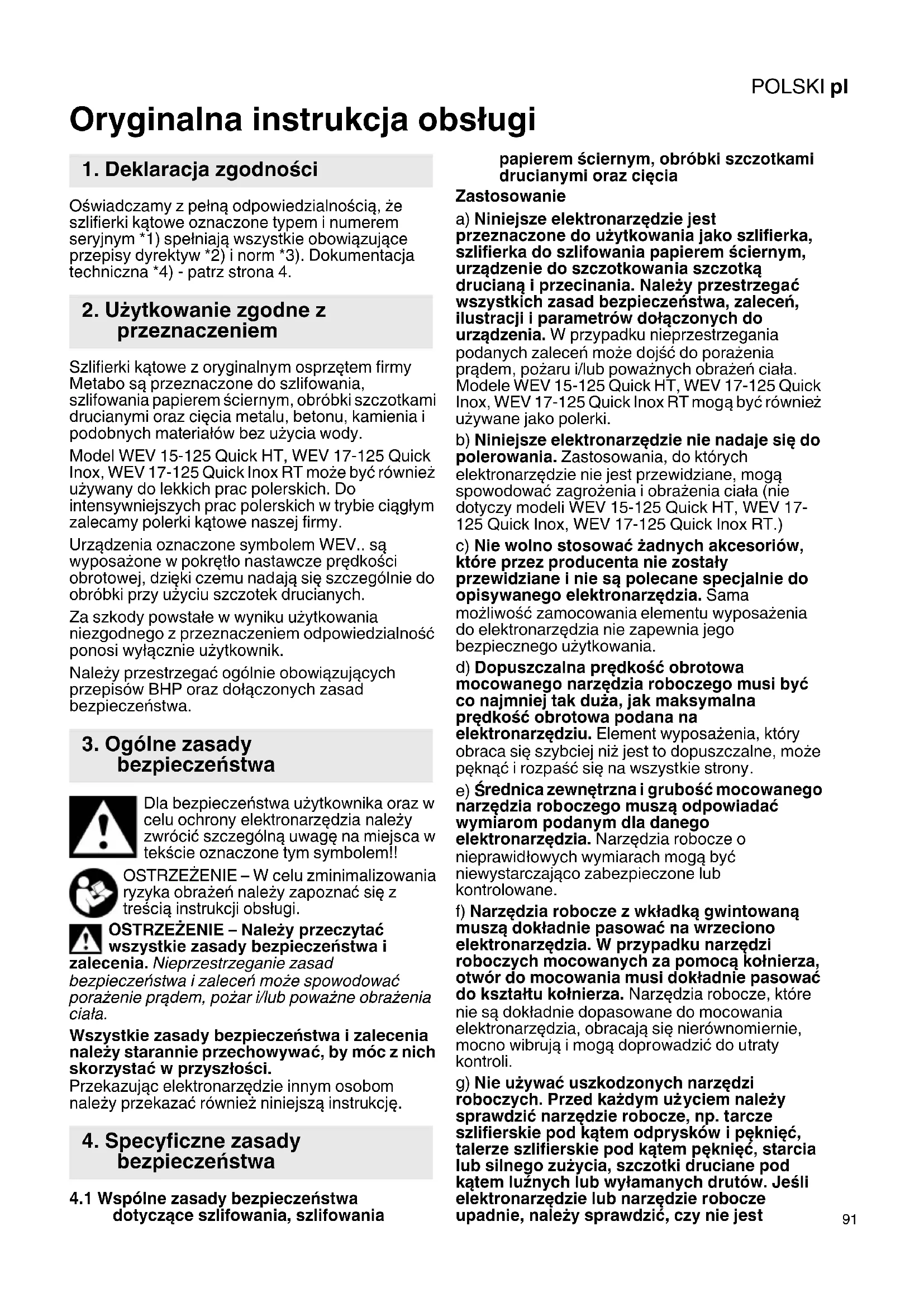 Oryginalna instrukcja obsługi Oświadczamy z pełną odpowiedzialnością, że szlifierki kątowe oznaczone typem i numerem seryjnym *1) spełniają wszystkie obowiązujące przepisy dyrektyw *2) i norm *3). Dokumentacja techniczna *4) - patrz strona 4. Szlifierki kątowe z oryginalnym osprzętem firmy Metabo są przeznaczone do szlifowania, szlifowania papierem ściernym, obróbki szczotkami drucianymi oraz cięcia metalu, betonu, kamienia i podobnych materiałów bez użycia wody. Model WEV 15-125 Quick HT, WEV 17-125 Quick Inox, WEV 17-125 Quick Inox RT może być również używany do lekkich prac polerskich. Do intensywniejszych prac polerskich w trybie ciągłym zalecamy polerki kątowe naszej firmy. Urządzenia oznaczone symbolem WEV.. są wyposażone w pokrętło nastawcze prędkości obrotowej, dzięki czemu nadają się szczególnie do obróbki przy użyciu szczotek drucianych. Za szkody powstałe w wyniku użytkowania niezgodnego z przeznaczeniem odpowiedzialność ponosi wyłą cznie użytkownik. Należy przestrzegać ogólnie obowiązujących przepisów BHP oraz dołączonych zasad bezpieczeństwa. Dla bezpieczeństwa użytkownika oraz w celu ochrony elektronarzędzia należy zwrócić szczególną uwagę na miejsca w tekście oznaczone tym symbolem!! OSTRZEŻENIE – W celu zminimalizowania ryzyka obrażeń należy zapoznać się z treścią instrukcji obsługi. OSTRZEŻENIE – Należy przeczytać wszystkie zasady bezpieczeństwa i zalecenia. Nieprzestrzeganie zasad bezpieczeństwa i zaleceń może spowodować porażenie prądem, pożar i/lub poważne obrażenia ciała. Wszystkie zasady bezpieczeństwa i zalecenia należy starannie przechowywa ć, by móc z nich skorzystać w przyszłości. Przekazując elektronarzędzie innym osobom należy przekazać również niniejszą instrukcję.