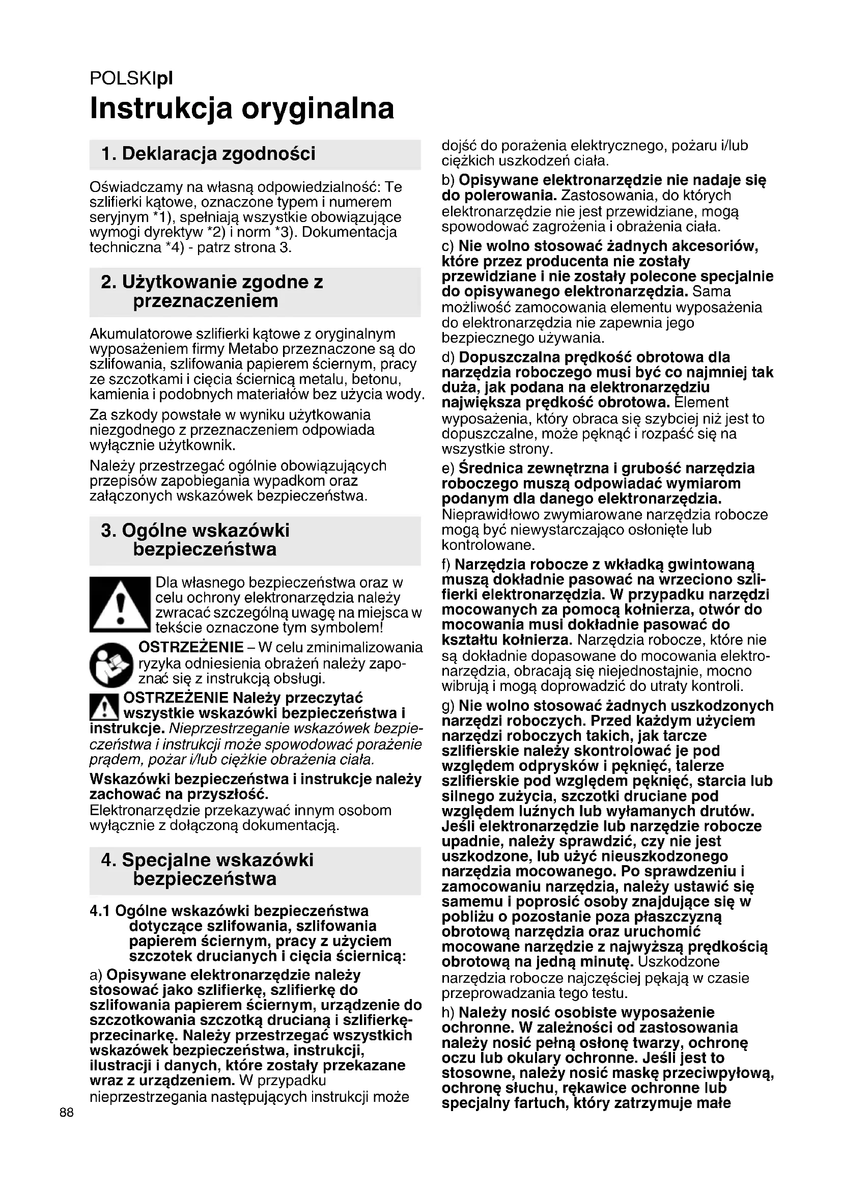 Instrukcja oryginalna Oświadczamy na własną odpowiedzialność: Te szlifierki kątowe, oznaczone typem i numerem seryjnym *1), spełniają wszystkie obowiązujące wymogi dyrektyw *2) i norm *3). Dokumentacja techniczna *4) - patrz strona 3. Akumulatorowe szlifierki kątowe z oryginalnym wyposażeniem firmy Metabo przeznaczone są do szlifowania, szlifowania papierem ściernym, pracy ze szczotkami i cięcia ściernicą metalu, betonu, kamienia i podobnych materiałów bez użycia wody. Za szkody powstałe w wyniku użytkowania niezgodnego z przeznaczeniem odpowiada wyłącznie użytkownik. Należy przestrzegać ogólnie obowiązujących przepisów zapobiegania wypadkom oraz załączonych wskazówek bezpieczeństwa. Dla własnego bezpieczeństwa oraz w celu ochrony elektronarzędzia należy zwracać szczególną uwagę na miejsca w tekście oznaczone tym symbolem! OSTRZEŻENIE – W celu zminimalizowania ryzyka odniesienia obrażeń należy zapo- zna ć się z instrukcją obsługi. OSTRZEŻENIE Należy przeczytać wszystkie wskazówki bezpieczeństwa i instrukcje. Nieprzestrzeganie wskazówek bezpie- czeństwa i instrukcji może spowodować porażenie prądem, pożar i/lub ciężkie obrażenia ciała. Wskazówki bezpieczeństwa i instrukcje należy zachować na przyszłość. Elektronarzędzie przekazywać innym osobom wyłącznie z dołączoną dokumentacją.