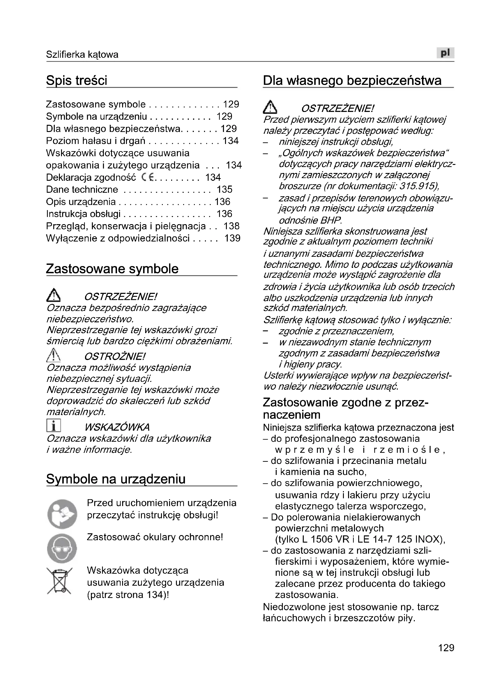 w niezawodnym stanie technicznym zgodnym z zasadami bezpieczeństwa i higieny pracy. Usterki wywierające wpływ na bezpieczeńst- wo należy niezwłocznie usunąć. Zastosowanie zgodne z przez- naczeniem Niniejsza szlifierka kątowa przeznaczona jest – do profesjonalnego zastosowania wprzemyśle i rzemiośle, – do szlifowania i przecinania metalu i kamienia na sucho, – do szlifowania powierzchniowego, usuwania rdzy i lakieru przy użyciu elastycznego talerza wsporczego, – Do polerowania nielakierowanych powierzchni metalowych (tylko L 1506 VR i LE 14-7 125 INOX), – do zastosowania z narzędziami szli- fierskimi i wyposażeniem, które wymie- nione są w tej instrukcji obsługi lub zalecane przez producenta do takiego zastosowania. Niedozwolone jest stosowanie np. tarcz łańcuchowych i brzeszczotów piły.Szlifierka kątowa