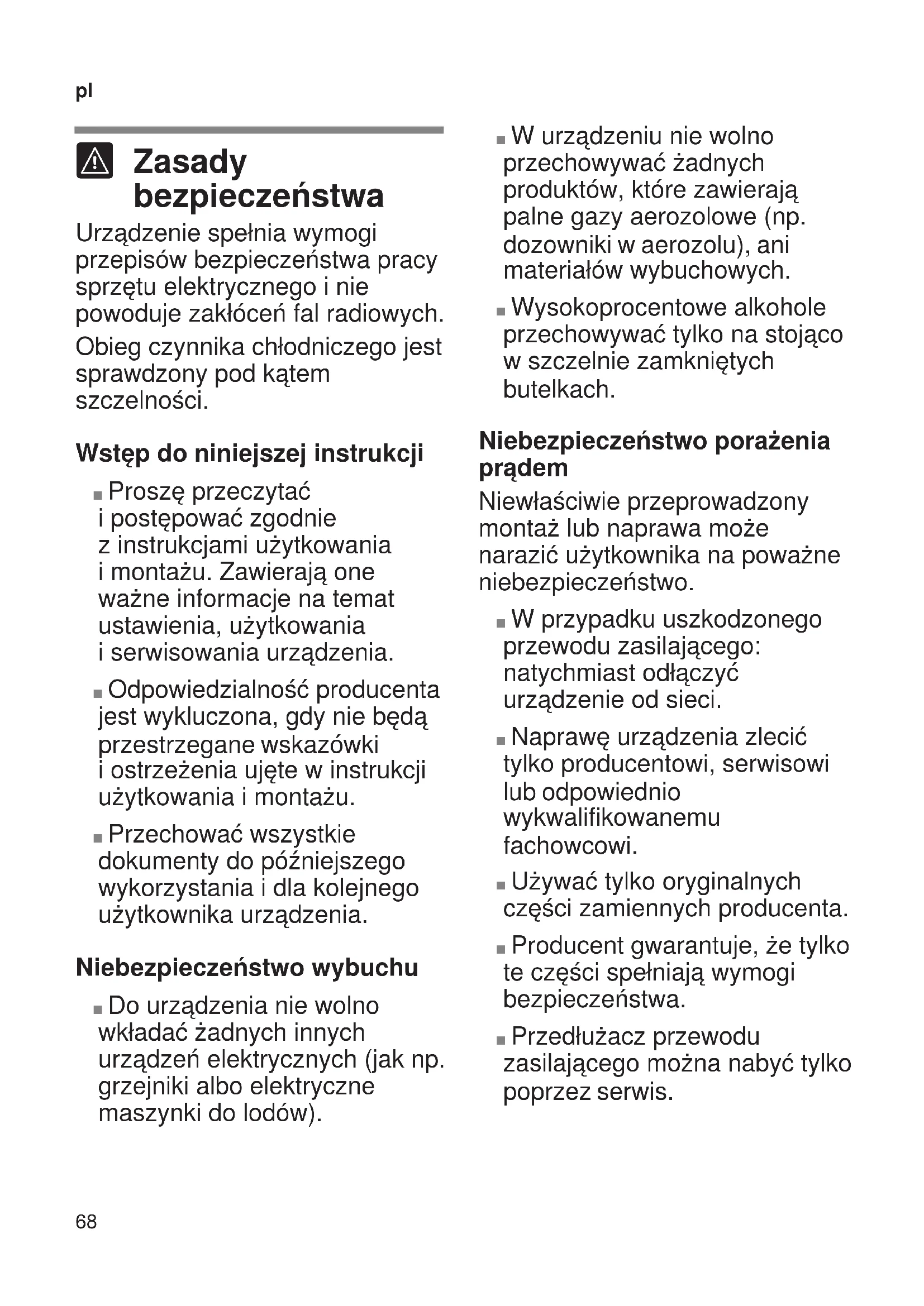 Urządzenie spełnia wymogi przepisów bezpieczeństwa pracy sprzętu elektrycznego i nie powoduje zakłóceń fal radiowych. Obieg czynnika chłodniczego jest sprawdzony pod kątem szczelności. Wstęp do niniejszej instrukcji ■ Proszę przeczytać i postępować zgodnie z instrukcjami użytkowania i montażu. Zawierają one ważne informacje na temat ustawienia, użytkowania i serwisowania urządzenia. ■ Odpowiedzialność producenta jest wykluczona, gdy nie będą przestrzegane wskazówki i ostrzeżenia ujęte w instrukcji użytkowania i montażu. ■ Przechować wszystkie dokumenty do późniejszego wykorzystania i dla kolejnego użytkownika urządzenia. Niebezpieczeństwo wybuchu ■ Do urządzenia nie wolno wkładać żadnych innych urządzeń elektrycznych (jak np. grzejniki albo elektryczne maszynki do lodów). ■ W urządzeniu nie wolno przechowywać żadnych produktów, które zawierają palne gazy aerozolowe (np. dozowniki w aerozolu), ani materiałów wybuchowych. ■ Wysokoprocentowe alkohole przechowywać tylko na stojąco w szczelnie zamkniętych butelkach. Niebezpieczeństwo porażenia prądem Niewłaściwie przeprowadzony montaż lub naprawa może narazić użytkownika na poważne niebezpieczeństwo. ■ W przypadku uszkodzonego przewodu zasilającego: natychmiast odłączyć urządzenie od sieci. ■ Naprawę urządzenia zlecić tylko producentowi, serwisowi lub odpowiednio wykwalifikowanemu fachowcowi. ■ Używać tylko oryginalnych części zamiennych producenta. ■ Producent gwarantuje, że tylko te części spełniają wymogi bezpieczeństwa. ■ Przedłużacz przewodu zasilającego można nabyć tylko poprzez serwis.69
