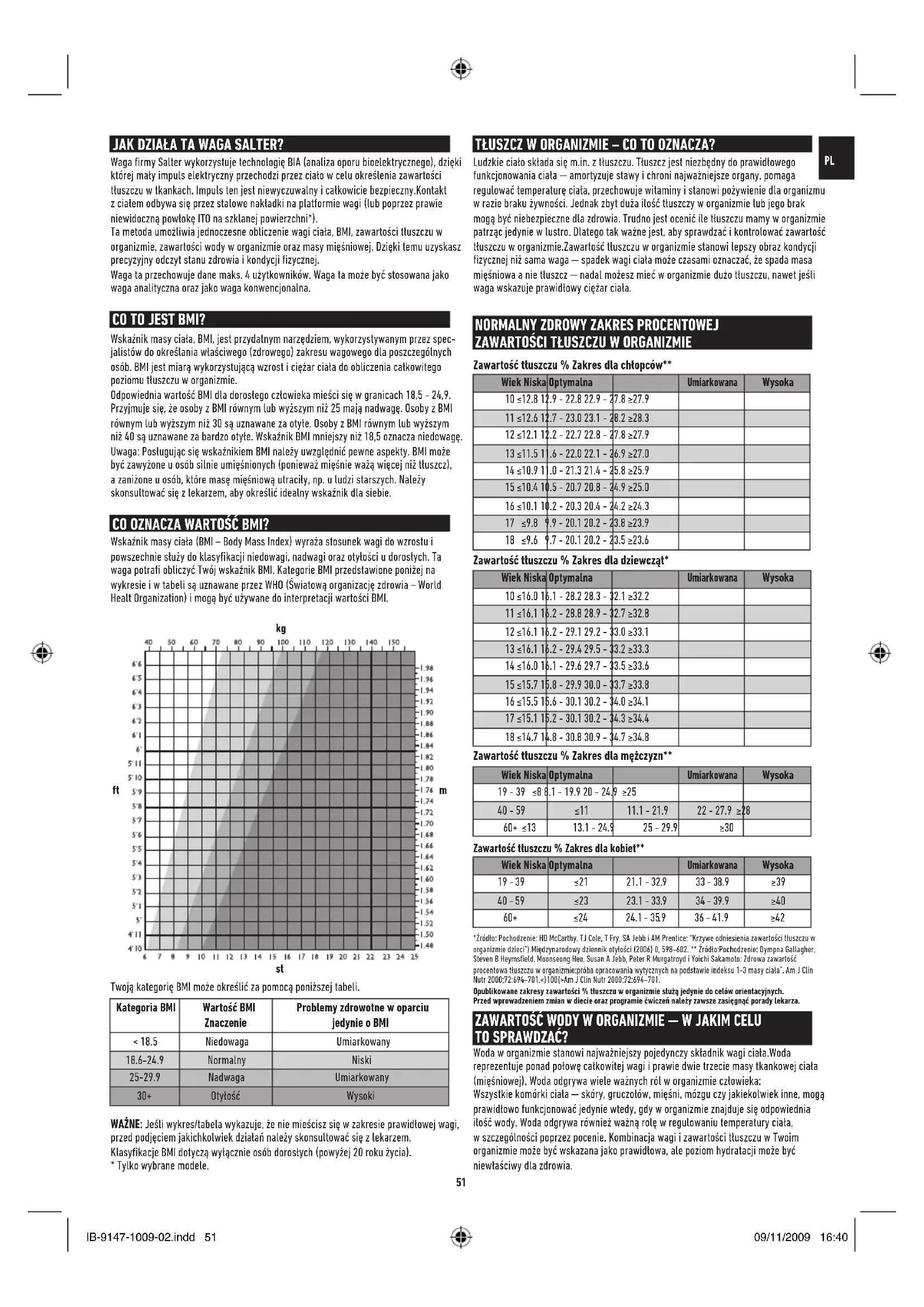 60+ ≤24 24.1 - 35.9 36 - 41.9 ≥42 *Źródło: Pochodzenie: HD McCarthy, TJ Cole, T Fry, SA Jebb i AM Prentice: “Krzywe odniesienia zawartości tłuszczu w organizmie dzieci”).Międzynarodowy dziennik otyłości (2006) 0, 598–602. ** Źródło:Pochodzenie: Dympna Gallagher, Steven B Heymsfield, Moonseong Heo, Susan A Jebb, Peter R Murgatroyd i Yoichi Sakamoto: Zdrowa zawartość procentowa tłuszczu w organizmie:próba opracowania wytycznych na podstawie indeksu 1-3 masy ciała”. Am J Clin Nutr 2000;72:694–701.<}100{>Am J Clin Nutr 2000;72:694–701. Opublikowane zakresy zawartości % tłuszczu w organizmie służą jedynie do celów orientacyjnych. Przed wprowadzeniem zmian w diecie oraz programie ćwiczeń należy zawsze zasięgnąć porady lekarza. CO TO JEST BMI? Wskaźnik masy ciała, BMI, jest przydatnym narzędziem, wykorzystywanym przez spec- jalistów do określania właściwego (zdrowego) zakresu wagowego dla poszczególnych osób. BMI jest miarą wykorzystującą wzrost i ciężar ciała do obliczenia całkowitego poziomu tłuszczu w organizmie. Odpowiednia wartość BMI dla dorosłego człowieka mieści się w granicach 18,5 - 24,9. Przyjmuje się, że osoby z BMI równym lub wyższym niż 25 mają nadwagę. Osoby z BMI równym lub wyższym niż 30 są uznawane za otyłe. Osoby z BMI równym lub wyższym niż 40 są uznawane za bardzo otyłe. Wskaźnik BMI mniejszy niż 18,5 oznacza niedowagę. Uwaga: Posługując się wskaźnikiem BMI należy uwzględnić pewne aspekty. BMI może być zawyżone u osób silnie umięśnionych (ponieważ mięśnie ważą więcej niż tłuszcz), a zaniżone u osób, które masę mięśniową utraciły, np. u ludzi starszych. Należy skonsultować się z lekarzem, aby określić idealny wskaźnik dla siebie. CO OZNACZA WARTOŚĆ BMI? Wskaźnik masy ciała (BMI – Body Mass Index) wyraża stosunek wagi do wzrostu i powszechnie służy do klasyfikacji niedowagi, nadwagi oraz otyłości u dorosłych. Ta waga potrafi obliczyć Twój wskaźnik BMI. Kategorie BMI przedstawione poniżej na wykresie i w tabeli są uznawane przez WHO (Światową organizację zdrowia – World Healt Organization) i mogą być używane do interpretacji wartości BMI. Twoją kategorię BMI może określić za pomocą poniższej tabeli. Kategoria BMI Wartość BMI Znaczenie Problemy zdrowotne w oparciu jedynie o BMI < 18.5 Niedowaga Umiarkowany 18.6-24.9 Normalny Niski 25-29.9 Nadwaga Umiarkowany 30+ Otyłość Wysoki WAŻNE: Jeśli wykres/tabela wykazuje, że nie mieścisz się w zakresie prawidłowej wagi, przed podjęciem jakichkolwiek działań należy skonsultować się z lekarzem. Klasyfikacje BMI dotyczą wyłącznie osób dorosłych (powyżej 20 roku życia).