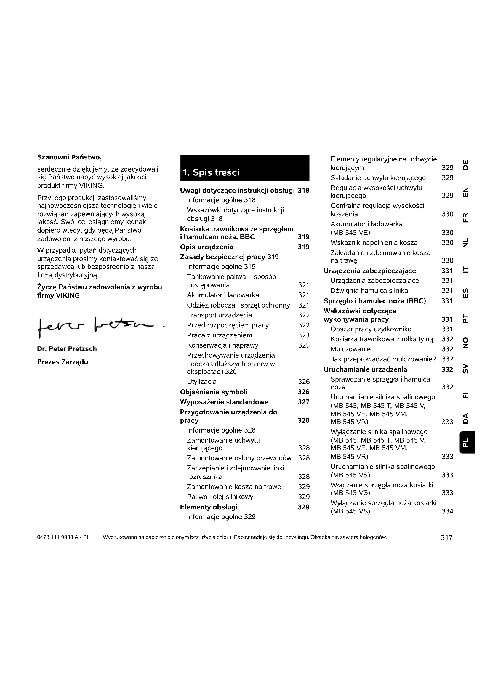 DEENFRNLITESPTNOSVFIDA PL 0478 111 9930 A - PL Szanowni Państwo, serdecznie dziękujemy, że zdecydowali się Państwo nabyć wysokiej jakości produkt firmy VIKING. Przy jego produkcji zastosowaliśmy najnowocześniejszą technologię i wiele rozwiązań zapewniających wysoką jakość. Swój cel osiągniemy jednak dopiero wtedy, gdy będą Państwo zadowoleni z naszego wyrobu. W przypadku pytań dotyczących urządzenia prosimy kontaktować się ze sprzedawcą lub bezpośrednio z naszą firmą dystrybucyjną. Życzę Państwu zadowolenia z wyrobu firmy VIKING. Prezes Zarządu Wydrukowano na papierze bielonym bez użycia chloru. Papier nadaje się do recyklingu. Okładka nie zawiera halogenów.