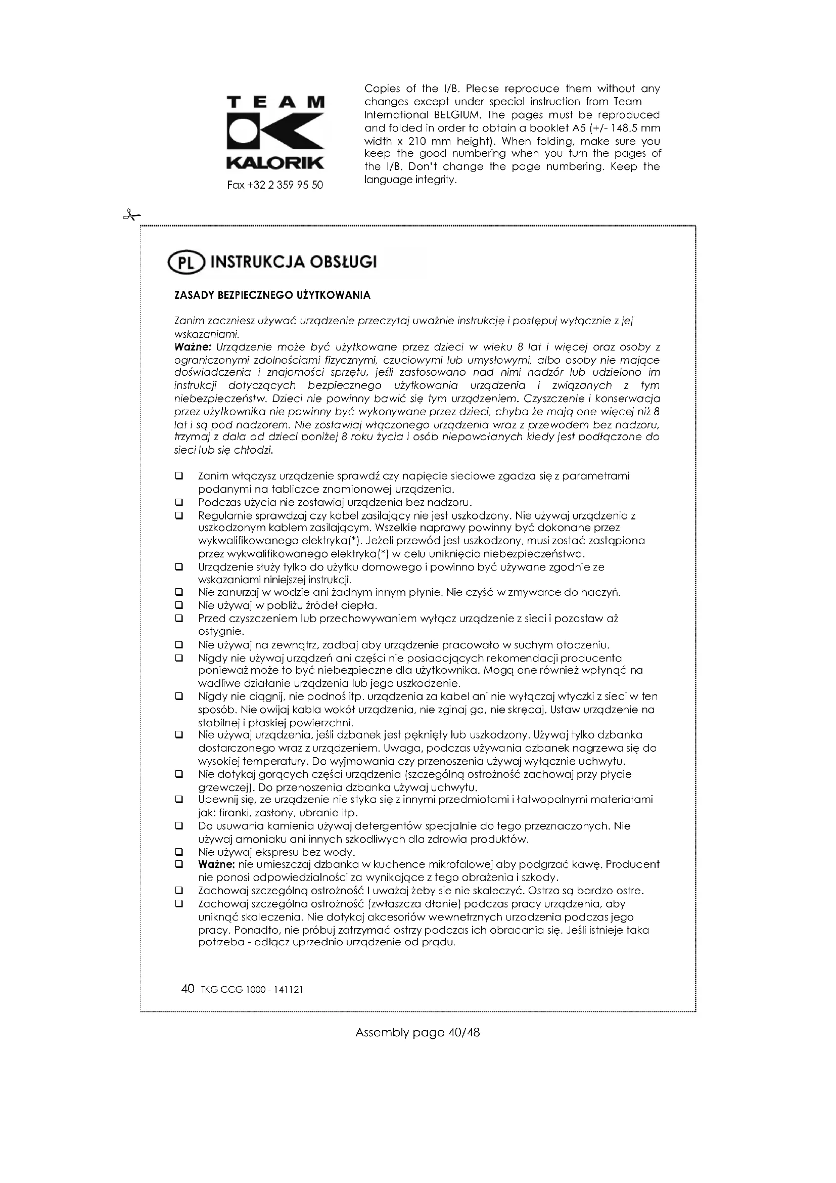 Zanim zaczniesz używać urządzenie przeczytaj uważnie instrukcję i postępuj wyłącznie z jej wskazaniami. Ważne: Urządzenie może być użytkowane przez dzieci w wieku 8 lat i więcej oraz osoby z ograniczonymi zdolnościami fizycznymi, czuciowymi lub umysłowymi, albo osoby nie mające doświadczenia i znajomości sprzętu, jeśli zastosowano nad nimi nadzór lub udzielono im instrukcji dotyczą cych bezpiecznego użytkowania urządzenia i związanych z tym niebezpieczeństw. Dzieci nie powinny bawić się tym urządzeniem. Czyszczenie i konserwacja przez użytkownika nie powinny być wykonywane przez dzieci, chyba że mają one więcej niż 8 lat i są pod nadzorem. Nie zostawiaj włączonego urządzenia wraz z przewodem bez nadzoru, trzymaj z dala od dzieci poniżej 8 roku życia i osób niepowołanych kiedy jest podłączone do sieci lub się chłodzi. q Zanim włączysz urządzenie sprawdź czy napięcie sieciowe zgadza się z parametrami podanymi na tabliczce znamionowej urządzenia. q Podczas użycia nie zostawiaj urządzenia bez nadzoru. q Regularnie sprawdzaj czy kabel zasilający nie jest uszkodzony. Nie używaj urządzenia z uszkodzonym kablem zasilającym. Wszelkie naprawy powinny być dokonane przez wykwalifikowanego elektryka(*). Jeżeli przewód jest uszkodzony, musi zostać zastąpiona przez wykwalifikowanego elektryka(*) w celu uniknięcia niebezpieczeństwa. q Urządzenie służy tylko do użytku domowego i powinno być używane zgodnie ze wskazaniami niniejszej instrukcji. q Nie zanurzaj w wodzie ani żadnym innym płynie. Nie czyść w zmywarce do naczyń. q Nie używaj w pobliżu źródeł ciepła. q Przed czyszczeniem lub przechowywaniem wyłącz urządzenie z sieci i pozostaw aż ostygnie. q Nie używaj na zewnątrz, zadbaj aby urządzenie pracowało w suchym otoczeniu. q Nigdy nie używaj urządzeń ani części nie posiadających rekomendacji producenta ponieważ może to być niebezpieczne dla użytkownika. Mogą one również wpłynąć na wadliwe działanie urządzenia lub jego uszkodzenie. q Nigdy nie ciągnij, nie podnoś itp. urządzenia za kabel ani nie wyłączaj wtyczki z sieci w ten sposób. Nie owijaj kabla wokół urządzenia, nie zginaj go, nie skręcaj. Ustaw urządzenie na stabilnej i płaskiej powierzchni. q Nie używaj urządzenia, jeśli dzbanek jest pęknięty lub uszkodzony. Używaj tylko dzbanka dostarczonego wraz z urządzeniem. Uwaga, podczas używania dzbanek nagrzewa się do wysokiej temperatury. Do wyjmowania czy przenoszenia używaj wyłącznie uchwytu. q Nie dotykaj gorących części urządzenia (szczególną ostrożność zachowaj przy płycie grzewczej). Do przenoszenia dzbanka używaj uchwytu. q Upewnij się, ze urządzenie nie styka się z innymi przedmiotami i łatwopalnymi materiałami jak: firanki, zasłony, ubranie itp. q Do usuwania kamienia używaj detergentów specjalnie do tego przeznaczonych. Nie używaj amoniaku ani innych szkodliwych dla zdrowia produktów. q Nie używaj ekspresu bez wody. q Ważne: nie umieszczaj dzbanka w kuchence mikrofalowej aby podgrzać kawę. Producent nie ponosi odpowiedzialności za wynikające z tego obrażenia i szkody. q Zachowaj szczególną ostrożność I uważaj żeby sie nie skaleczyć. Ostrza są bardzo ostre. q Zachowaj szczególna ostrożność (zwłaszcza dłonie) podczas pracy urządzenia, aby uniknąć skaleczenia. Nie dotykaj akcesoriów wewnetrznych urzadzenia podczas jego pracy. Ponadto, nie próbuj zatrzymać ostrzy podczas ich obracania się. Jeśli istnieje taka potrzeba - odłącz uprzednio urządzenie od prądu.# Copies of the I/B. Please reproduce them without any changes except under special instruction from Team International BELGIUM. The pages must be reproduced and folded in order to obtain a booklet A5 (+/- 148.5 mm width x 210 mm height). When folding, make sure you keep the good numbering when you turn the pages of the I/B. Don’t change the page numbering. Keep the language integrity.