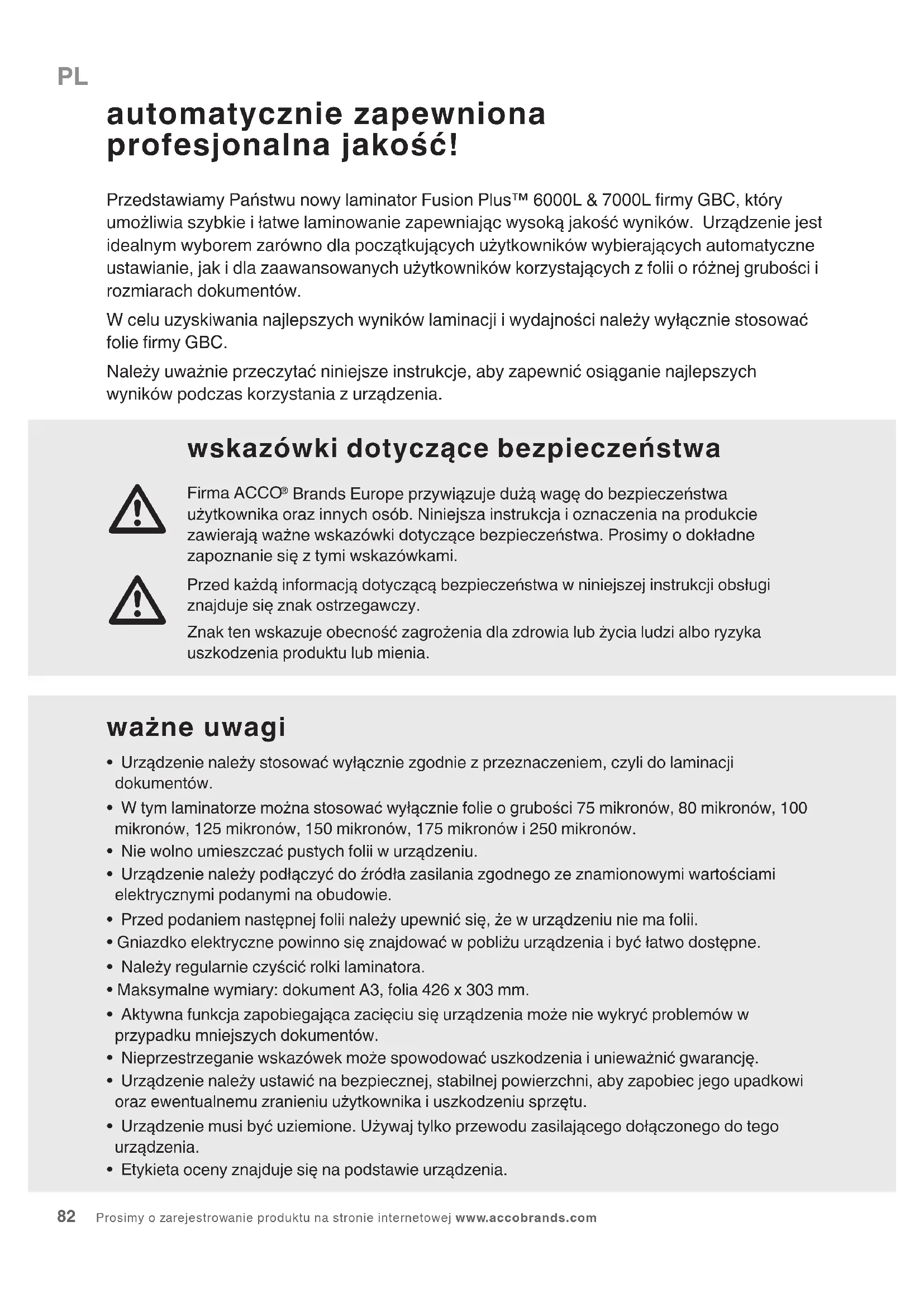 - Urządzenie należy stosować wyłącznie zgodnie z przeznaczeniem, czyli do laminacji dokumentów.• W tym laminatorze można stosować wyłącznie folie o grubości 75 mikronów, 80 mikronów, 100 mikronów, 125 mikronów, 150 mikronów, 175 mikronów i 250 mikronów.• Nie wolno umieszczać pustych folii w urządzeniu.• Urządzenie należy podłączyć do źródła zasilania zgodnego ze znamionowymi wartościami elektrycznymi podanymi na obudowie.• Przed podaniem następnej folii należy upewnić się, że w urządzeniu nie ma folii.• Gniazdko elektryczne powinno się znajdować w pobliżu urządzenia i być łatwo dostępne.• Należy regularnie czyścić rolki laminatora.• Maksymalne wymiary: dokument A3, folia 426 x 303 mm.• Aktywna funkcja zapobiegająca zacięciu się urządzenia może nie wykryć problemów w przypadku mniejszych dokumentów.• Nieprzestrzeganie wskazówek może spowodować uszkodzenia i unieważnić gwarancję.• Urządzenie należy ustawić na bezpiecznej, stabilnej powierzchni, aby zapobiec jego upadkowi oraz ewentualnemu zranieniu użytkownika i uszkodzeniu sprzętu.• Urządzenie musi być uziemione. Używaj tylko przewodu zasilającego dołączonego do tego urządzenia.• Etykieta oceny znajduje się na podstawie urządzenia. automatycznie zapewniona profesjonalna jakość! Przedstawiamy Państwu nowy laminator Fusion Plus™ 6000L & 7000L rmy GBC, który umożliwia szybkie i łatwe laminowanie zapewniając wysoką jakość wyników. Urządzenie jest idealnym wyborem zarówno dla początkujących użytkowników wybierających automatyczne ustawianie, jak i dla zaawansowanych użytkowników korzystających z folii o różnej grubości i rozmiarach dokumentów. W celu uzyskiwania najlepszych wyników laminacji i wydajności należy wyłącznie stosować folie rmy GBC. Należy uważnie przeczytać niniejsze instrukcje, aby zapewnić osiąganie najlepszych wyników podczas korzystania z urządzenia.PL serwis Nie wolno usiłować przeprowadzać samodzielnie przeglądów technicznych lub napraw laminatora folii. Należy odłączyć urządzenie od zasilania i skontaktować się z autoryzowanym przedstawicielem serwisu rmy GBC w przypadku potrzeby jakichkolwiek napraw. FUSION PLUS