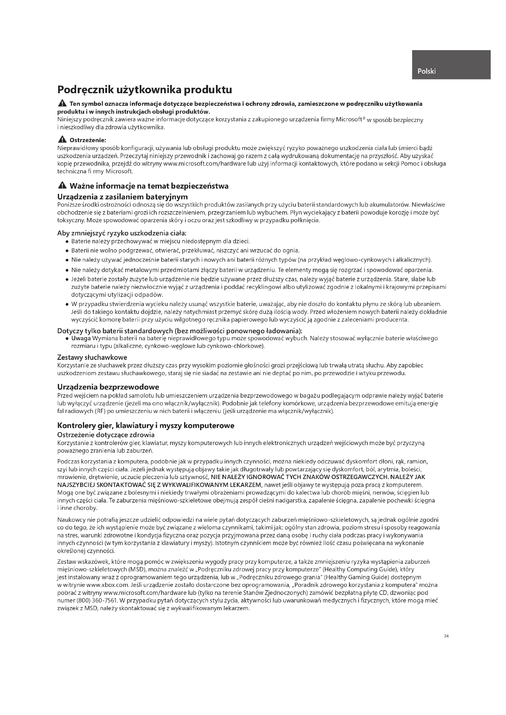 w sposób bezpieczny i nieszkodliwy dla zdrowia użytkownika. Ostrzeżenie: Nieprawidłowy sposób konfi guracji, używania lub obsługi produktu może zwiększyć ryzyko poważnego uszkodzenia ciała lub śmierci bądź uszkodzenia urządzeń. Przeczytaj niniejszy przewodnik i zachowaj go razem z całą wydrukowaną dokumentację na przyszłość. Aby uzyskać kopię przewodnika, przejdź do witryny www.microsoft.com/hardware lub użyj informacji kontaktowych, które podano w sekcji Pomoc i obsługa techniczna fi rmy Microsoft. Ważne informacje na temat bezpieczeństwa Urządzenia z zasilaniem bateryjnym Poniższe środki ostrożności odnoszą się do wszystkich produktów zasilanych przy użyciu baterii standardowych lub akumulatorów. Niewłaściwe obchodzenie się z bateriami grozi ich rozszczelnieniem, przegrzaniem lub wybuchem. Płyn wyciekający z baterii powoduje korozję i może być toksyczny. Może spowodować oparzenia skóry i oczu oraz jest szkodliwy w przypadku połknięcia. Aby zmniejszyć ryzyko uszkodzenia ciała: ● Baterie należy przechowywać w miejscu niedostępnym dla dzieci. ● Baterii nie wolno podgrzewać, otwierać, przekłuwać, niszczyć ani wrzucać do ognia. ● Nie należy używać jednocześnie baterii starych i nowych ani baterii różnych typów (na przykład węglowo-cynkowych i alkalicznych). ● Nie należy dotykać metalowymi przedmiotami złączy baterii w urządzeniu. Te elementy mogą się rozgrzać i spowodować oparzenia. ● Jeżeli baterie zostały zużyte lub urządzenie nie będzie używane przez dłuższy czas, należy wyjąć baterie z urządzenia. Stare, słabe lub zużyte baterie należy niezwłocznie wyjąć z urządzenia i poddać recyklingowi albo utylizować zgodnie z lokalnymi i krajowymi przepisami dotyczącymi utylizacji odpadów. ● W przypadku stwierdzenia wycieku należy usunąć wszystkie baterie, uważając, aby nie doszło do kontaktu płynu ze skórą lub ubraniem. Jeśli do takiego kontaktu dojdzie, należy natychmiast przemyć skórę dużą ilością wody. Przed włożeniem nowych baterii należy dokładnie wyczyścić komorę baterii przy użyciu wilgotnego ręcznika papierowego lub wyczyścić ją zgodnie z zaleceniami producenta. Dotyczy tylko baterii standardowych (bez możliwości ponownego ładowania): ● Uwaga Wymiana baterii na baterię nieprawidłowego typu może spowodować wybuch. Należy stosować wyłącznie baterie właściwego rozmiaru i typu (alkaliczne, cynkowo-węglowe lub cynkowo-chlorkowe). Zestawy słuchawkowe Korzystanie ze słuchawek przez dłuższy czas przy wysokim poziomie głośności grozi przejściową lub trwałą utratą słuchu. Aby zapobiec uszkodzeniom zestawu słuchawkowego, staraj się nie siadać na zestawie ani nie deptać po nim, po przewodzie i wtyku przewodu. Urządzenia bezprzewodowe Przed wejściem na pokład samolotu lub umieszczeniem urządzenia bezprzewodowego w bagażu podlegającym odprawie należy wyjąć baterie lub wyłączyć urządzenie (jeżeli ma ono włącznik/wyłącznik). Podobnie jak telefony komórkowe, urządzenia bezprzewodowe emitują energię fal radiowych (RF) po umieszczeniu w nich baterii i włączeniu (jeśli urządzenie ma włącznik/wyłącznik). Kontrolery gier, klawiatury i myszy komputerowe Ostrzeżenie dotyczące zdrowia Korzystanie z kontrolerów gier, klawiatur, myszy komputerowych lub innych elektronicznych urządzeń wejściowych może być przyczyną poważnego zranienia lub zaburzeń. Podczas korzystania z komputera, podobnie jak w przypadku innych czynności, można niekiedy odczuwać dyskomfort dłoni, rąk, ramion, szyi lub innych części ciała. Jeżeli jednak występują objawy takie jak długotrwały lub powtarzający się dyskomfort, ból, arytmia, boleści, mrowienie, drętwienie, uczucie pieczenia lub sztywność, NIE NALEŻY IGNOROWAĆ TYCH ZNAKÓW OSTRZEGAWCZYCH. NALEŻY JAK NAJSZYBCIEJ SKONTAKTOWAĆ SIĘ Z WYKWALIFIKOWANYM LEKARZEM, nawet jeśli objawy te występują poza pracą z komputerem. Mogą one być związane z bolesnymi i niekiedy trwałymi obrażeniami prowadzącymi do kalectwa lub chorób mięśni, nerwów, ścięgien lub innych części ciała. Te zaburzenia mięś niowo-szkieletowe obejmują zespół cieśni nadgarstka, zapalenie ścięgna, zapalenie pochewki ścięgna i inne choroby. Naukowcy nie potrafi ą jeszcze udzielić odpowiedzi na wiele pytań dotyczących zaburzeń mięśniowo-szkieletowych, są jednak ogólnie zgodni co do tego, że ich wystąpienie może być związane z wieloma czynnikami, takimi jak: ogólny stan zdrowia, poziom stresu i sposoby reagowania na stres, warunki zdrowotne i kondycja fi zyczna oraz pozycja przyjmowana przez daną osobę i ruchy ciała podczas pracy i wykonywania innych czynności (w tym korzystania z klawiatury i myszy). Istotnym czynnikiem może być również ilość czasu poświęcana na wykonanie określonej czynności. Zestaw wskazówek, które mogą pomóc w zwiększeniu wygody pracy przy komputerze, a także zmniejszeniu ryzyka wystąpienia zaburzeń mięśniowo-szkieletowych (MSD), można znaleźć w „Podręczniku zdrowej pracy przy komputerze” (Healthy Computing Guide), który jest instalowany wraz z oprogramowaniem tego urządzenia, lub w „Podręczniku zdrowego grania” (Healthy Gaming Guide) dostępnym w witrynie www.xbox.com. Jeśli urządzenie zostało dostarczone bez oprogramowania, „Poradnik zdrowego korzystania z komputera” można pobrać z witryny www.microsoft.com/hardware lub (tylko na terenie Stanów Zjednoczonych) zamówić bezpłatną płytę CD, dzwoniąc pod numer (800) 360-7561. W przypadku pytań dotyczących stylu życia, aktywności lub uwarunkowań medycznych i fi zycznych, które mogą mieć związek z MSD, należy skontaktować się z wykwalifi kowanym lekarzem. Polski75 Ataki powodowane przez nadwrażliwość na światło W przypadku niewielkiego odsetka osób może wystąpić atak spowodowany przez określone obrazy, łączn