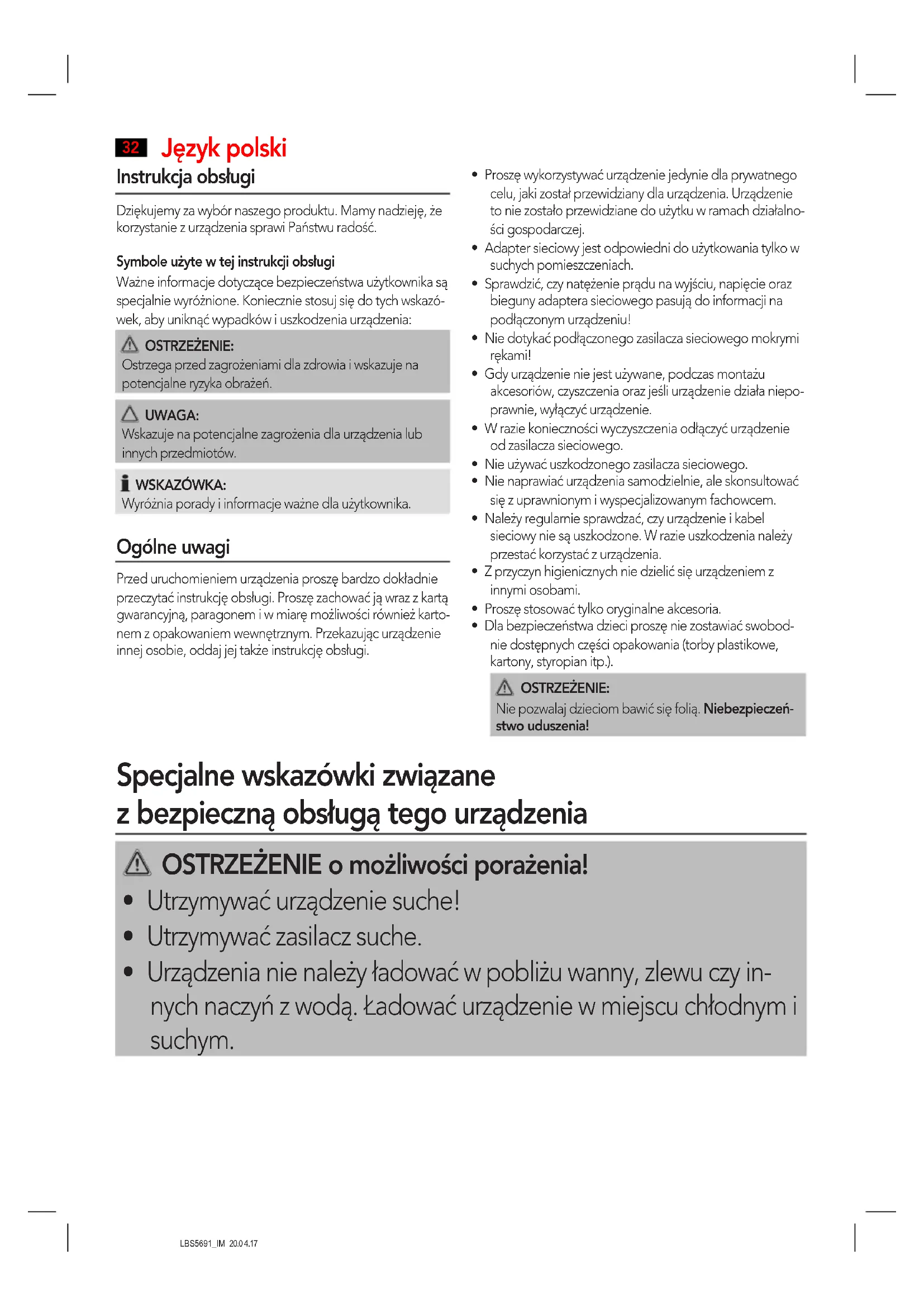 LBS5691_IM 20.0 4.17 OSTRZEŻENIE o możliwości porażenia!