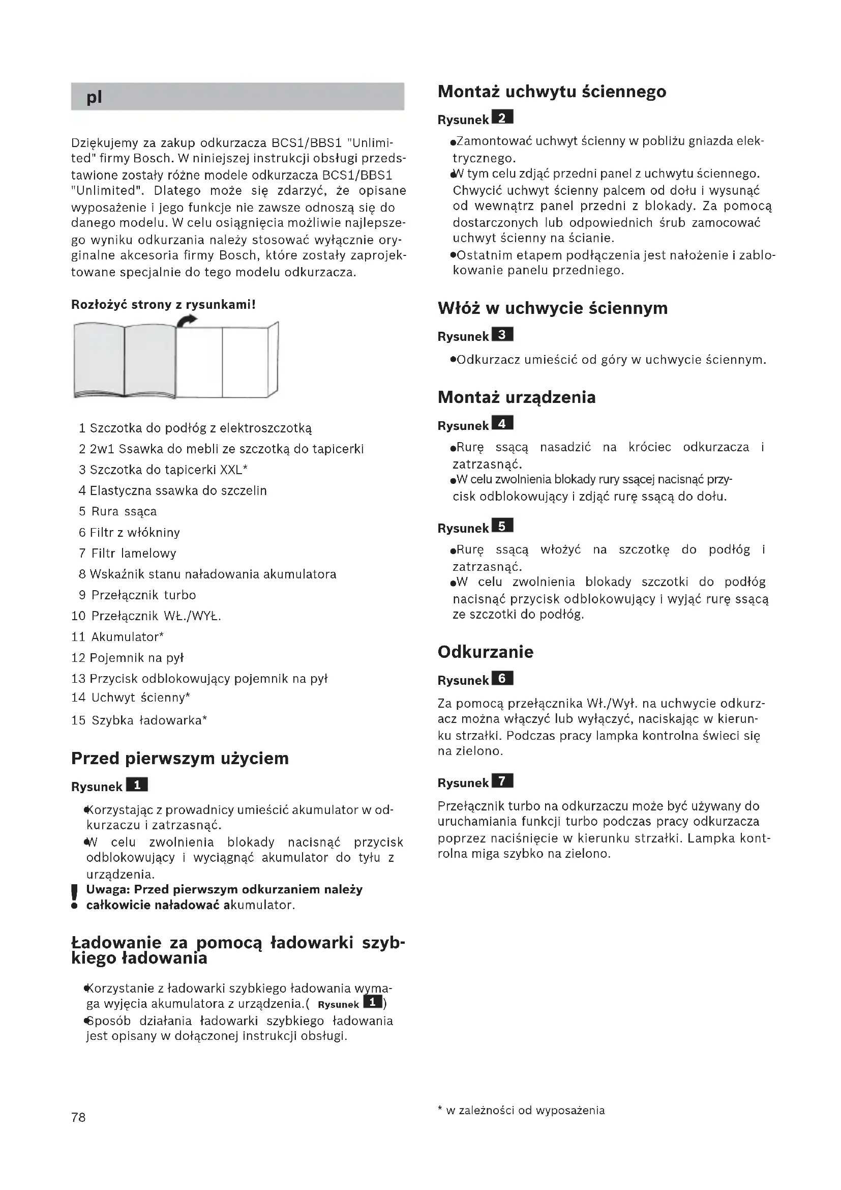 Dikkat: Aşındırıcı temizleme maddesi, cam temizleyici veya çok amaçlı temizleyiciler kullanılmamalıdır. Süpürgeyi kesinlikle suya sokmayınız. Teknik değişiklik yapma hakkı saklıdır. Pil durumu göstergesi Çalışma durumu Fonksiyon durum gös- tergesi Normal mod Gösterge yeşil yanar Turbo modu Gösterge hızla yeşil yanıp söner Akü şarjı < %20 Gösterge yavaşça kırmızı yanıp söner Akü boş Gösterge söner Aşırı yüksek / düşük sıcaklık koruması Gösterge kırmızı yanar ve yaklaşık 10 dakika sonra söner. *cihaz donanımına bağlıdır78 Dziękujemy za zakup odkurzacza BCS1/BBS1 "Unlimi- ted" firmy Bosch. W niniejszej instrukcji obsługi przeds- tawione zostały różne modele odkurzacza BCS1/BBS1 "Unlimited". Dlatego może się zdarzyć, że opisane wyposażenie i jego funkcje nie zawsze odnoszą się do danego modelu. W celu osiągnięcia możliwie najlepsze- go wyniku odkurzania należy stosować wyłącznie ory- ginalne akcesoria firmy Bosch, które zostały zaprojek- towane specjalnie do tego modelu odkurzacza. Rozłożyć strony z rysunkami! 1 Szczotka do podłóg z elektroszczotką 2 2w1 Ssawka do mebli ze szczotką do tapicerki 3 Szczotka do tapicerki XXL* 4 Elastyczna ssawka do szczelin 5 Rura ssąca 6 Filtr z włókniny 7 Filtr lamelowy 8 Wskaźnik stanu naładowania akumulatora 9 Przełącznik turbo 10 Przełącznik WŁ./WYŁ. 11 Akumulator* 12 Pojemnik na pył 13 Przycisk odblokowujący pojemnik na pył 14 Uchwyt ścienny* 15 Szybka ładowarka* Przed pierwszym użyciem Rysunek