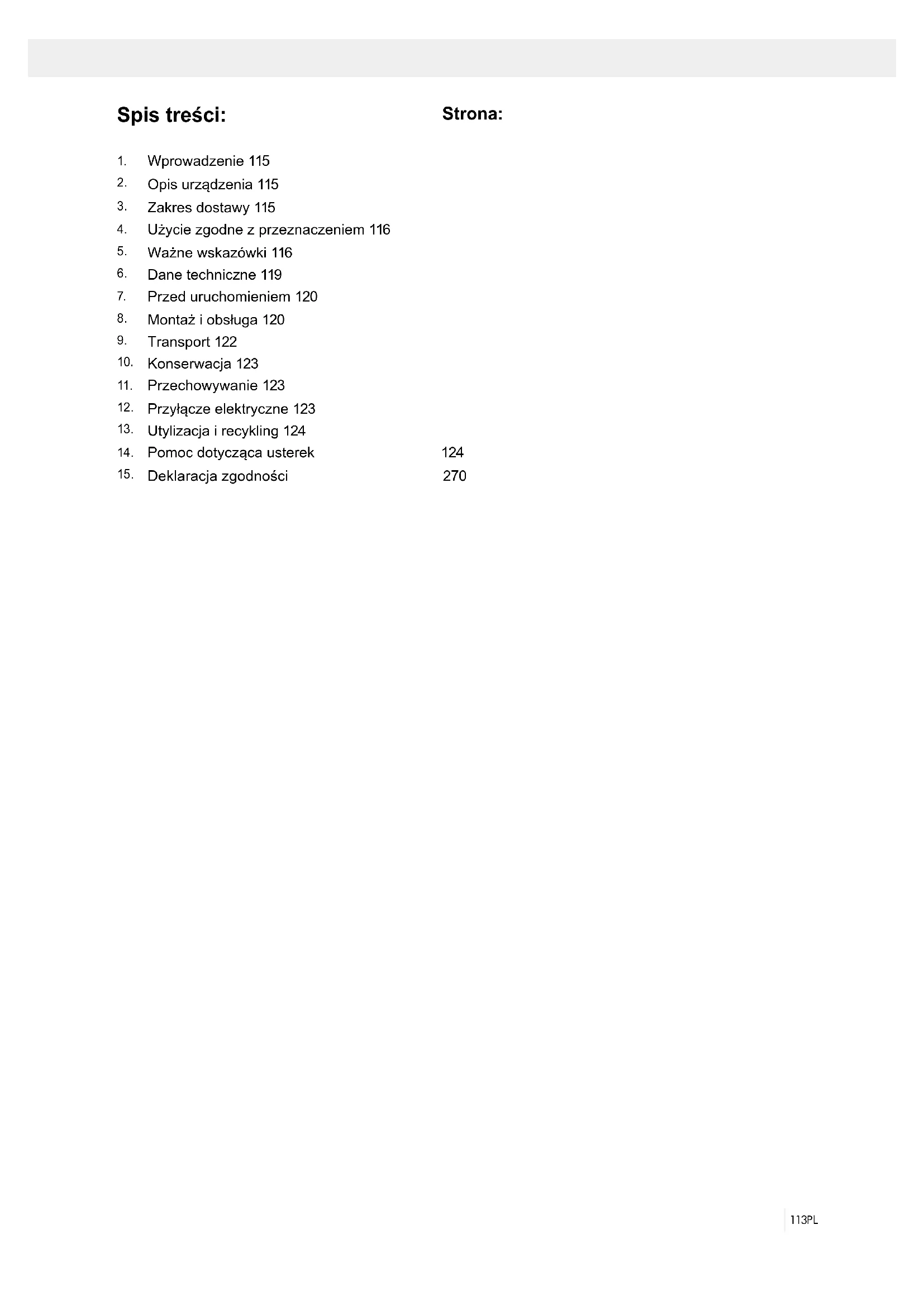 Podczas transportu, aby zapobiec uszkodzeniom, urzą- dzenie znajduje się w opakowaniu. Opakowanie to jest surowcem, który można użytkować ponownie lub moż- na przeznaczyć do powtórnego przerobu. Urządzenie oraz jego osprzęt składają się z różnych rodzajów ma- teriałów, jak np. metal i tworzywa sztuczne. Nigdy nie wyrzucać baterii do śmieci, nie wrzucać do ognia lub do wody. Baterie należy zbierać i poddawać recyklingowi lub utylizować w sposób przyjazny dla środowiska. Uszkodzone części dostarczyć do punktu utylizacji. Proszę poprosić o informację w sklepie specjalistycz- nym bądź w placówce samorządu lokalnego.125GR/CY Περιεχόμενα:
