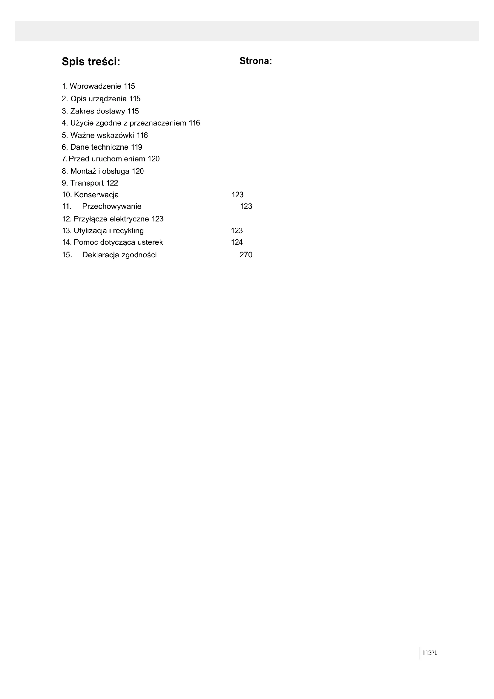 Usterka Możliwa przyczyna Pomoc Silnik nie działa Silnik, kabel lub wtyczka uszkodzone, przepa- lone bezpieczniki Zlecić sprawdzenie maszyny specjaliście. Nigdy nie próbować naprawiać silnika samodzielnie. Zagroże- nie! Sprawdzić bezpieczniki, ew. wymienić Silnik uruchamia się powoli i nie osiąga pręd- kości roboczej. Napięcie zbyt niskie, zwoje uszkodzone, kon- densator przepalony Zlecić sprawdzenie napięcia przez zakład energe- tyczny. Zlecić sprawdzenie silnika przez specjalistę. Zlecić wymianę kondensatora przez specjalistę Silnik emituje zbyt duży hałas Zwoje uszkodzone, silnik uszkodzony Zlecić sprawdzenie silnika przez specjalistę Silnik nie osiąga całko- witej mocy. Obwody prądowe w instalacji sieciowej prze- ciążone (lampy, inne silniki, itp.) Nie stosować innych urządzeń lub silników w tym samym obwodzie prądowym Silnik łatwo się prze- grzewa. Przeciążenie silnika, niedostateczne chłodze- nie silnika Zapobiegać przeciążeniu silnika podczas ciecia, usuwać pył z silnika, w celu zagwarantowania opty- malnego chłodzenia silnika Zmniejszona wydajność podczas cięcia Brzeszczot piły zbyt mały (za często szlifowa- ny) Ustawić ponownie ogranicznik końcowy agregatu pilarki Cięcie jest szorstkie lub falowane Brzeszczot piły tępy, forma zębów nieprawidło- wa dla grubości materiału Naostrzyć brzeszczot piły lub użyć odpowiedniego brzeszczotu Element obrabiany roz- rywa się lub rozpryskuje Docisk cięcia zbyt duży lub brzeszczot nie nadaje się do zastosowania Włożyć odpowiedni brzeszczot piły125GR/CY Περιεχόμενα: