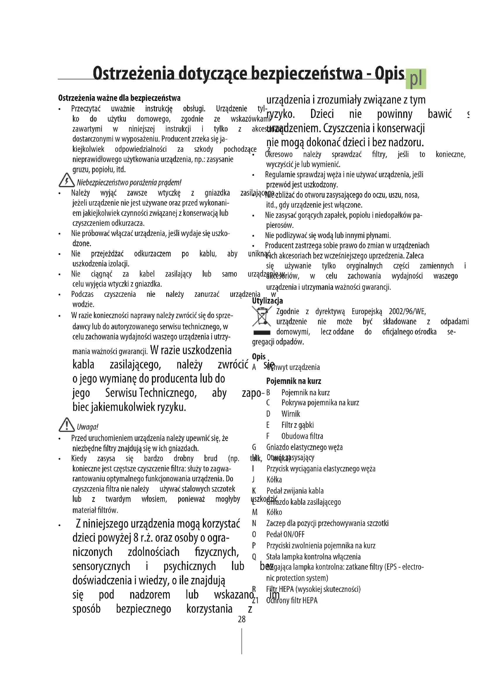 Zgodnie z dyrektywą Europejską 2002/96/WE, urządzenie nie może być składowane z odpadami domowymi, leczoddane do ocjalnegoośrodka se- gregacjiodpadów. Opis A Uchwyturządzenia Pojemnik na kurz B Pojemniknakurz C Pokrywapojemnikanakurz D Wirnik E Filtrzgąbki F Obudowaltra G Gniazdoelastycznegowęża H Otwórzasysający I Przyciskwyciąganiaelastycznegowęża J Kółka K Pedałzwijaniakabla L Gniazdokablazasilającego M Kółko N Zaczepdlapozycjiprzechowywaniaszczotki O PedałON/OFF P Przyciskizwolnieniapojemnikanakurz Q Stałalampkakontrolnawłączenia Migającalampkakontrolna:zatkaneltry(EPS-electro- nicprotectionsystem) R FiltrHEPA(wysokiejskuteczności) Z1 OchronyltrHEPA pl29 Uchwyt S Uchwyt T Elastycznywąż U Połączenieotworuzasysającego V Rurateleskopowa W Suwakruryteleskopowej Akcesoria X Szczotkawielofunkcyjna Y Nasadka“T” Z Nasadkaszczelinówka Pierwsze użytkowanie (str. 40) Przedrozpoczęciemużywaniaurządzenia,należyusunąćwszy- stkieelementyzabezpieczającepojemniknakurzB. Użytkowanie urządzenia (str. 41) Wyregulować długość rury teleskopowej, nałożyć najodpowiedniejsządożądanegoczyszczenianasadkę,włączyć urządzenie. EPS - Electronic protection system (elektroniczny sy- stem zabezpieczający) SystemEPSaktywujesię,kiedyzatkanesąltry,cowidoczne jestpoprzezmiganielampkikontrolnejQ. Wprzypadkudłuższegostosowaniaurządzenia,powłączeniu się tego wskaźnika, moc urządzenia automatycznie się zm- niejsza: jest to urządzenie zabezpieczające przed uszkodze- niami silnika. Aby przywrócićużytkowanie, należy wyłączyć urządzeniaiwykonaćczyszczenie(Czyszczenie,str.42). Czyszczenie (str. 42) Abyzapewnićskutecznośćssania,należyczyścićltrpojemni- kanakurz,ltrHEPAiochronazakażdymrazem,gdyinterwe- niujesystemEPSlubprzynajmniejrazna6miesięcy. Przed ponownym włożeniem ltra z gąbki wirnika, należy upewnićsię,żejestoncałkowiciesuchy. Uwaga: W przypadku, gdy niezbędne jest natychmia- stowe przywrócenie działania urządzenia, należy wyszczotkować i wytrzepać ltry, bez ich mycia. Pozycja przechowywania (park system - str. 41) Jeżeli odkurzanie należy przerwać na jakiś czas, odkurzacz zostałwyposażonywsystemtrzymania węża: wsunąć ele- ment wspomagający, umieszczony na przegubie szczotki w odpowiednirowek znajdujący się na tylniej części obudowy odkurzacza. Jeśli coś nie działa... Urządzenieniewłączasię Wtyczkaniezostaławłożonado gniazdka. Włożyćwtyczkędogniazdka. Wirnikobracasiępowolilubnieobraca się Przy pierwszym użyciu jest normalną rzeczą,żewirnikobracasiępowoli. Obecnesąelementy, któreblokują wir- nik. Wyciągnąćiotworzyćpojemniknakurz: usunąć elementy, które blokują ruch i sprawdzić czy wsporniki obrotowe wewnątrz pojemnika na kurz obracają sięswobodnie. Filtrysązatkane. Wyczyścićje(str.42) nawetjeśli systemEPS jeszczeniezadziałał. Niezamykasiępokrywaodkurzacza Pojemnik na kurz nie został założony prawidłowo. Wyciągnąćiwłożyćponowniepojemnik, wyrównującgoodpowiedniowodkurzac- zu. Pojemnik włożony jest prawidłowo, kiedy, zamykając urządzenie, słyszy się “kliknięcie”zaczepu,aobaprzyciskiPsą zwolnione. Urządzenie zmniejsza moc zasysania i migalampkakontrolna Q Filtrylubelastycznywążsązatkane. Opróżnićpojemnikiwyczyścićltry. Sprawdzić czy elastyczny wąż nie jest zatkany i ewentualnie usunąć z niego przedmioty. Użytkowanie - Czyszczenie - Park system