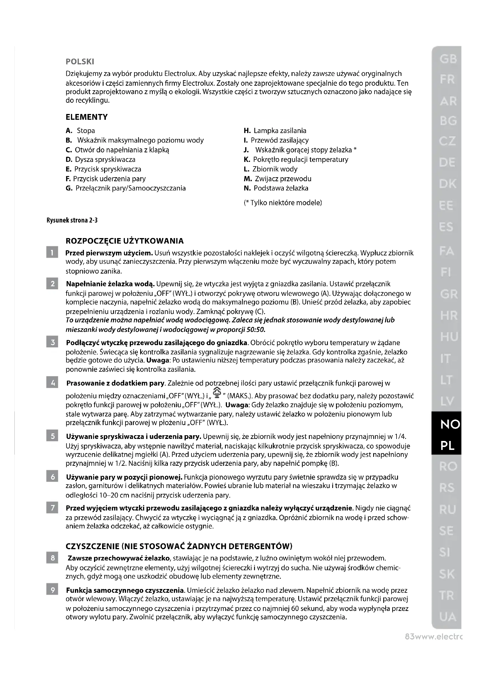 POLSKI Dziękujemy za wybór produktu Electrolux. Aby uzyskać najlepsze efekty, należy zawsze używać oryginalnych akcesoriów i części zamiennych rmy Electrolux. Zostały one zaprojektowane specjalnie do tego produktu. Ten produkt zaprojektowano z myślą o ekologii. Wszystkie części z tworzyw sztucznych oznaczono jako nadające się do recyklingu. ELEMENTY A. Stopa B. Wskaźnik maksymalnego poziomu wody C. Otwór do napełniania z klapką D. Dysza spryskiwacza E. Przycisk spryskiwacza F. Przycisk uderzenia pary G. Przełącznik pary/Samooczyszczania H. Lampka zasilania