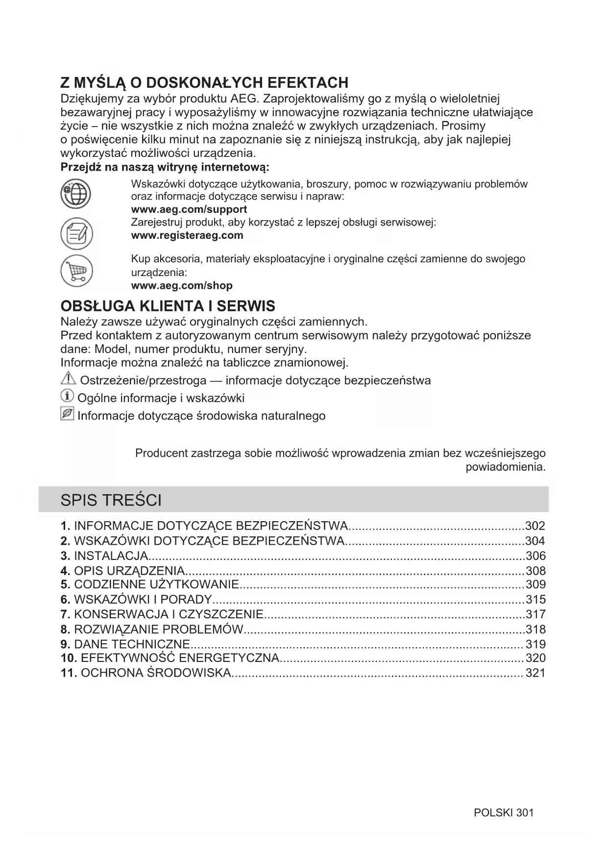 Resirkuler materialer som er merket med symbolet . Legg emballasjen i riktige beholdere for å resirkulere det. Bidrar til å beskytte miljøet, menneskers helse og for å resirkulere avfall av elektriske og elektroniske produkter. Ikke kast produkter som er merket med symbolet sammen med husholdningsavfallet. Produktet kan leveres der hvor tilsvarende produkt selges eller på miljøstasjonen i kommunen. Kontakt kommunen for nærmere opplysninger. 300 NORSKZ MYŚLĄ O DOSKONAŁYCH EFEKTACH Dziękujemy za wybór produktu AEG. Zaprojektowaliśmy go z myślą o wieloletniej bezawaryjnej pracy i wyposażyliśmy w innowacyjne rozwiązania techniczne ułatwiające życie – nie wszystkie z nich można znaleźć w zwykłych urządzeniach. Prosimy o poświęcenie kilku minut na zapoznanie się z niniejszą instrukcją, aby jak najlepiej wykorzystać możliwości urządzenia. Przejdź na naszą witrynę internetową: Wskazówki dotyczące użytkowania, broszury, pomoc w rozwiązywaniu problemów oraz informacje dotyczące serwisu i napraw: www.aeg.com/support Zarejestruj produkt, aby korzystać z lepszej obsługi serwisowej: www.registeraeg.com Kup akcesoria, materiały eksploatacyjne i oryginalne części zamienne do swojego urządzenia: www.aeg.com/shop