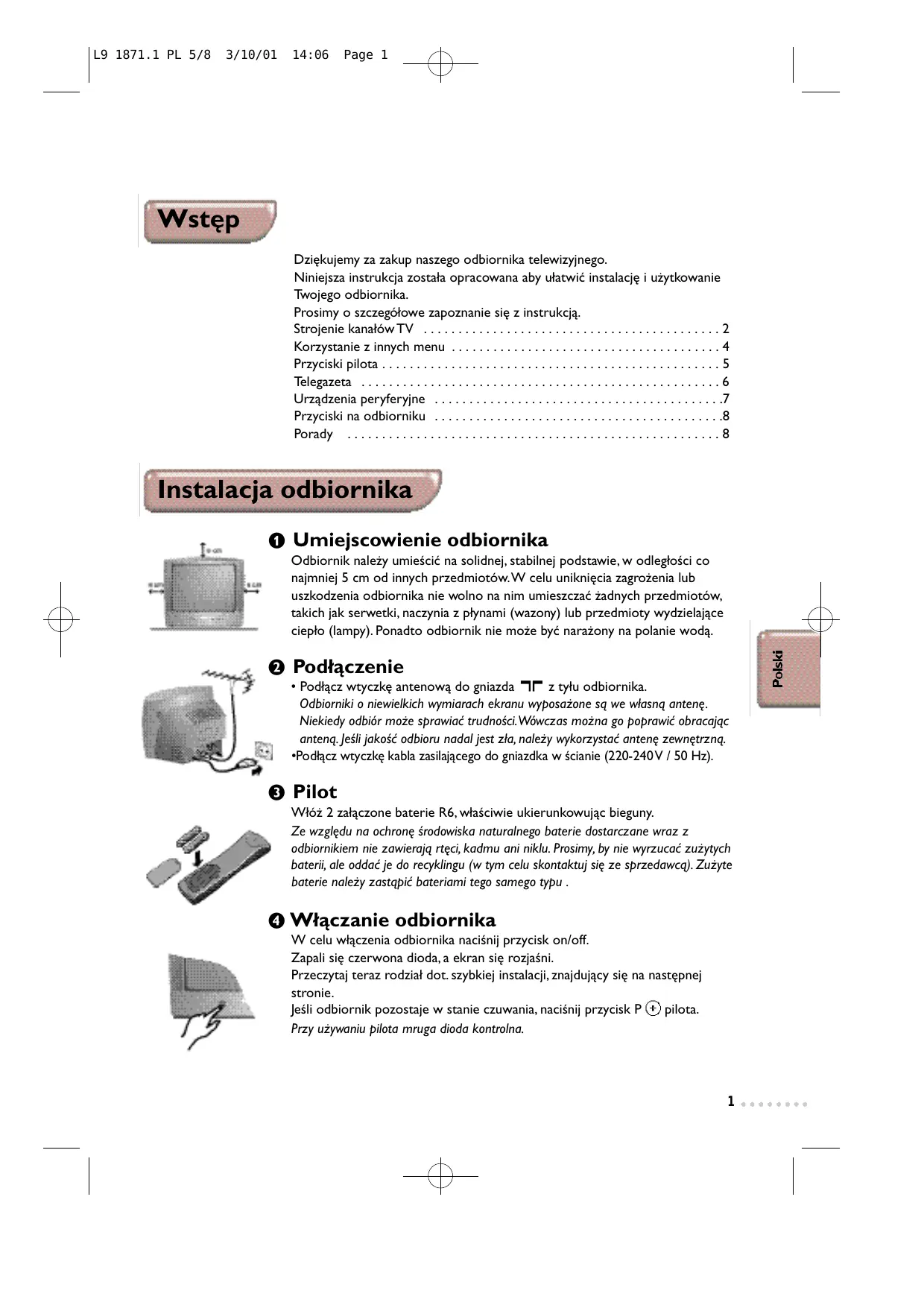 Wstęp Dziękujemy za zakup naszego odbiornika telewizyjnego. Niniejsza instrukcja została opracowana aby ułatwić instalację i użytkowanie Twojego odbiornika. Prosimy o szczegółowe zapoznanie się z instrukcją. Strojenie kanałów TV . . . . . . . . . . . . . . . . . . . . . . . . . . . . . . . . . . . . . . . . . . . 2 Korzystanie z innych menu . . . . . . . . . . . . . . . . . . . . . . . . . . . . . . . . . . . . . . . 4 Przyciski pilota . . . . . . . . . . . . . . . . . . . . . . . . . . . . . . . . . . . . . . . . . . . . . . . . . 5 Telegazeta . . . . . . . . . . . . . . . . . . . . . . . . . . . . . . . . . . . . . . . . . . . . . . . . . . . . 6 Urządzenia peryferyjne . . . . . . . . . . . . . . . . . . . . . . . . . . . . . . . . . . . . . . . . . .7 Przyciski na odbiorniku . . . . . . . . . . . . . . . . . . . . . . . . . . . . . . . . . . . . . . . . . .8 Porady . . . . . . . . . . . . . . . . . . . . . . . . . . . . . . . . . . . . . . . . . . . . . . . . . . . . . . 8