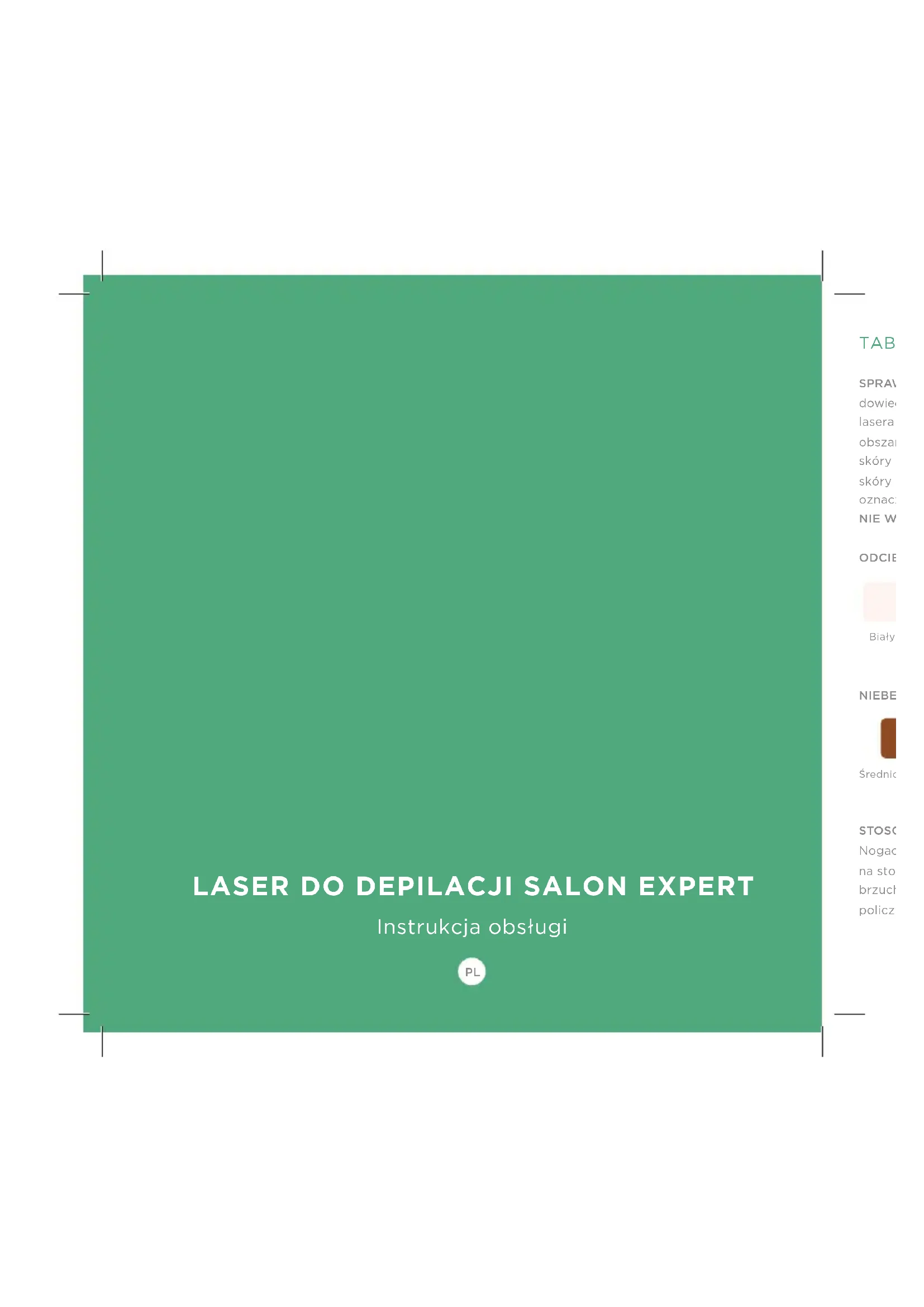 (PRZECIWWSKAZANIA) Lasera Tria NIE WOLNO używać, jeśli odcień skóry jest zgodny z dowolnym odcieniem wskazanym w znajdującej się na wewnętrznej stronie przedniej okładki Tabeli odcieni skóry jako „Niebezpieczny”. W przypadku stosowania lasera Tria na skórze określanej jako "Niebezpieczna" do depilacji, skóra może wchłonąć zbyt dużo światła lasera, co prowadzi do powstawania obrażeń (oparzenia, odbarwienia lub blizny). UWAGA: Czujnik skóry jest zabezpieczeniem, które odblokowuje laser Tria. Jeśli używanie go jest dla kogoś niebezpieczne, nie będzie można odblokować go czujnikiem skóry. Lasera Tria NIE WOLNO UŻYWAĆ osobom poniżej 18 roku życia. Nie wolno go też stosować u osób, które nie ukończyły 18 lat. Korzystanie z lasera Tria przez dzieci lub u dzieci nie zostało zbadane i może spowodować poważne obrażenia. Lasera Tria NIE POWINNY używać osoby, które mają jaśniejszy kolor włosów, np. blond, biały, rudy lub siwy. Aby laser był skuteczny, trzeba mieć naturalnie ciemne włosy w miejscach jego stosowania. Jaśniejsze pigmenty włosów nie absorbują tyle energii lasera, aby dezaktywować mieszki włosowe. OSTRZEŻENIA NIE WOLNO stosować lasera Tria w okolicach oczu, brwi ani rzęs. Może to spowodować trwałe uszkodzenie wzroku. NIE WOLNO stosować lasera Tria jeśli Tabela odcieni skóry pokazuje, że odcień danej skóry jest nieodpowiedni. Skóra osób pochodzących z Afryki, z Indii, rdzennych mieszkańców Ameryki Północnej lub wysp Pacyfiku może mieć odcień skóry, na której nie należy stosować lasera. W takim przypadku należy sprawdzić Tabelę odcieni skóry Ciemniejsze odcienie skóry mogą wchłaniać zbyt wiele światła laserowego, które może uszkodzić skórę. NIE WOLNO stosować lasera Tria na uszach, sutkach, genitaliach i wokół odbytu. Obszary te mogą mieć bardziej wrażliwą skórę, ciemniejszy odcień skóry i/lub większa gęstość włosów i stosowanie lasera Tria w tych miejscach może spowodować poważne obrażenia skóry. NIE WOLNO stosować lasera Tria na twarzy, szczęce ani szyi mężczyzny. Włosy brody mężczyzny są zbyt gęste i stosowanie lasera Tria w tych miejscach może spowodować obrażenia skóry.Tria Beauty 9392