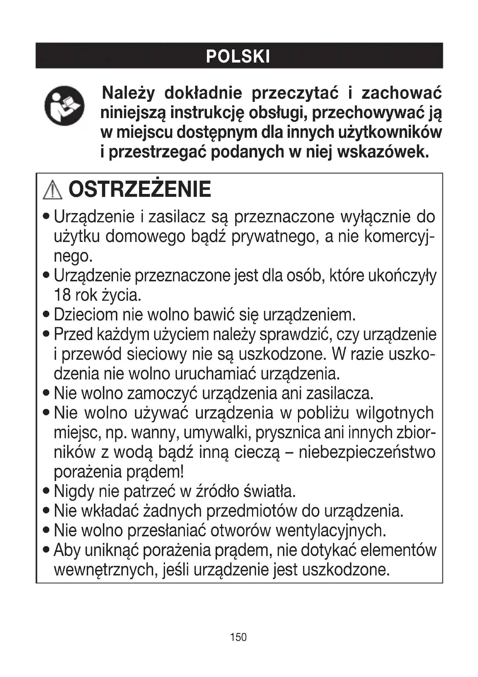 Более подробную информацию огарантии игарантийных условиях см.вприлагаемом гарантийном листе.150 POLSKI Należy dokładnie przeczytać i zachować niniejszą instrukcję obsługi, przechowywać ją w miejscu dostępnym dla innych użytkowników i przestrzegać podanych w niej wskazówek. OSTRZEŻENIE