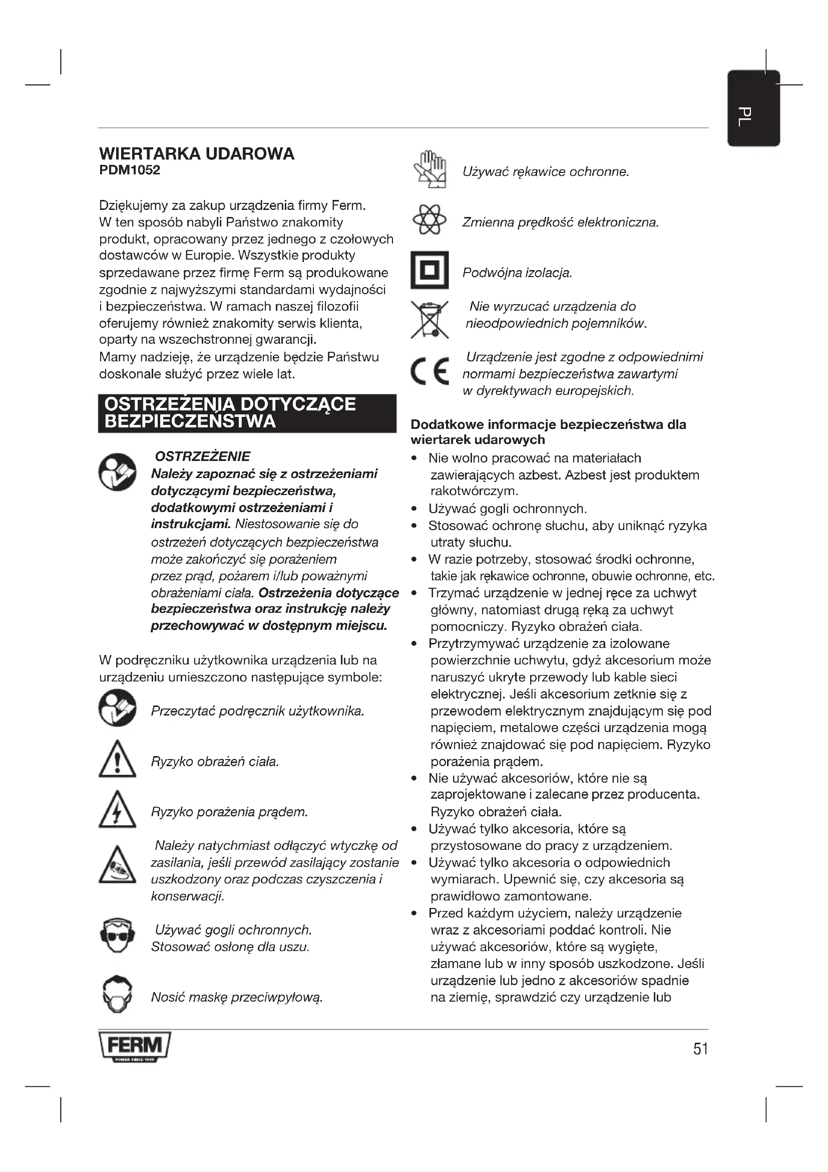 WIERTARKA UDAROWA PDM1052 Dziękujemy za zakup urządzenia firmy Ferm. W ten sposób nabyli Państwo znakomity produkt, opracowany przez jednego z czołowych dostawców w Europie. Wszystkie produkty sprzedawane przez firmę Ferm są produkowane zgodnie z najwyższymi standardami wydajności i bezpieczeństwa. W ramach naszej filozofii oferujemy również znakomity serwis klienta, oparty na wszechstronnej gwarancji. Mamy nadzieję, że urządzenie będzie Państwu doskonale służyć przez wiele lat.
