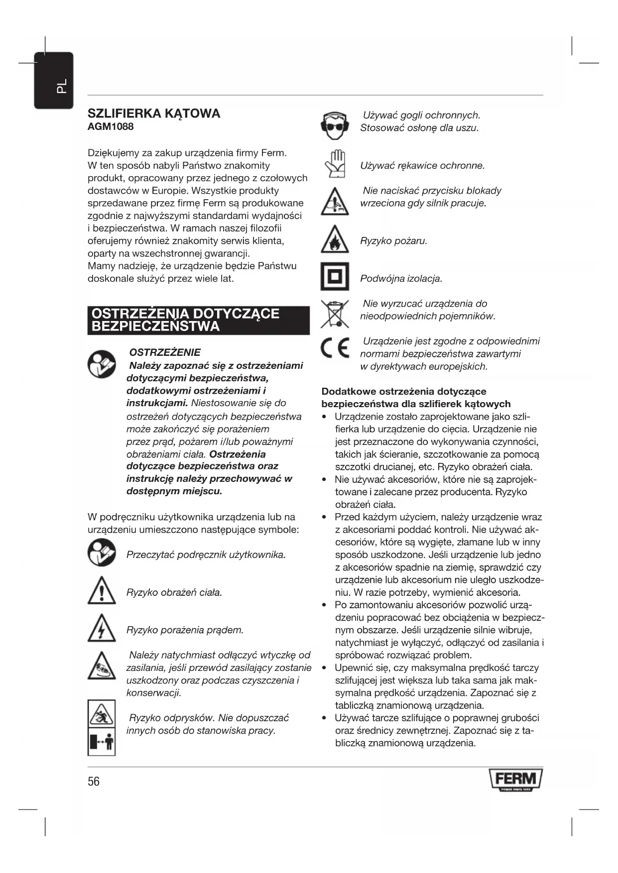 AGM1088 Dziękujemy za zakup urządzenia firmy Ferm. W ten sposób nabyli Państwo znakomity produkt, opracowany przez jednego z czołowych dostawców w Europie. Wszystkie produkty sprzedawane przez firmę Ferm są produkowane zgodnie z najwyższymi standardami wydajności i bezpieczeństwa. W ramach naszej filozofii oferujemy również znakomity serwis klienta, oparty na wszechstronnej gwarancji. Mamy nadzieję, że urządzenie będzie Państwu doskonale służyć przez wiele lat.